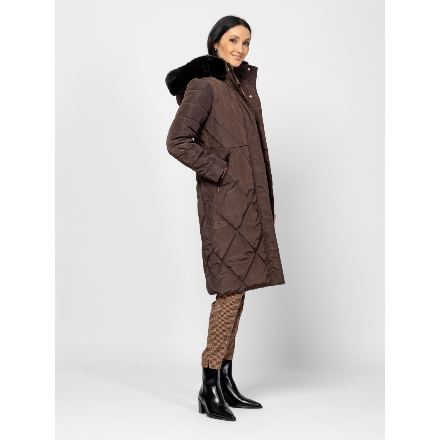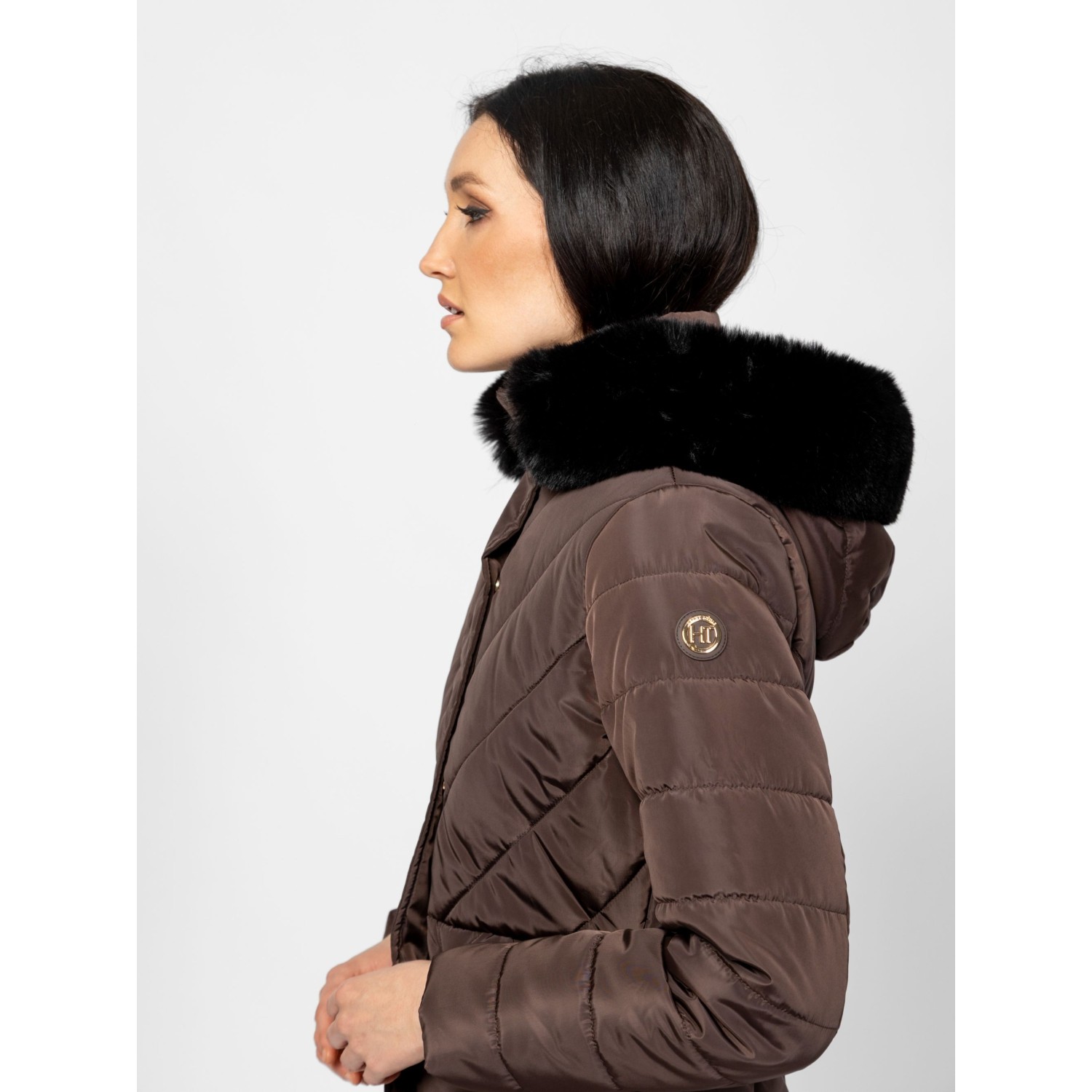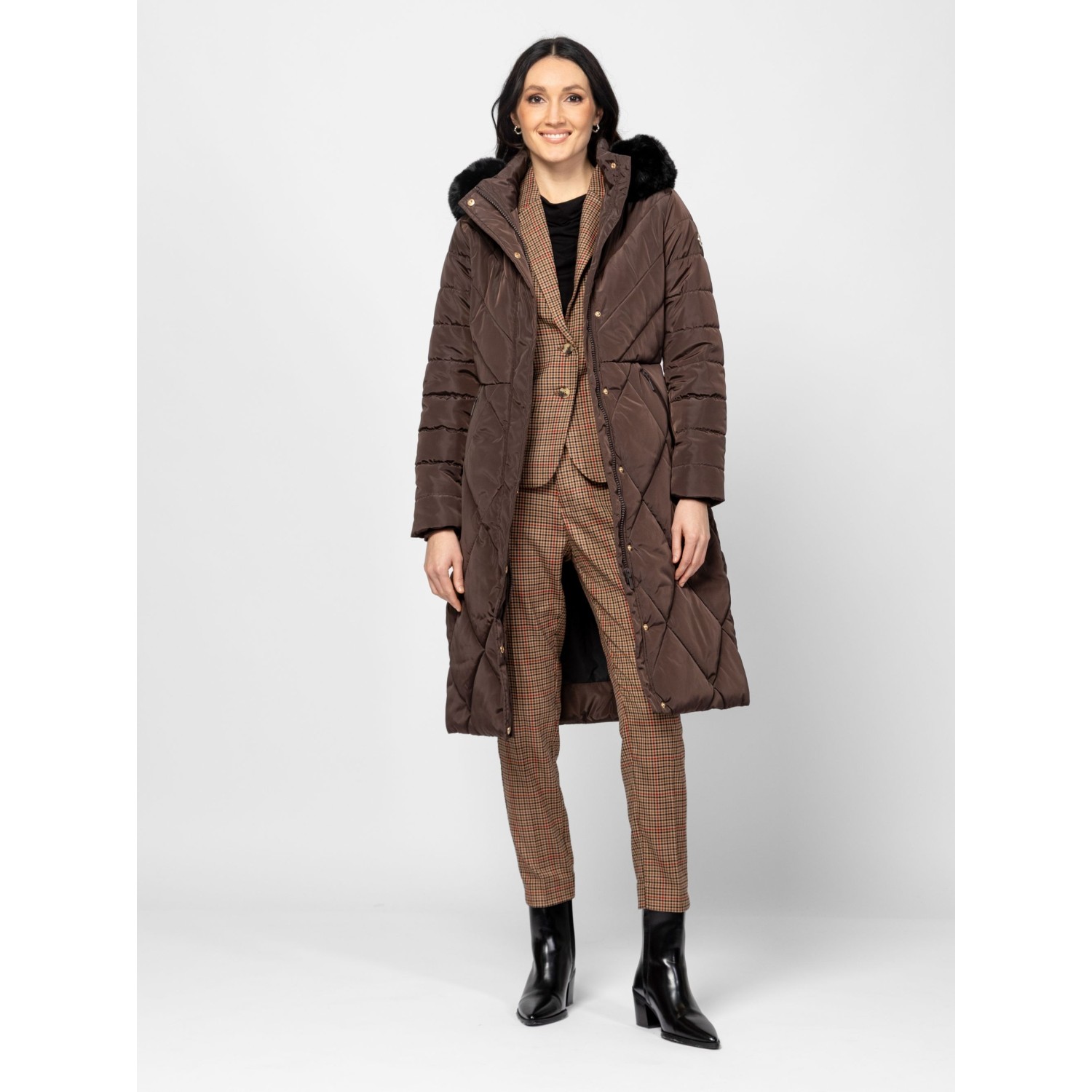 Női utcai steppelt télikabát, nőies vonalvezetéssel, térdig érő hosszal, külső szélfogóval, műszőrmével díszített levehető kapucnival, elején rejtett cipzáros zsebekkel, kis fém márkajelzésekkel az ujján és a kapucnin. Anyaga: külső: 100% nylon, bélés: 100% poliészter, tömés: 100% poliészter, szőrme gallér: 100% poliészter. A modell 175 cm magas és S-es méretet visel.