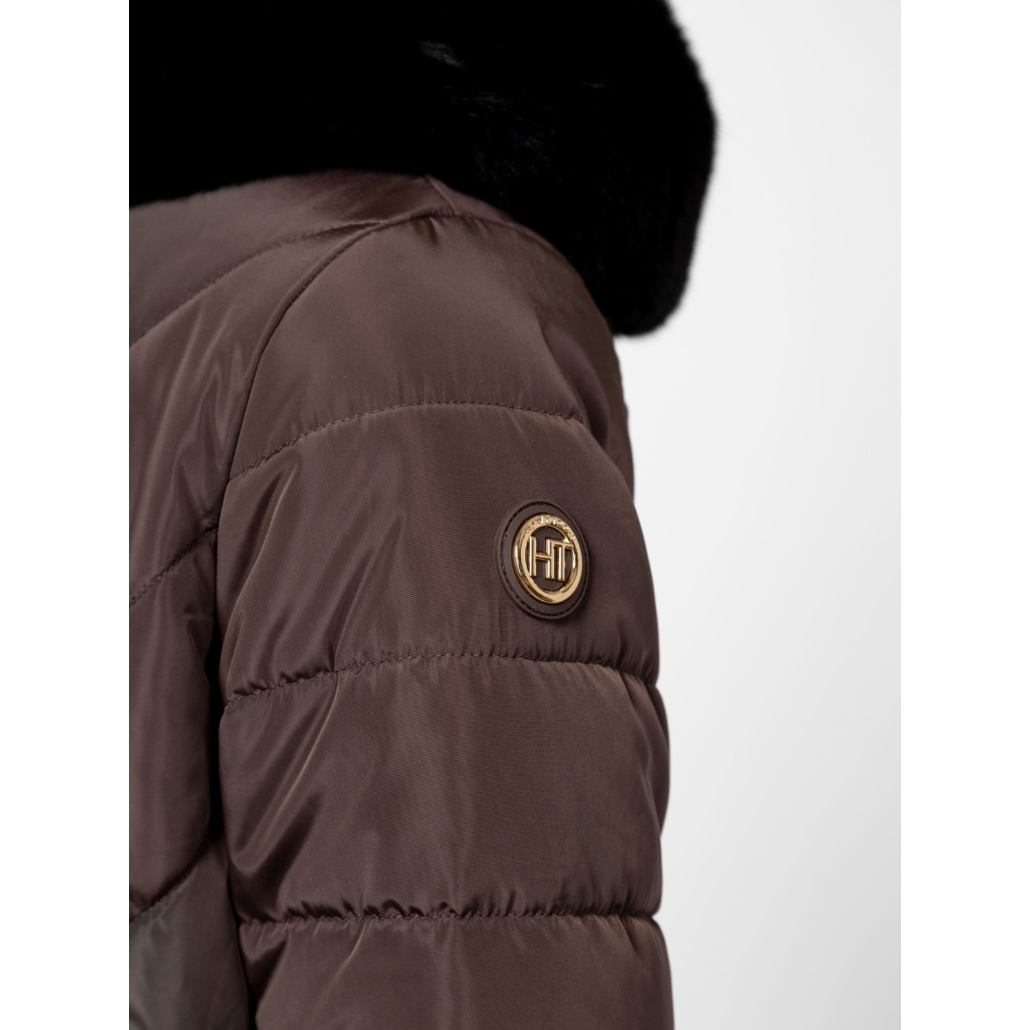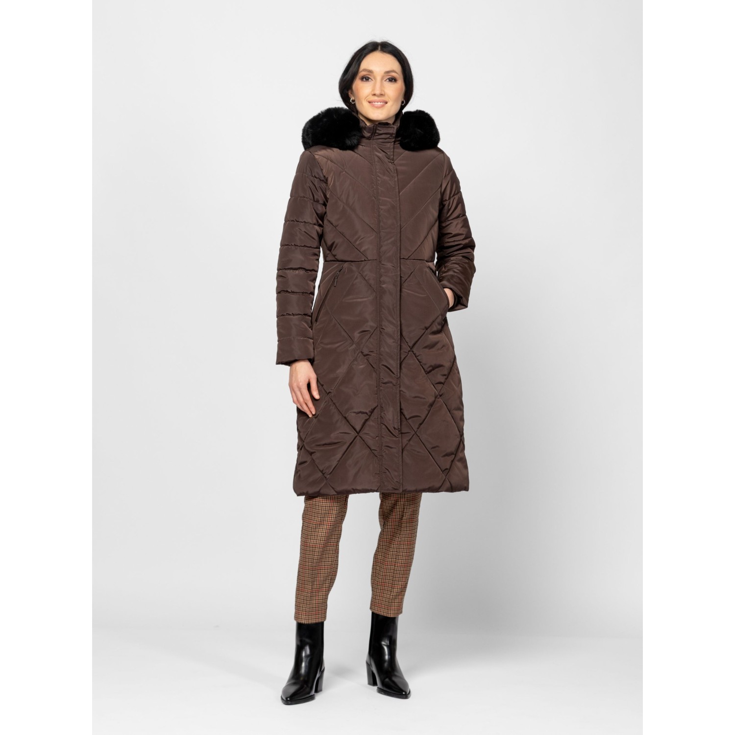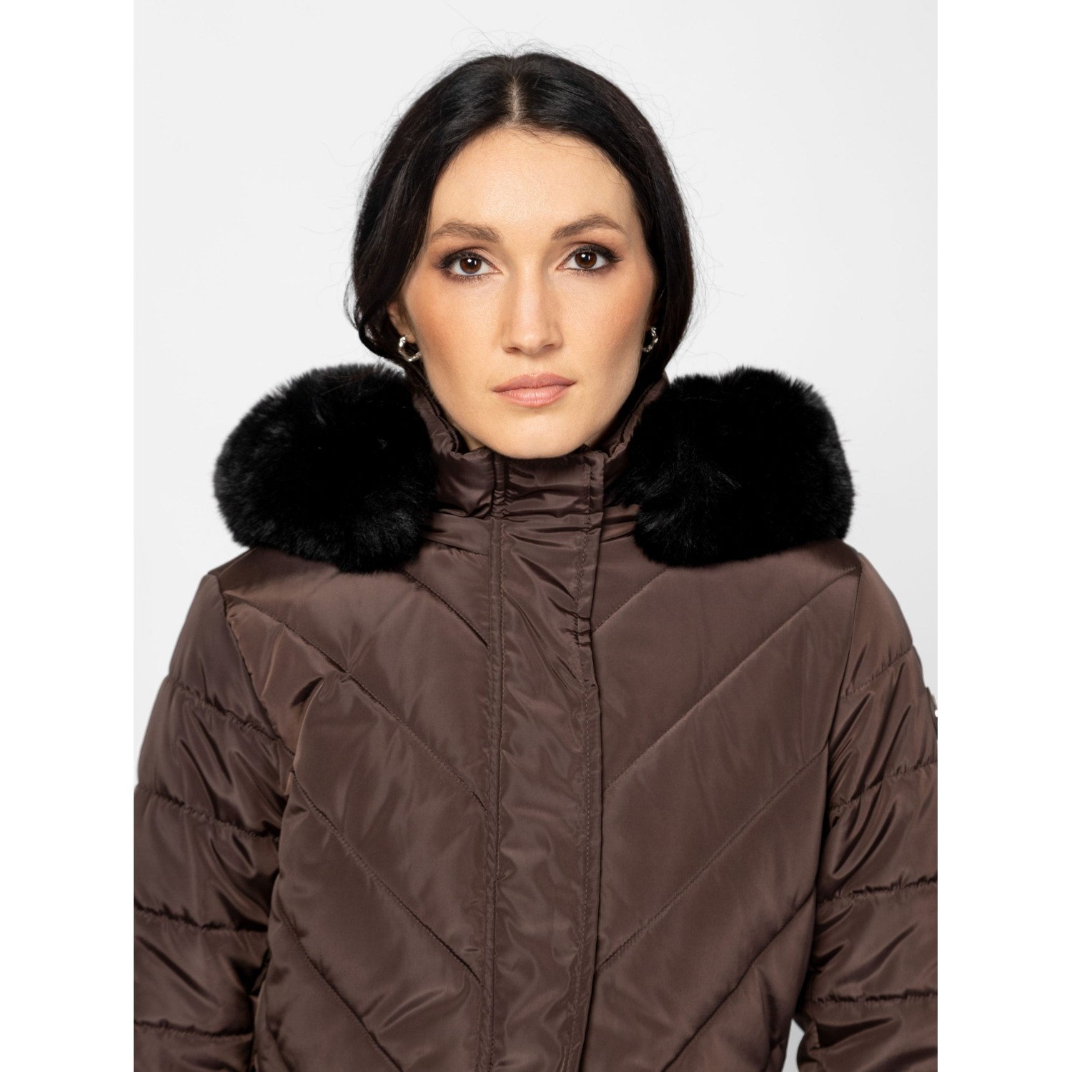 Női utcai steppelt télikabát, nőies vonalvezetéssel, térdig érő hosszal, külső szélfogóval, műszőrmével díszített levehető kapucnival, elején rejtett cipzáros zsebekkel, kis fém márkajelzésekkel az ujján és a kapucnin. Anyaga: külső: 100% nylon, bélés: 100% poliészter, tömés: 100% poliészter, szőrme gallér: 100% poliészter. A modell 175 cm magas és S-es méretet visel.