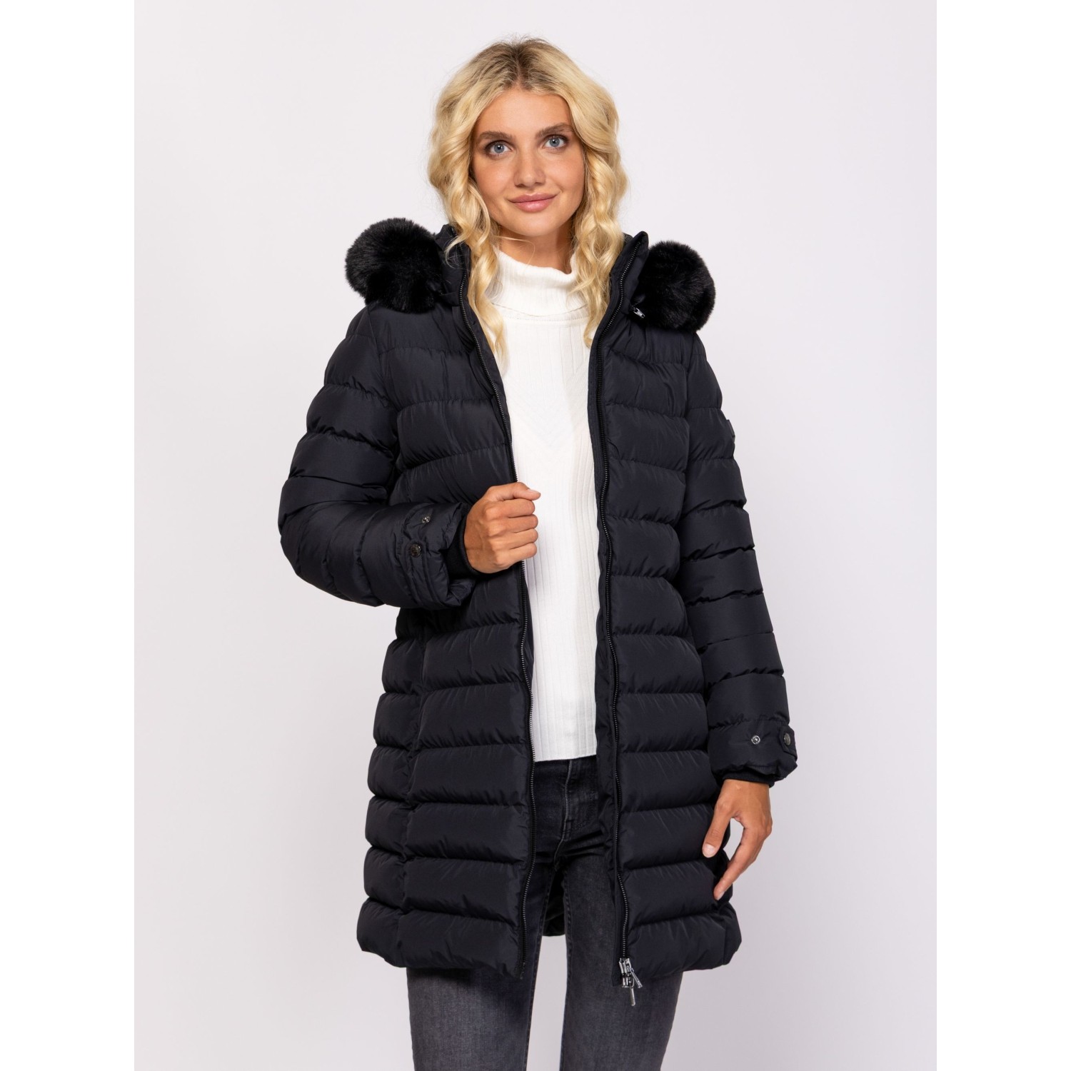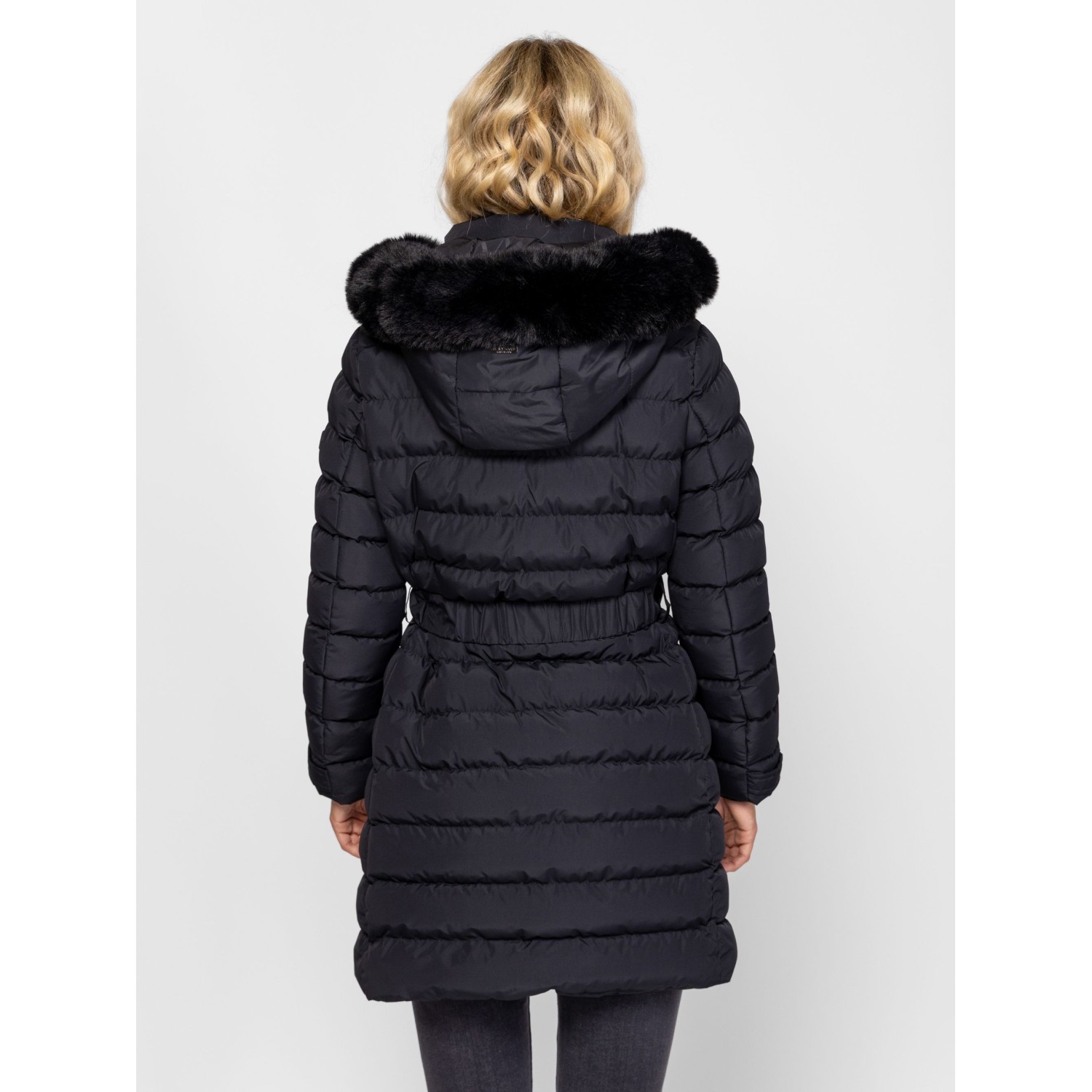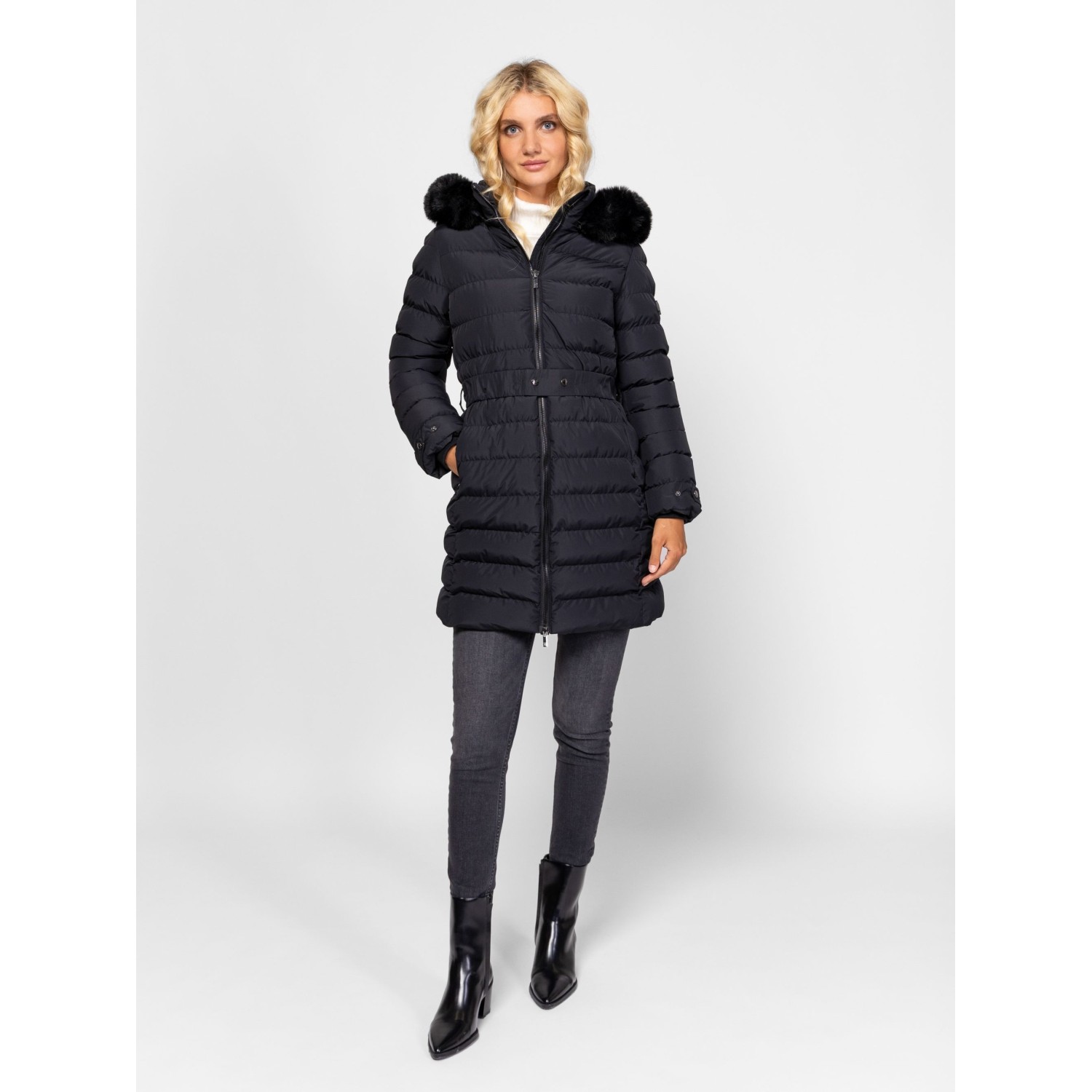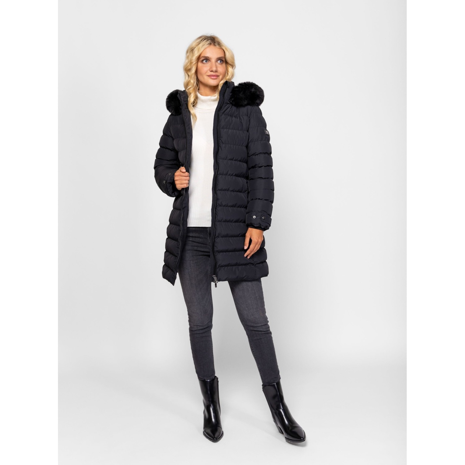 Női utcai steppelt télikabát, nőies vonalvezetéssel, térd feletti hosszal, levehető kapucnival, kapucniról levehető szőrmével, szabásvonalba helyezett, rejtett cipzáros zsebekkel, bordás passzés kézelővel, kis fém márkajelzéssel az ujján és a kapucniján. Anyaga: külső: 100% poliészter, bélés: 100% poliészter, tömés: 100% poliészter, műszőrme: 100% poliészter. A modell 175 cm magas és S-es méretet visel.