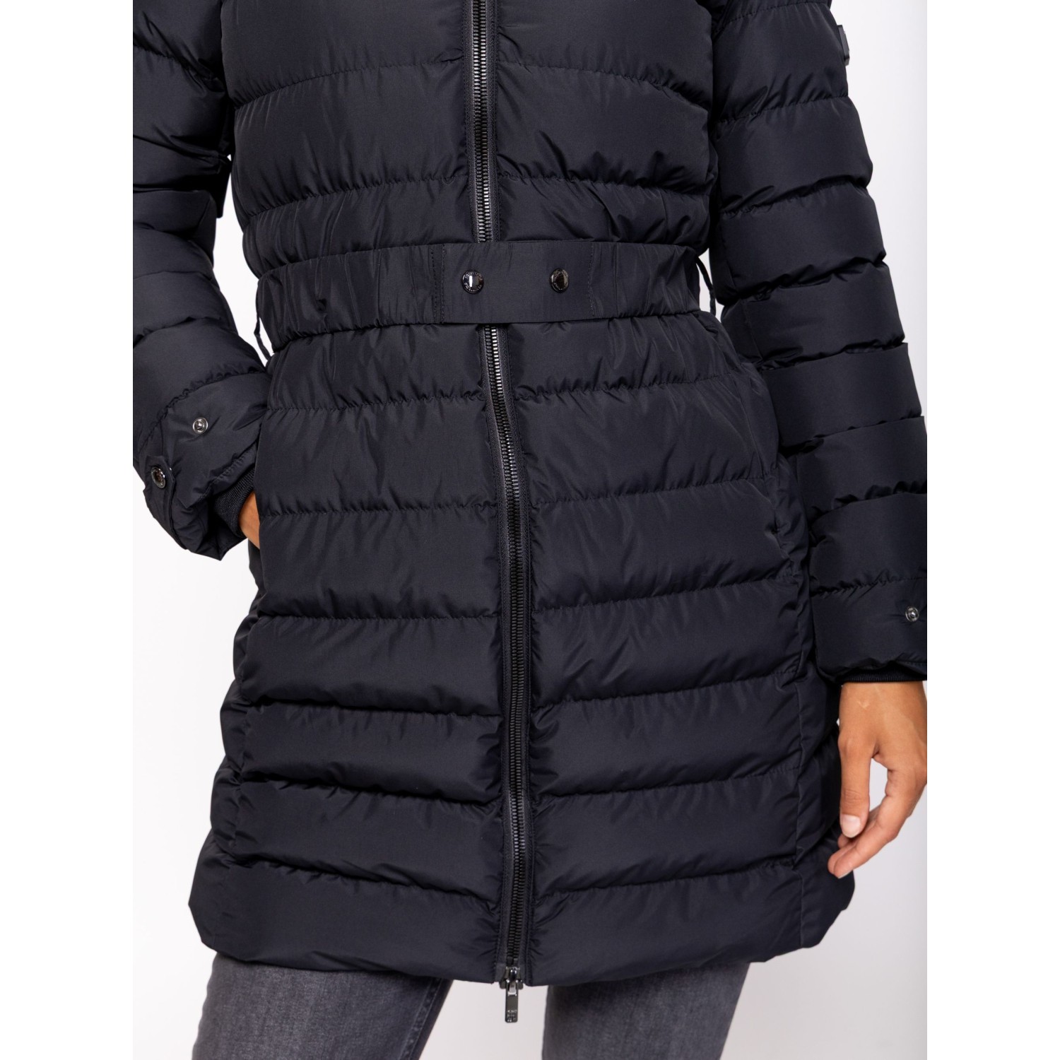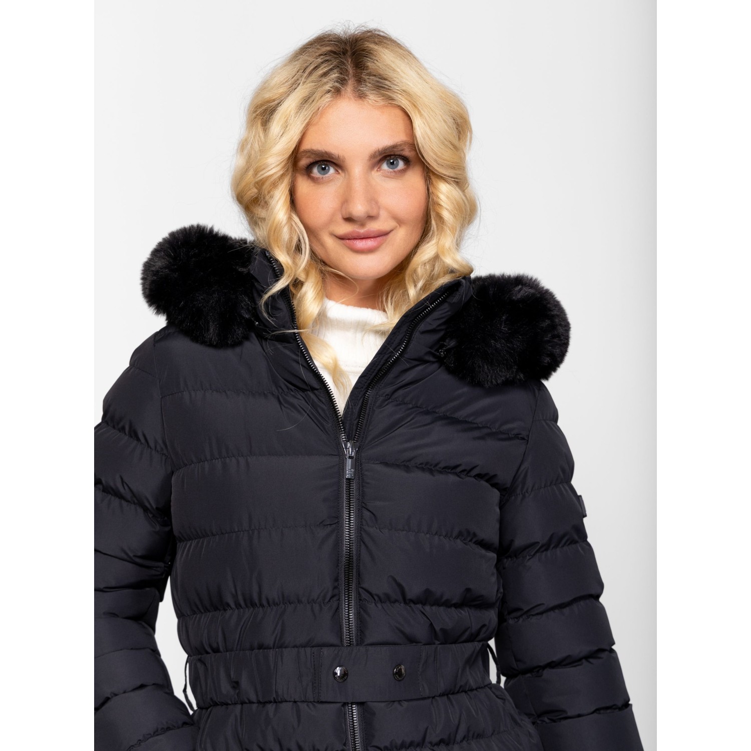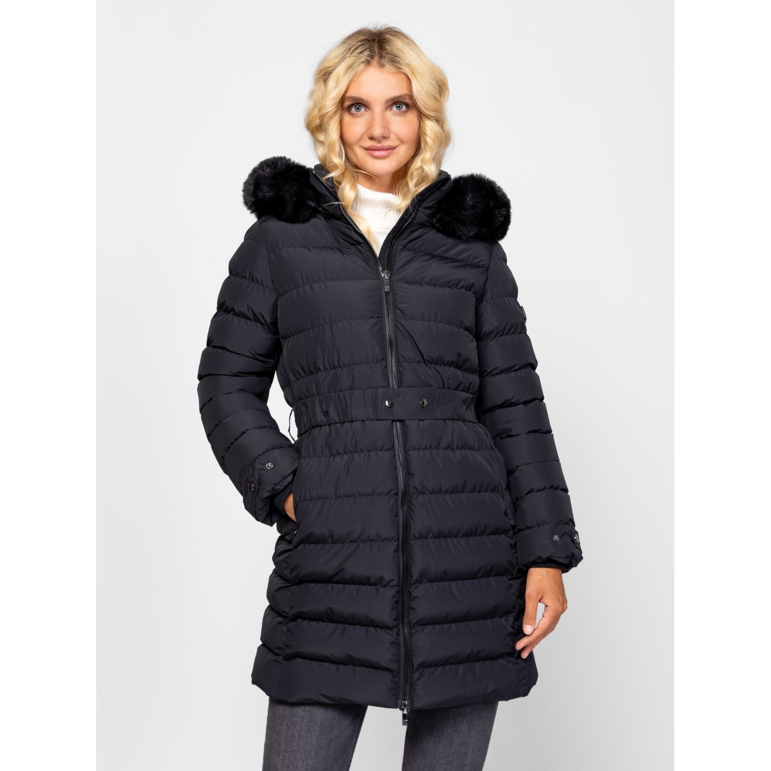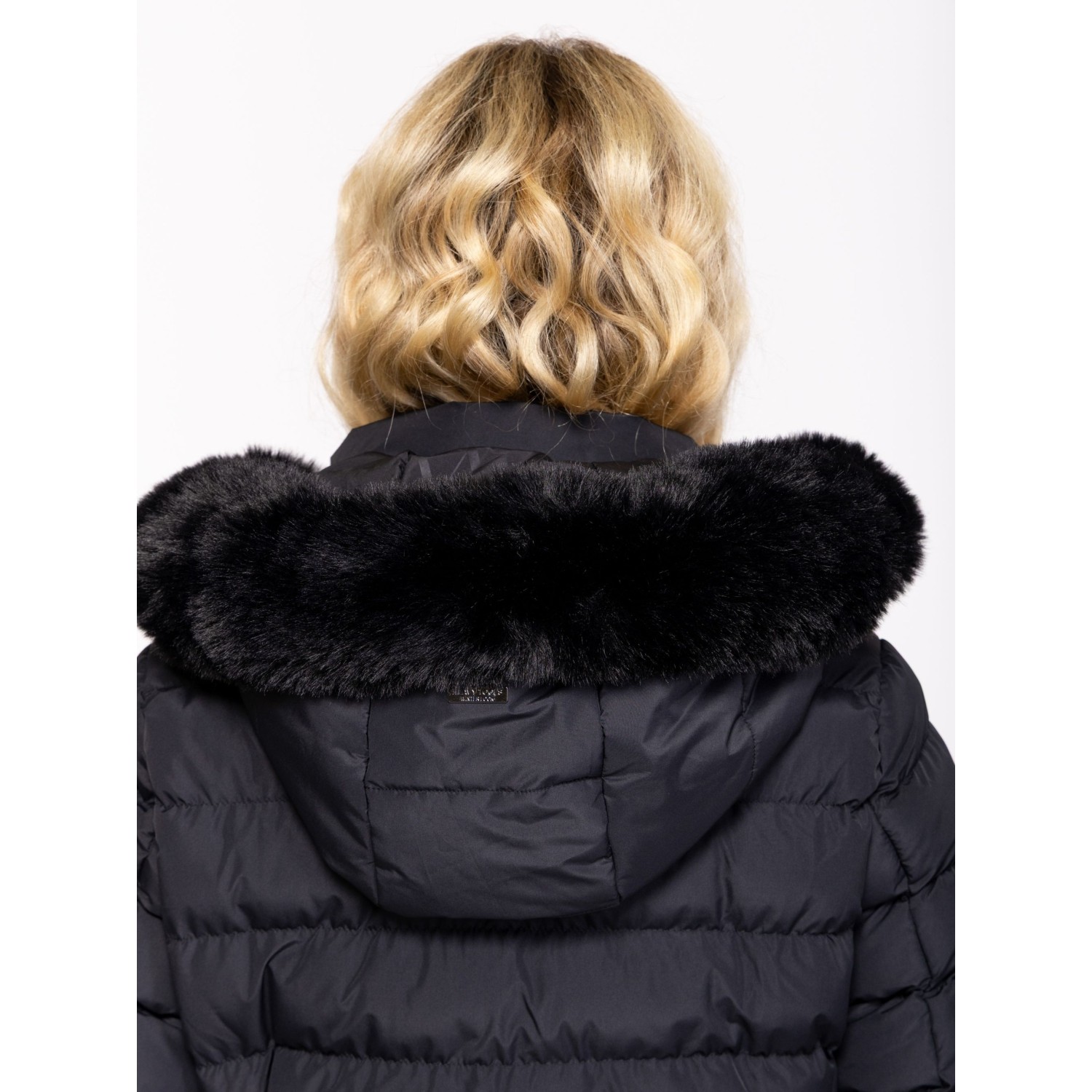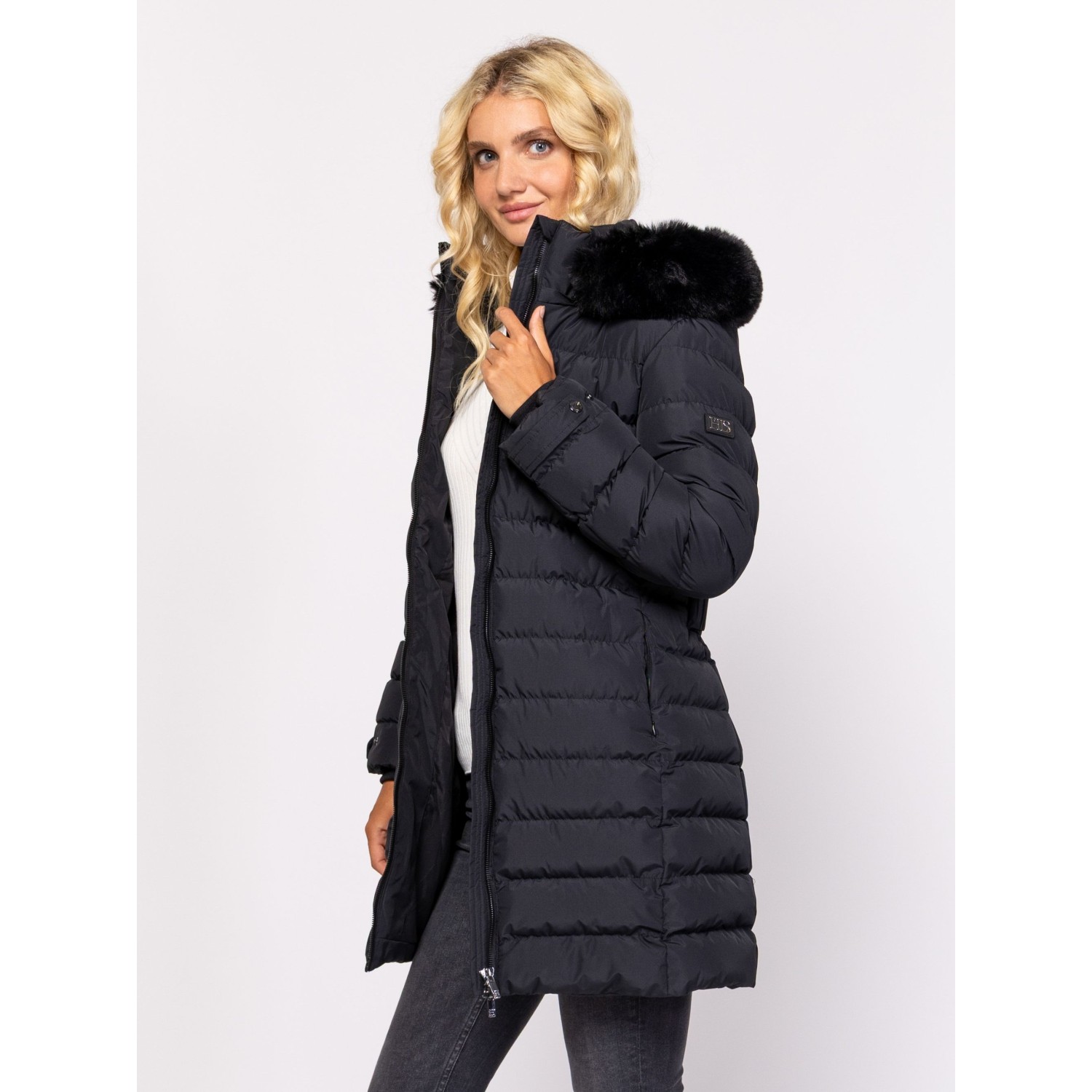 Női utcai steppelt télikabát, nőies vonalvezetéssel, térd feletti hosszal, levehető kapucnival, kapucniról levehető szőrmével, szabásvonalba helyezett, rejtett cipzáros zsebekkel, bordás passzés kézelővel, kis fém márkajelzéssel az ujján és a kapucniján. Anyaga: külső: 100% poliészter, bélés: 100% poliészter, tömés: 100% poliészter, műszőrme: 100% poliészter. A modell 175 cm magas és S-es méretet visel.