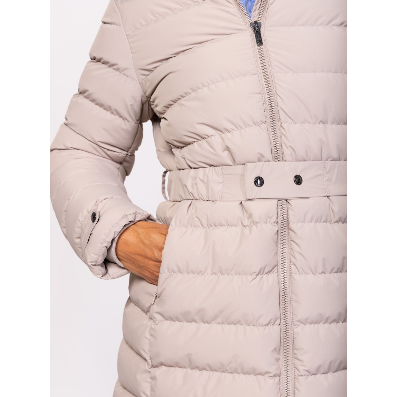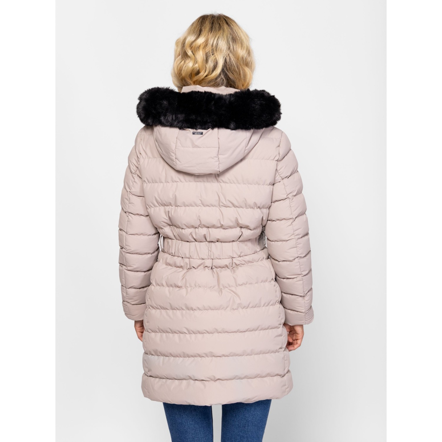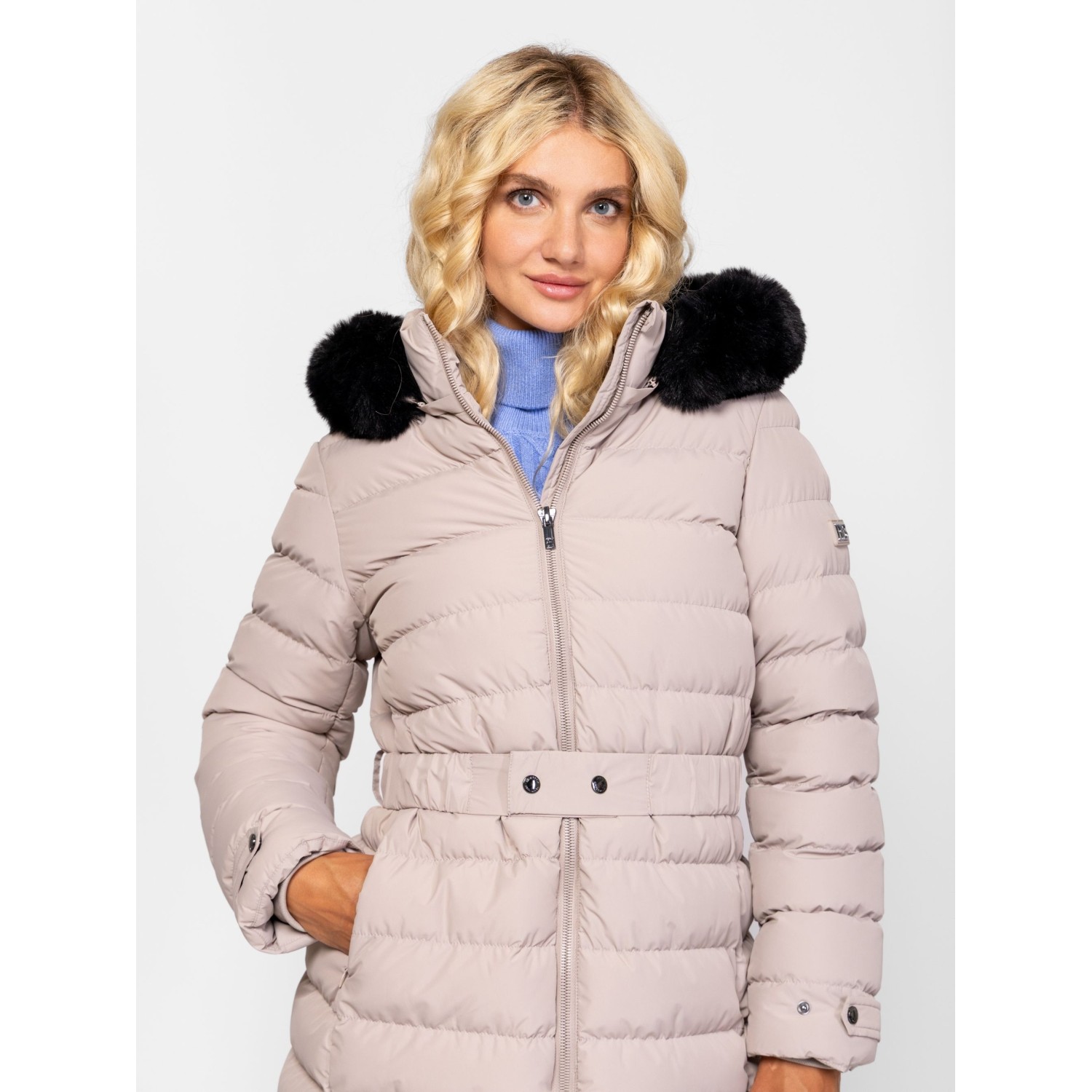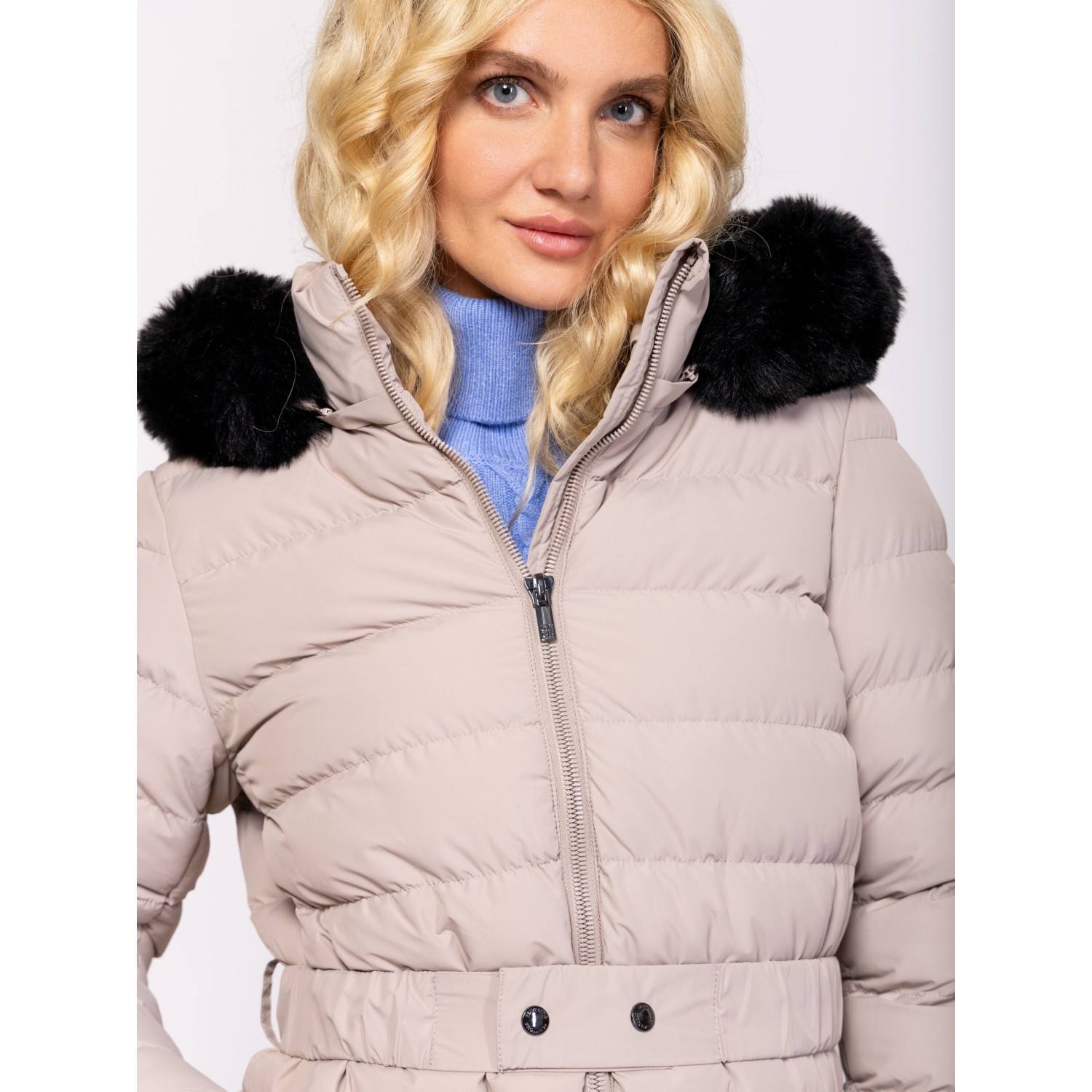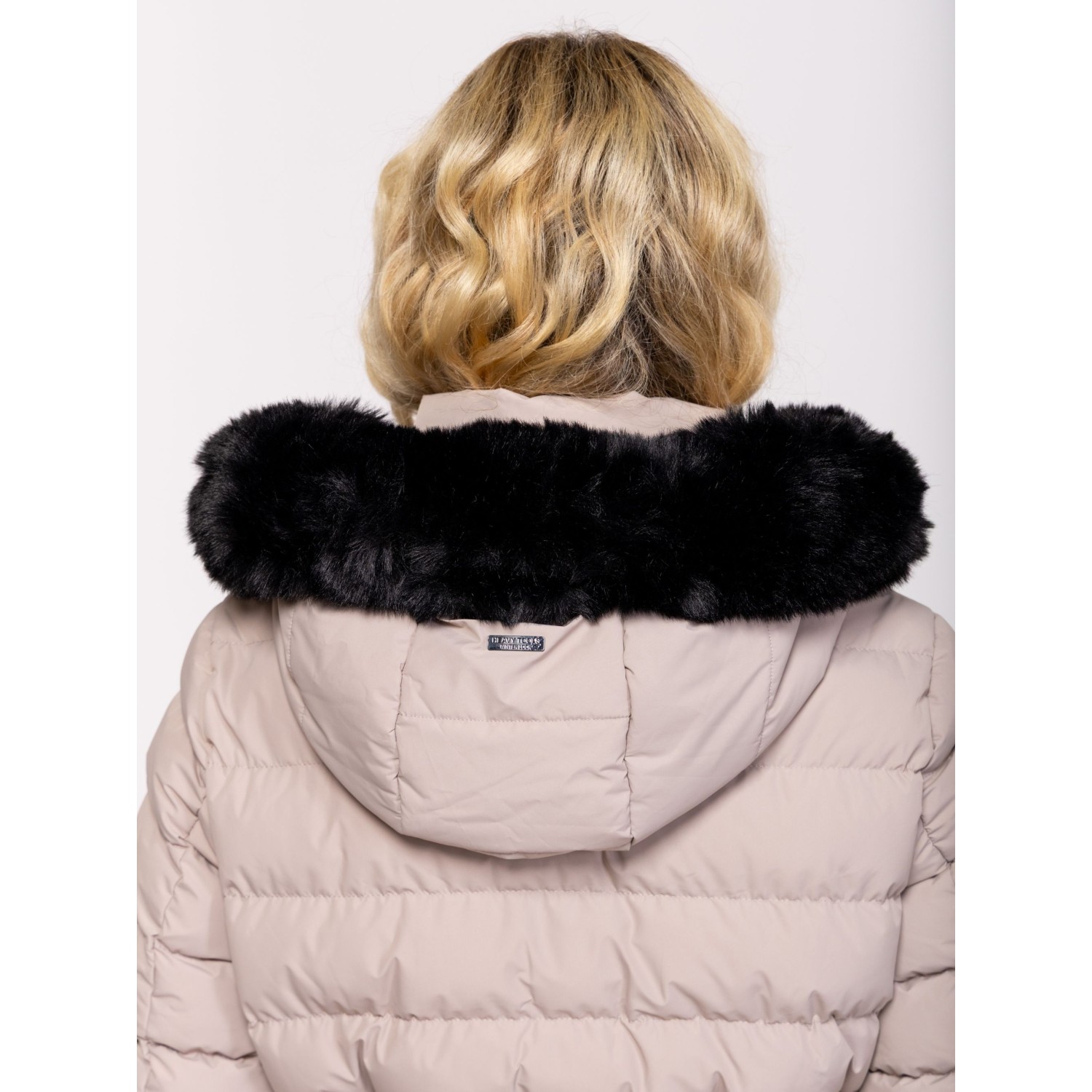 Női utcai steppelt télikabát, nőies vonalvezetéssel, térd feletti hosszal, levehető kapucnival, kapucniról levehető szőrmével, szabásvonalba helyezett, rejtett cipzáros zsebekkel, bordás passzés kézelővel, kis fém márkajelzéssel az ujján és a kapucniján. Anyaga: külső: 100% poliészter, bélés: 100% poliészter, tömés: 100% poliészter, műszőrme: 100% poliészter. A modell 175 cm magas és S-es méretet visel.