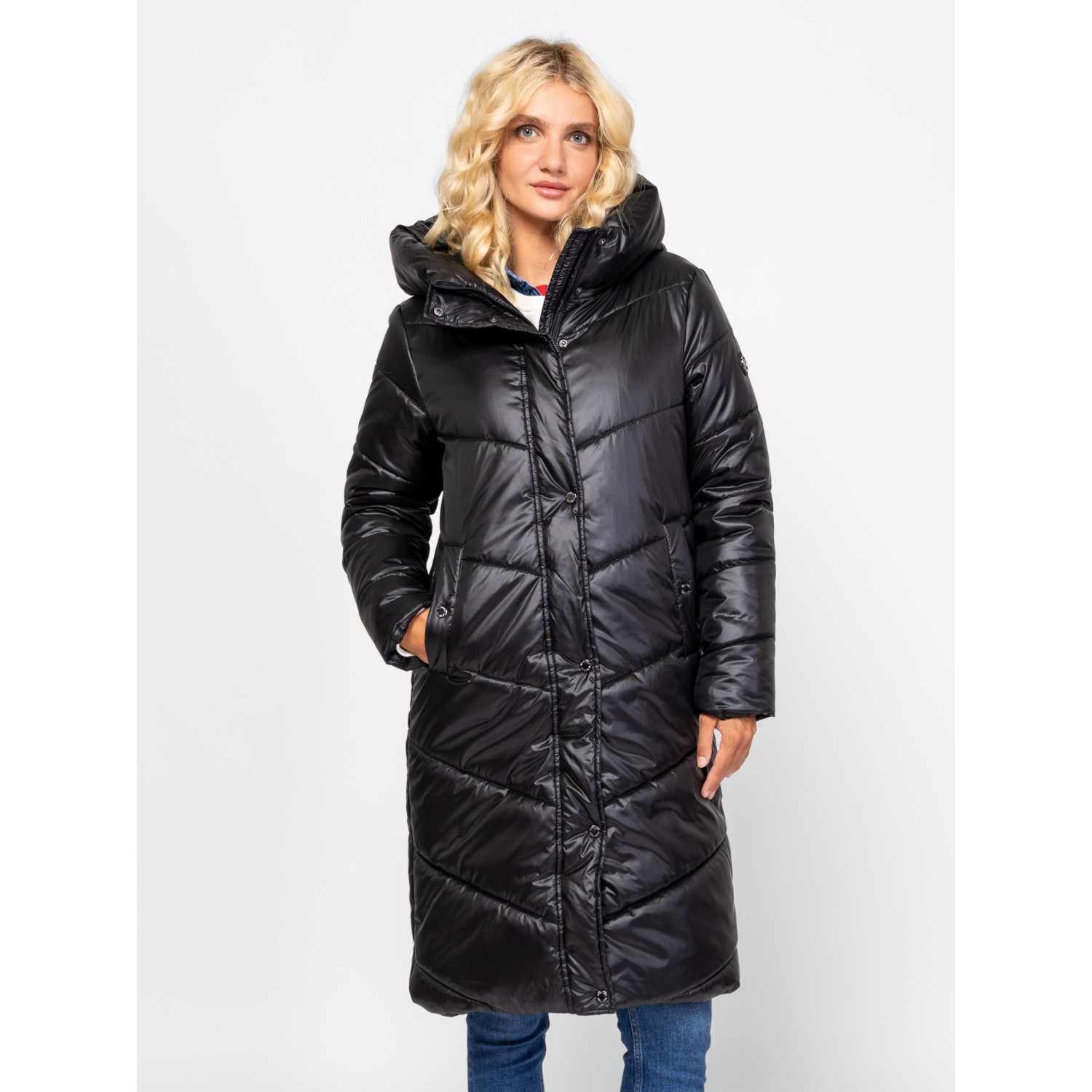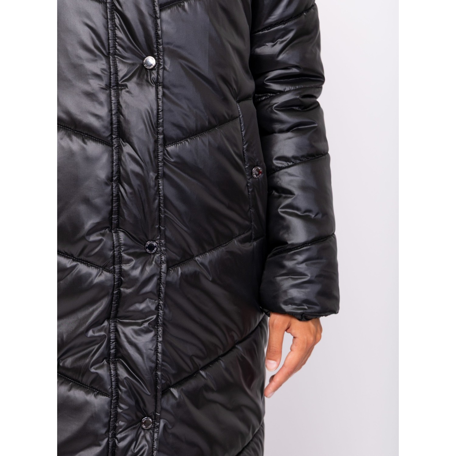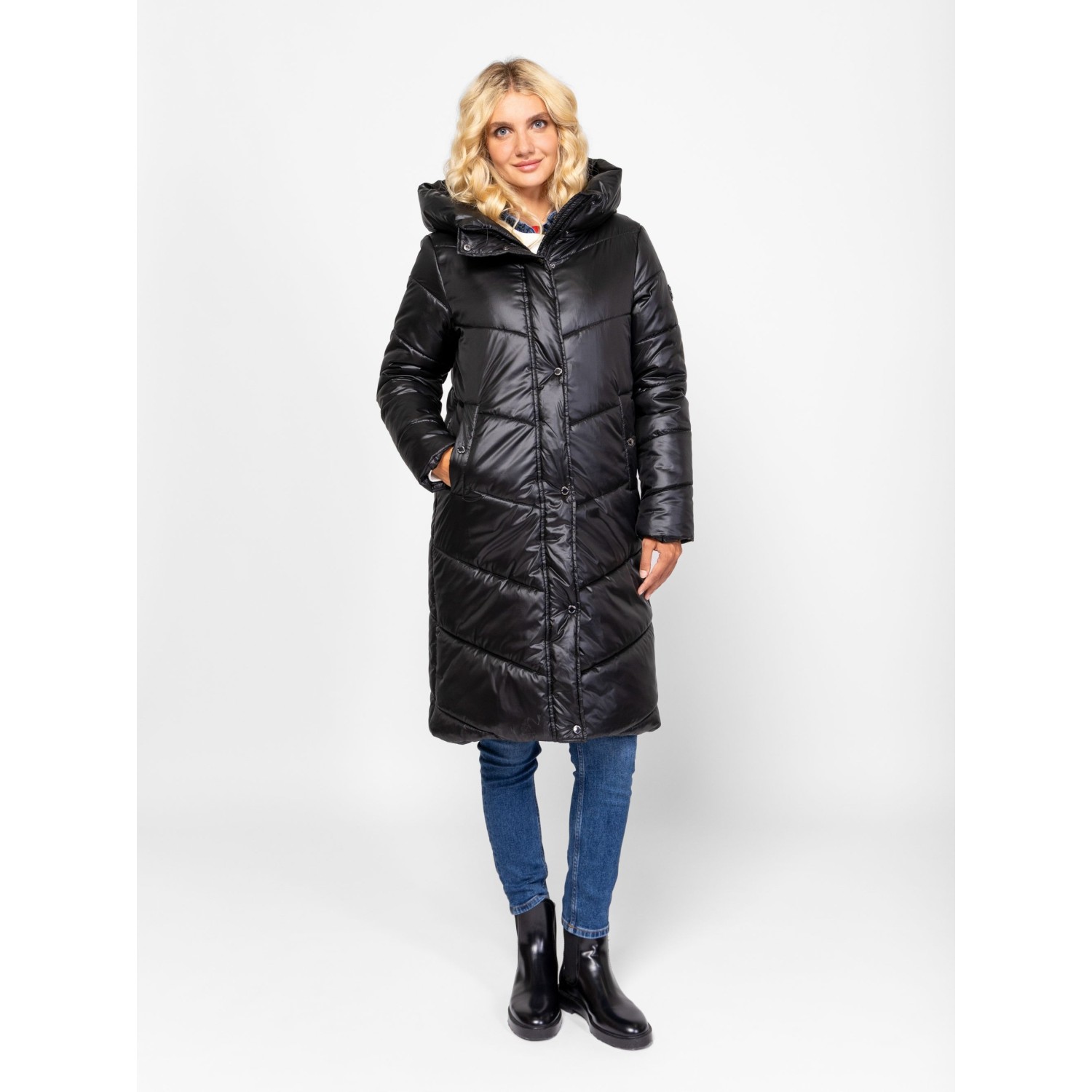 Női utcai steppelt télikabát, bővebb szabással, térdig érő hosszal, külső és belső szélfogóval, fix kapucnival, patenttal záródó egyenes zsebekkel, kis fém márkajelzéssel az ujján. Anyaga: külső: 100% nylon, bélés: 100% poliészter, tömés: 100% poliészter. A modell 175 cm magas és S-es méretet visel.