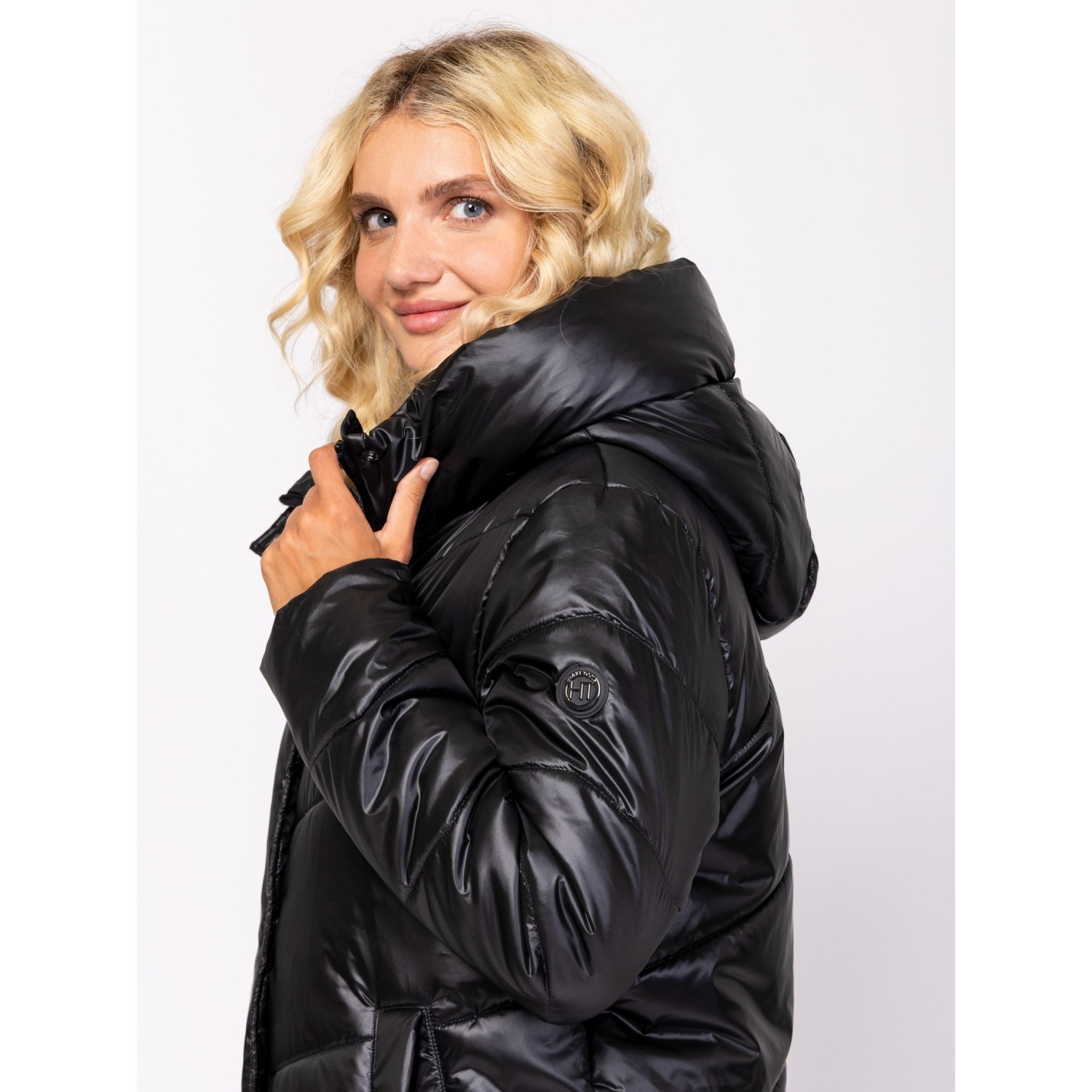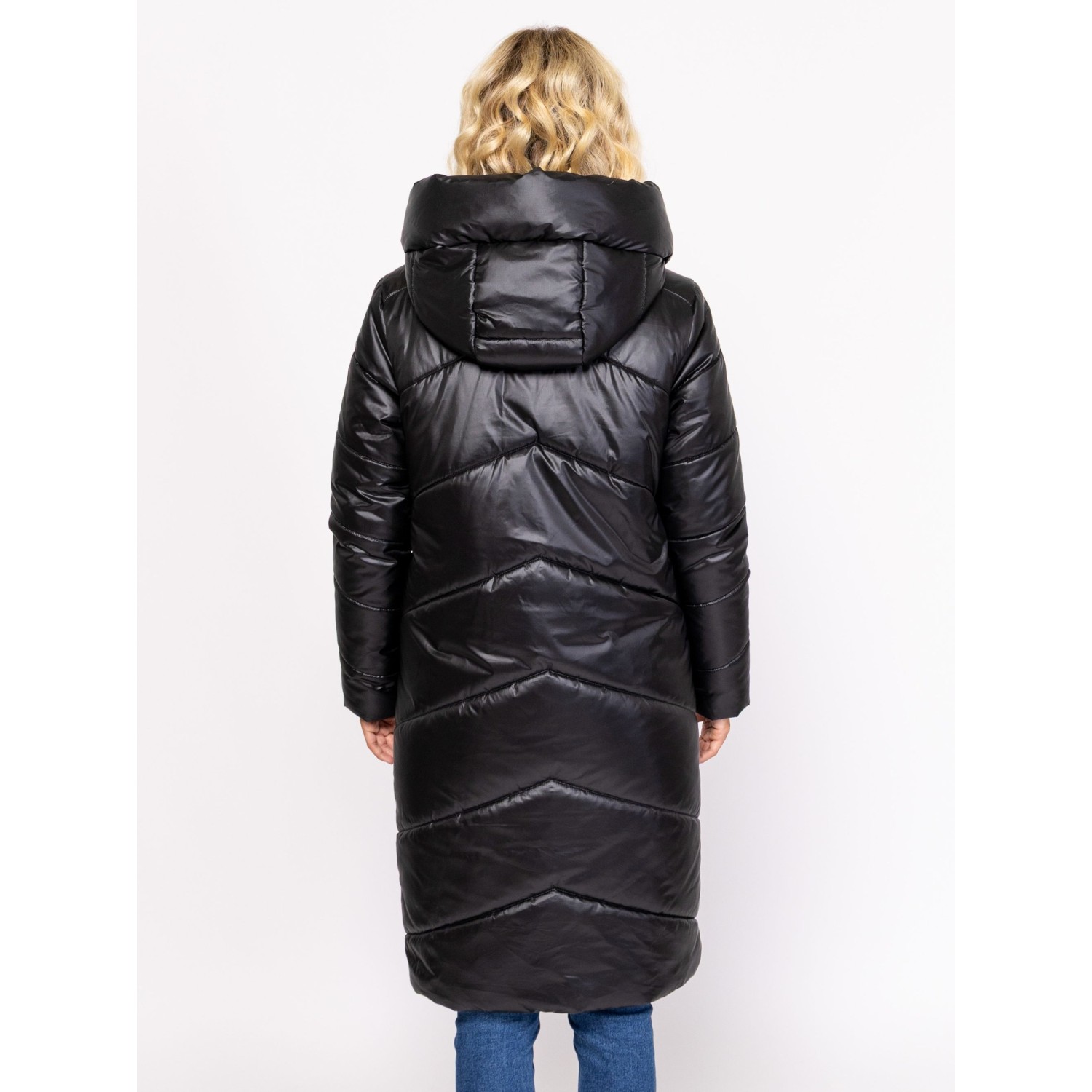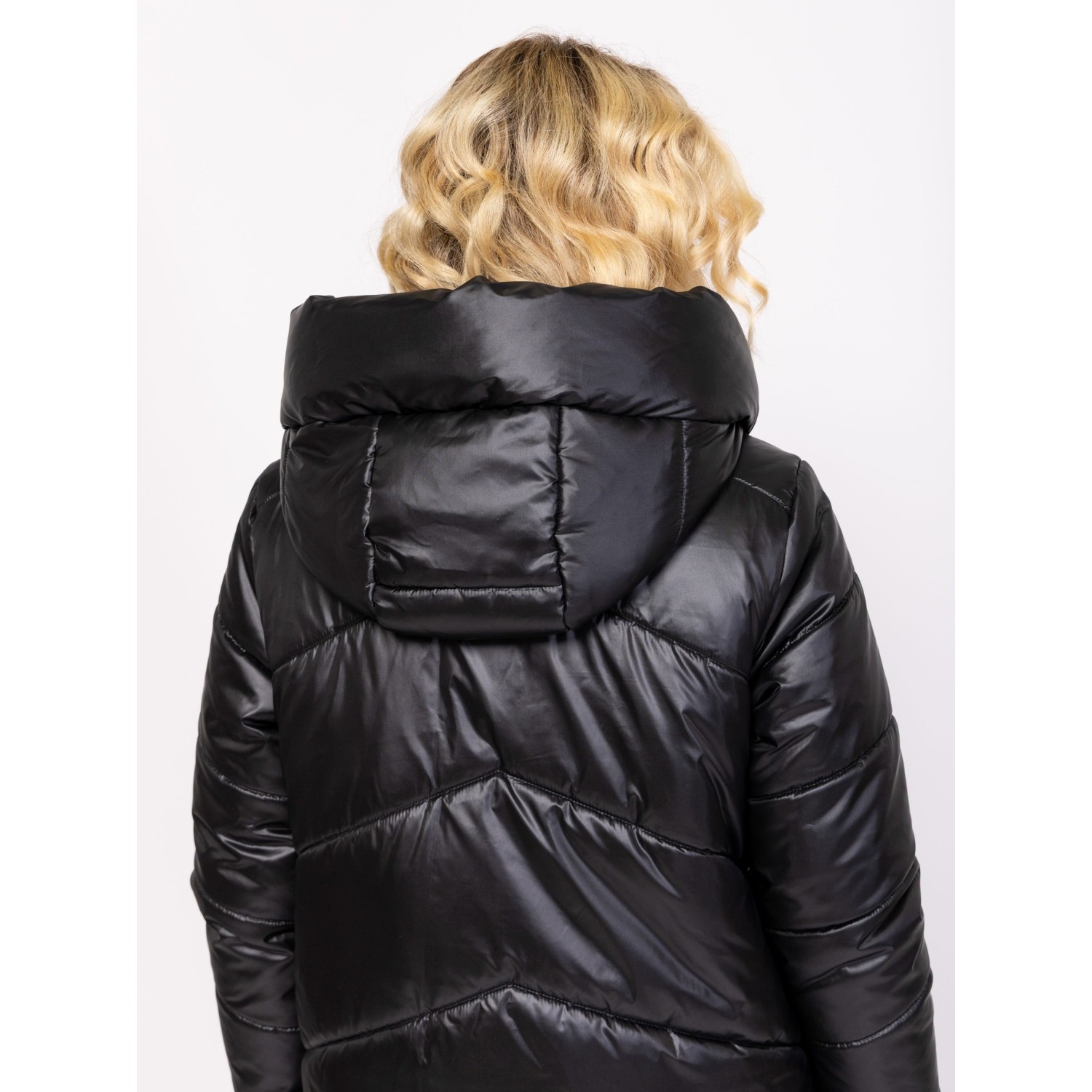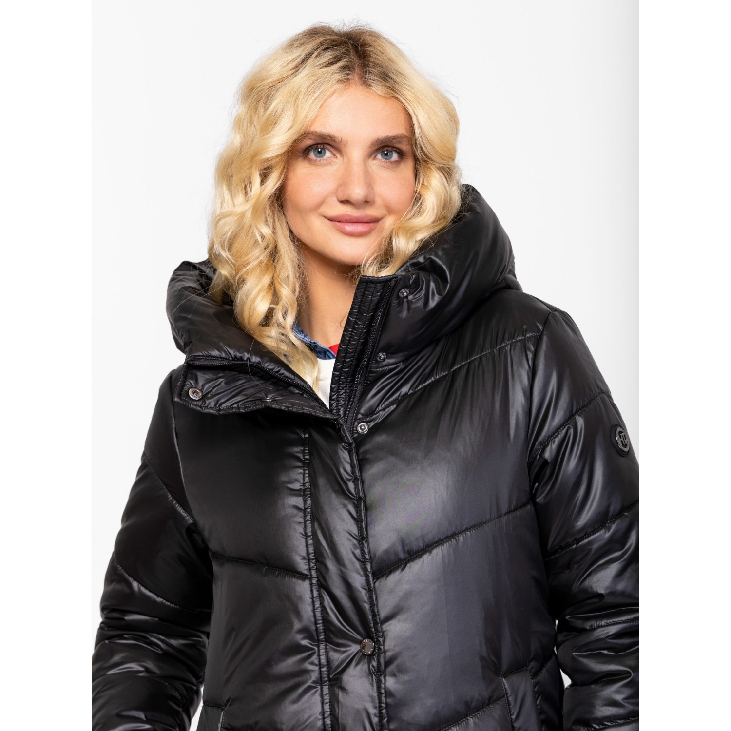 Női utcai steppelt télikabát, bővebb szabással, térdig érő hosszal, külső és belső szélfogóval, fix kapucnival, patenttal záródó egyenes zsebekkel, kis fém márkajelzéssel az ujján. Anyaga: külső: 100% nylon, bélés: 100% poliészter, tömés: 100% poliészter. A modell 175 cm magas és S-es méretet visel.
