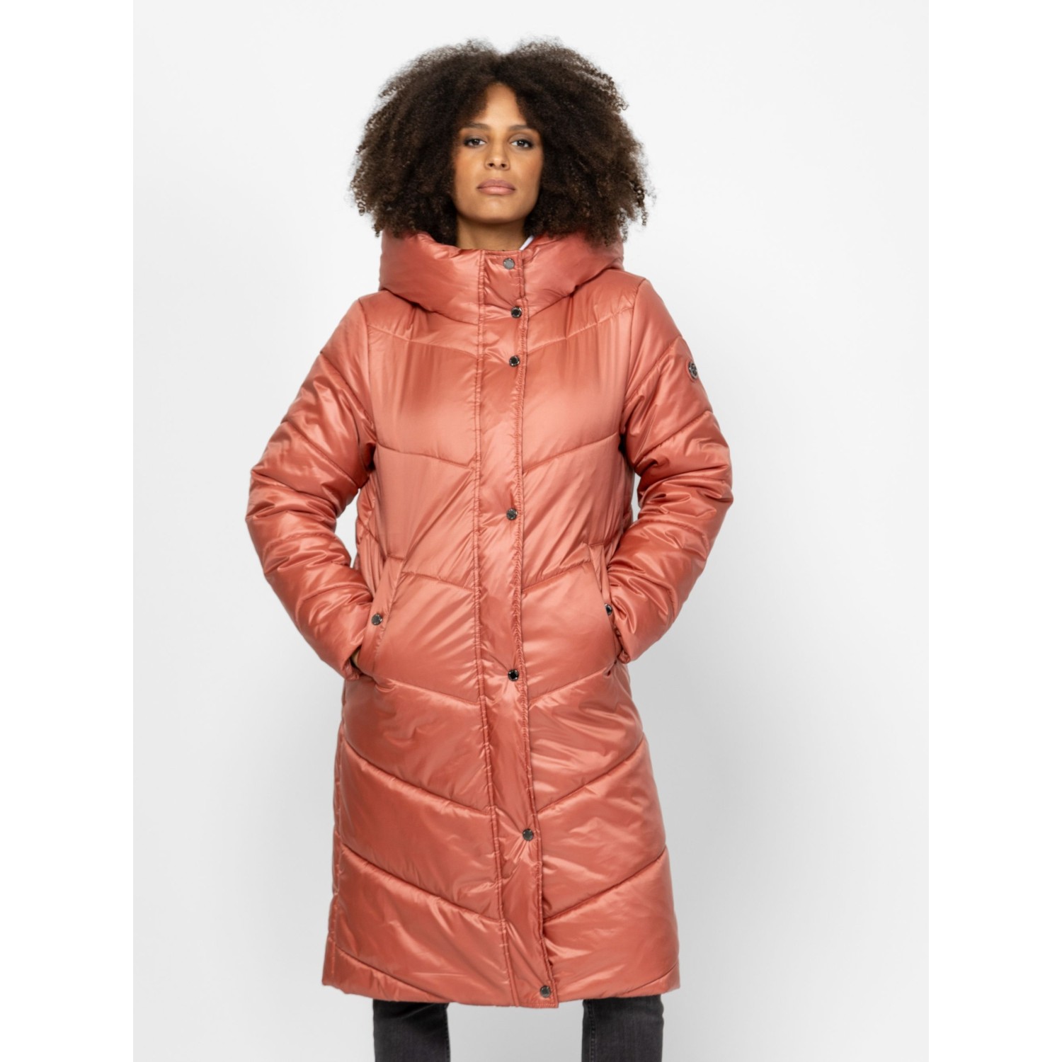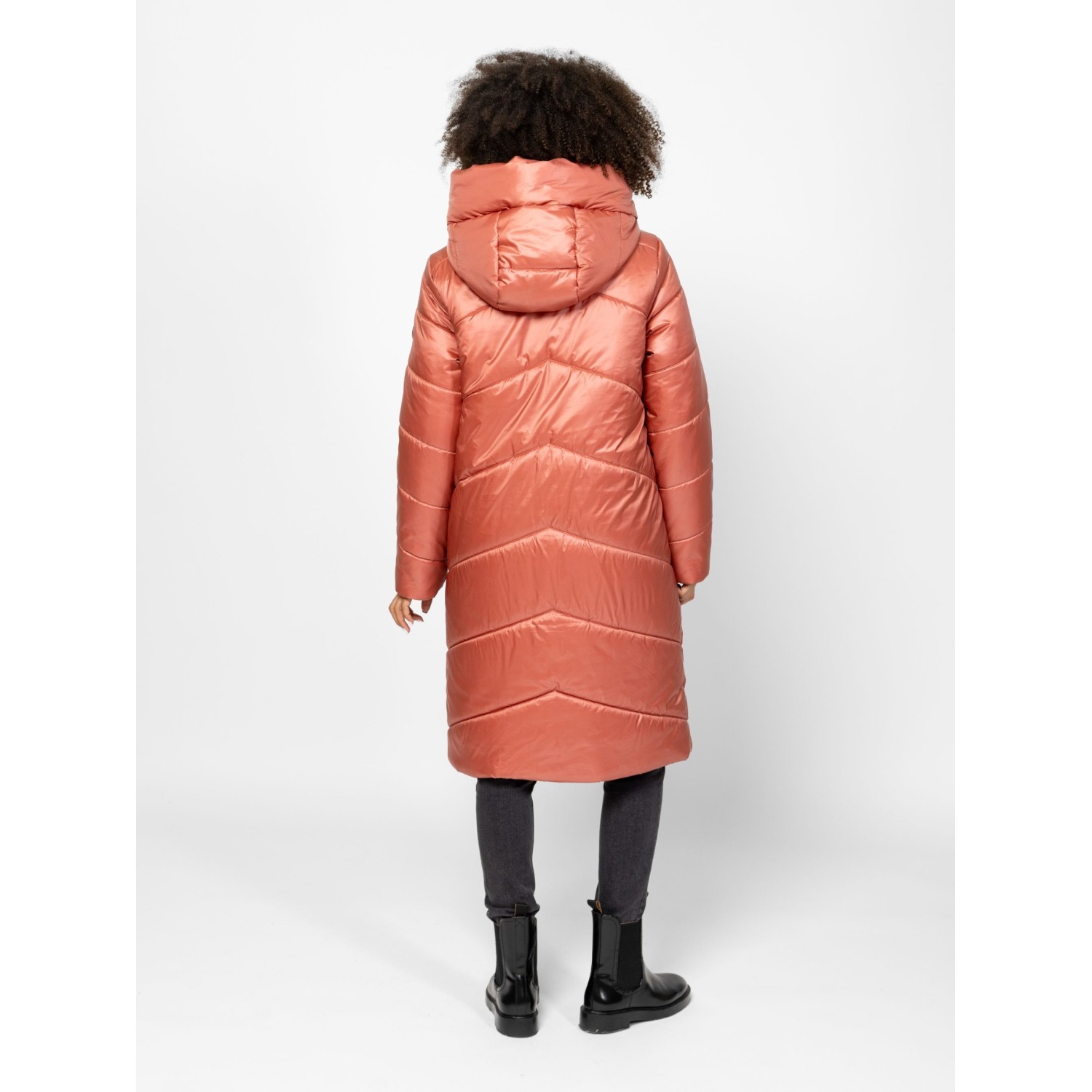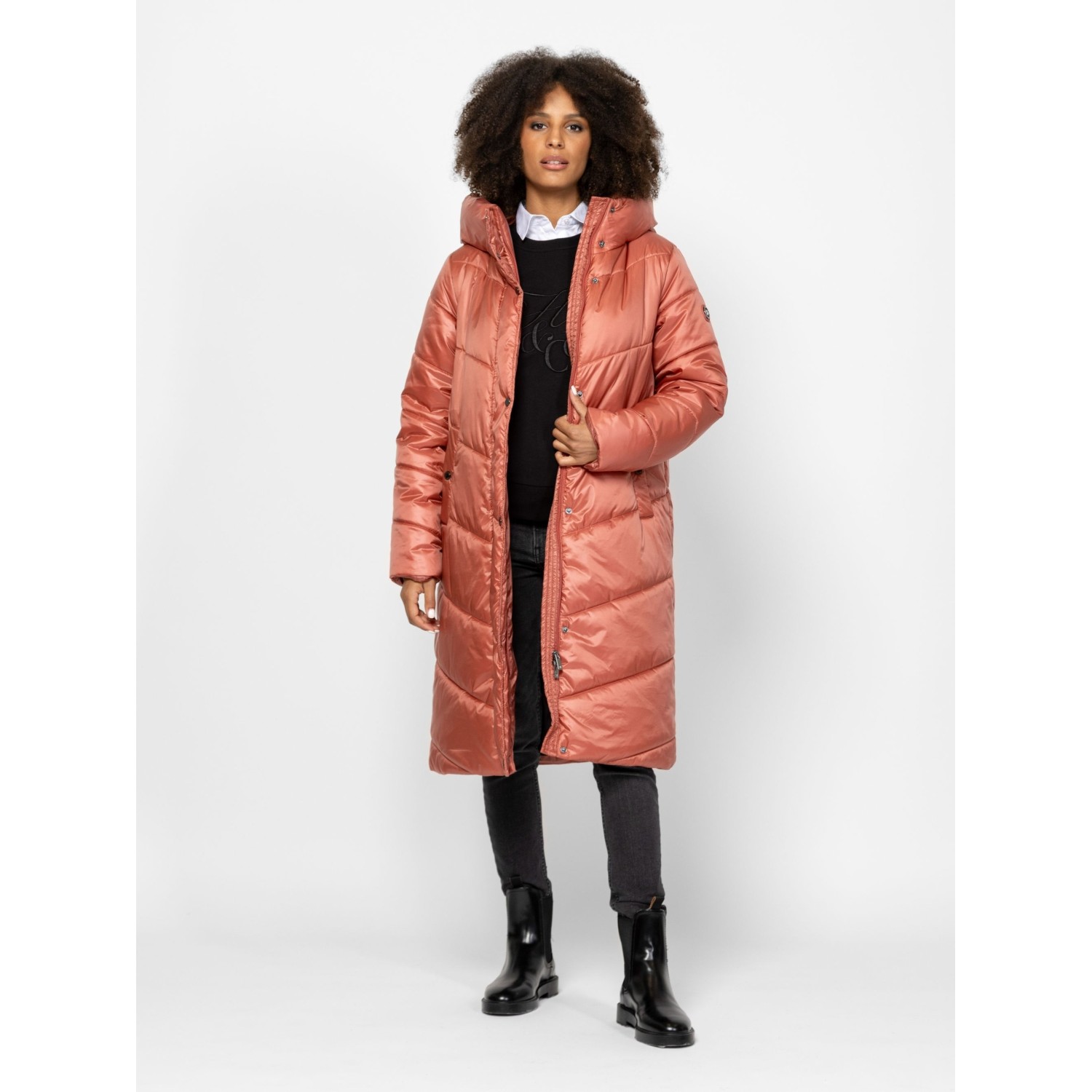 Női utcai steppelt télikabát, bővebb szabással, térdig érő hosszal, külső és belső szélfogóval, fix kapucnival, patenttal záródó egyenes zsebekkel, kis fém márkajelzéssel az ujján. Anyaga: külső: 100% nylon, bélés: 100% poliészter, tömés: 100% poliészter. A modell 175 cm magas és S-es méretet visel.