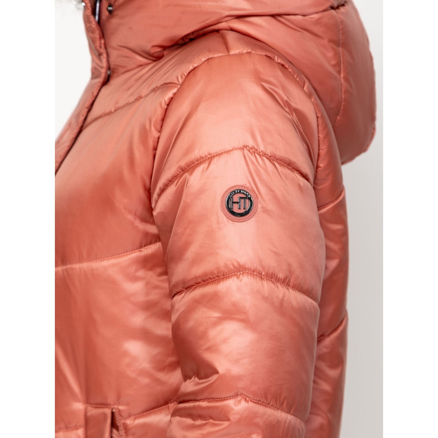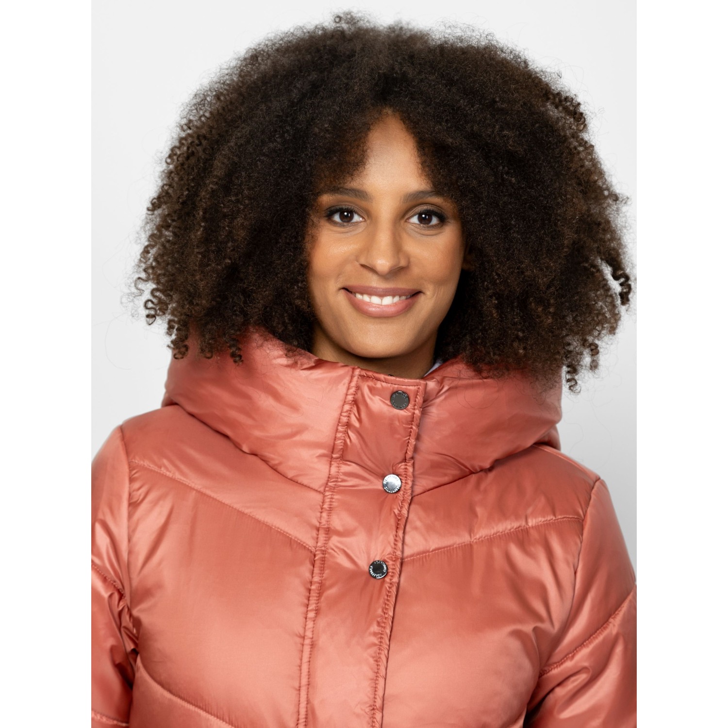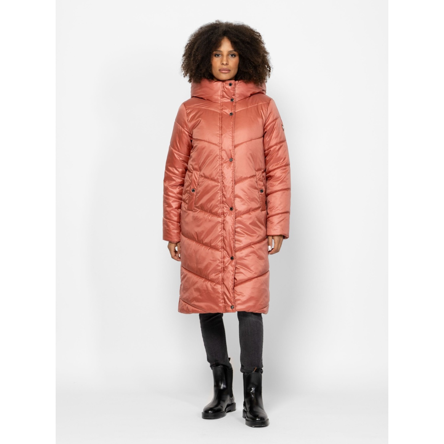 Női utcai steppelt télikabát, bővebb szabással, térdig érő hosszal, külső és belső szélfogóval, fix kapucnival, patenttal záródó egyenes zsebekkel, kis fém márkajelzéssel az ujján. Anyaga: külső: 100% nylon, bélés: 100% poliészter, tömés: 100% poliészter. A modell 175 cm magas és S-es méretet visel.