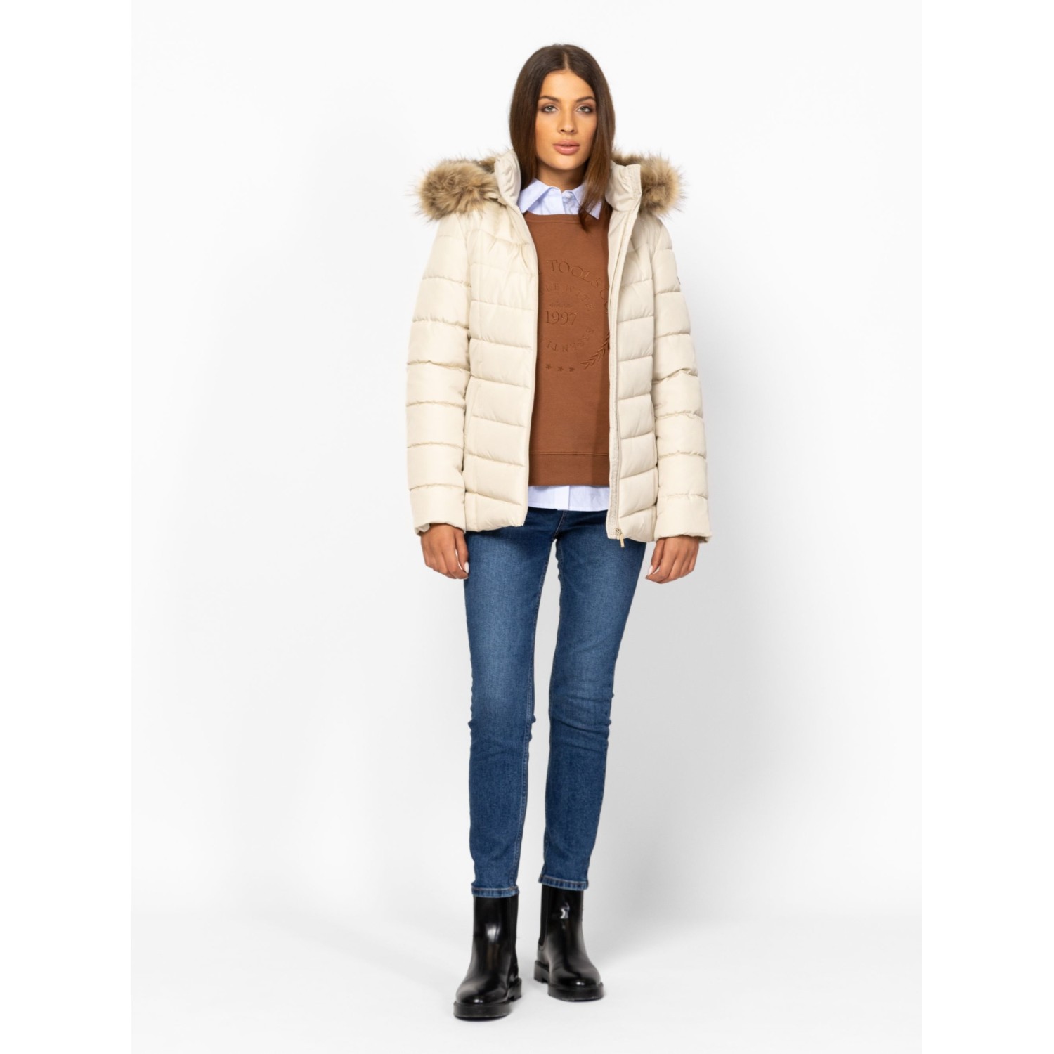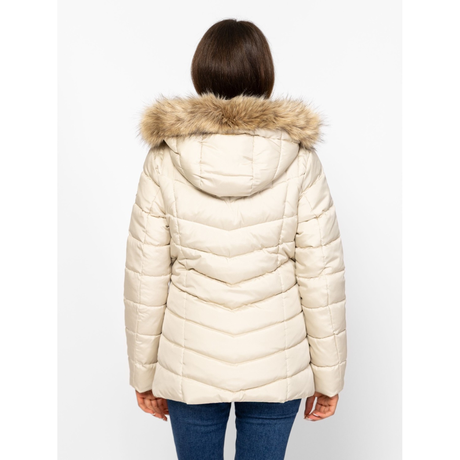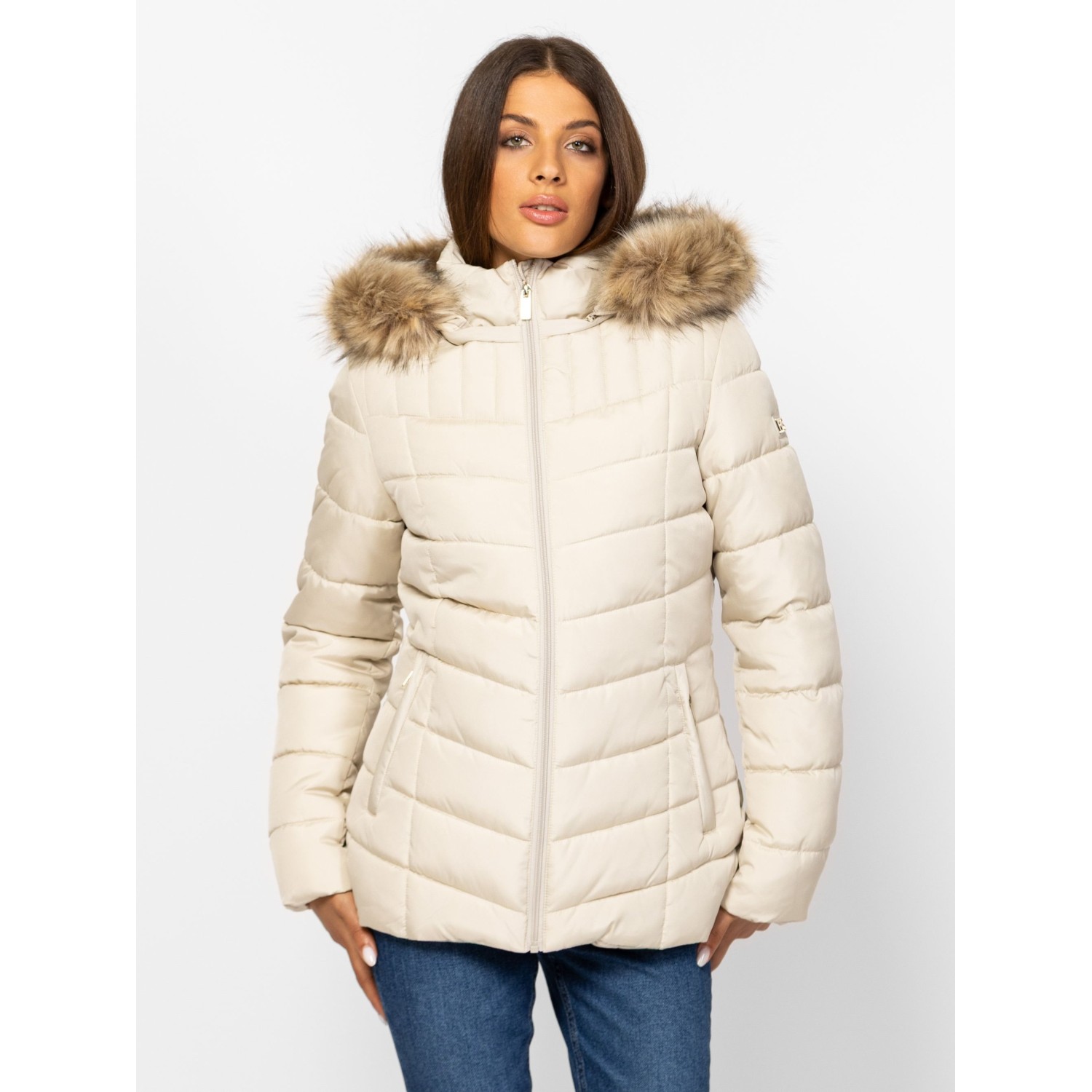 Női utcai steppelt dzseki, nőies vonalvezetéssel, csípőig érő hosszal, belső szélfogóval, levehető kapucnival, kapucniról levehető szőrmével, cipzáros zsebekkel, kis fém márkajelzéssel az ujján és a kapucniján. Anyaga: külső: 100% poliészter, bélés: 100% poliészter, tömés: 100% poliészter. A modell 175 cm magas és S-es méretet visel.