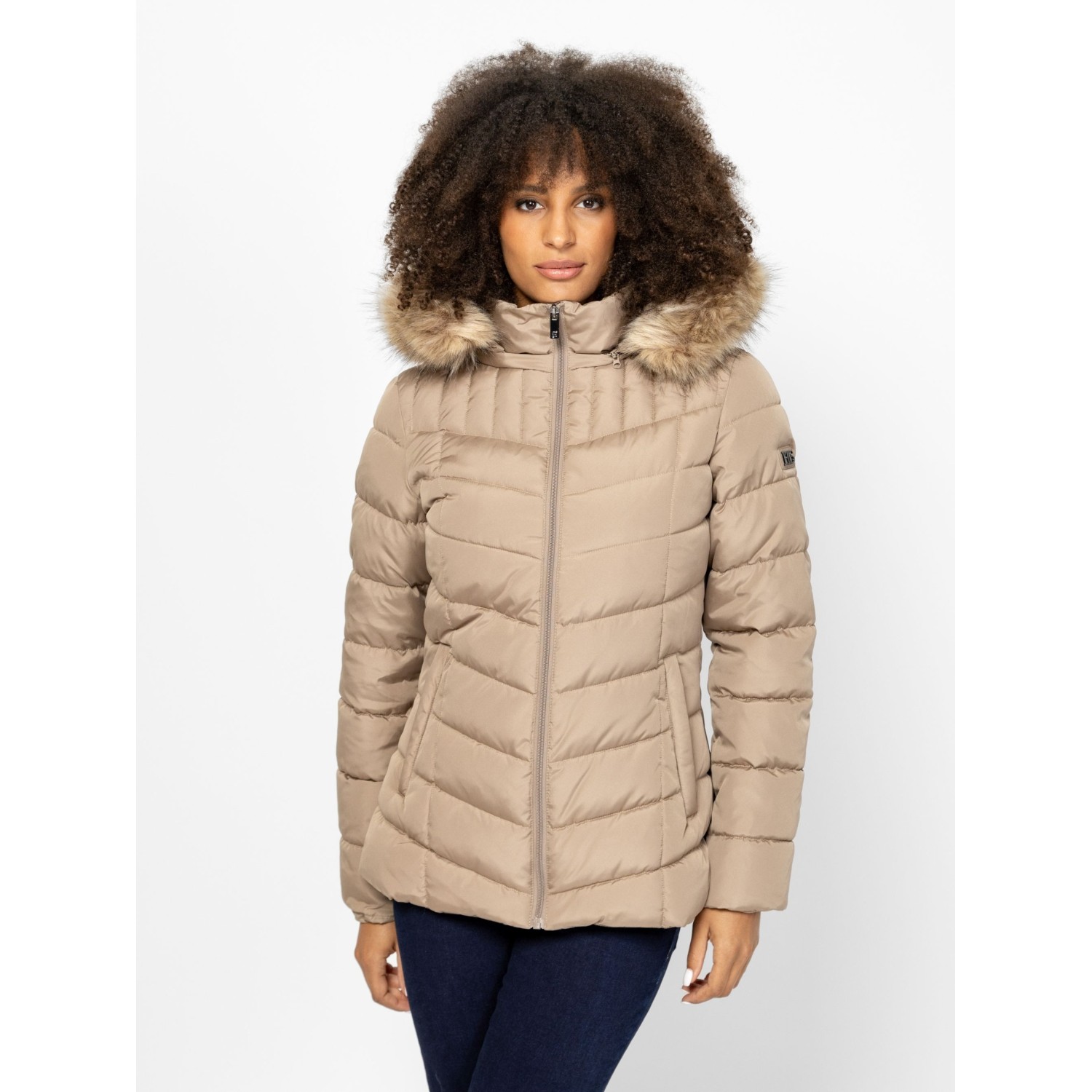 Női utcai steppelt dzseki, nőies vonalvezetéssel, csípőig érő hosszal, belső szélfogóval, levehető kapucnival, kapucniról levehető szőrmével, cipzáros zsebekkel, kis fém márkajelzéssel az ujján és a kapucniján. Anyaga: külső: 100% poliészter, bélés: 100% poliészter, tömés: 100% poliészter. A modell 175 cm magas és S-es méretet visel.