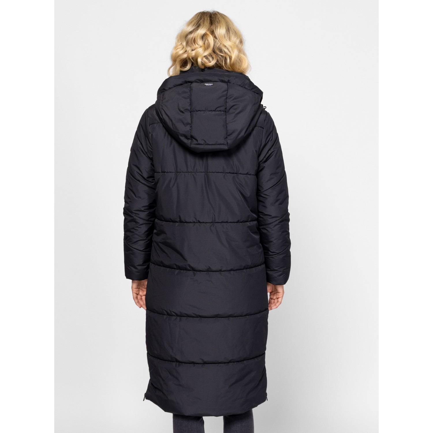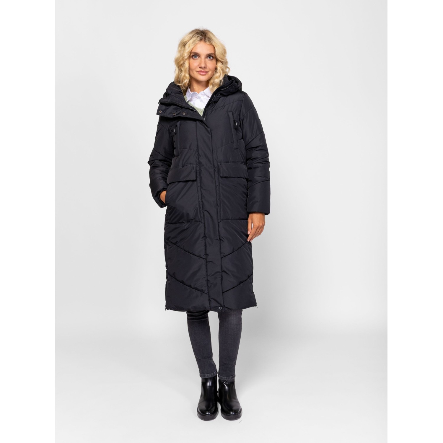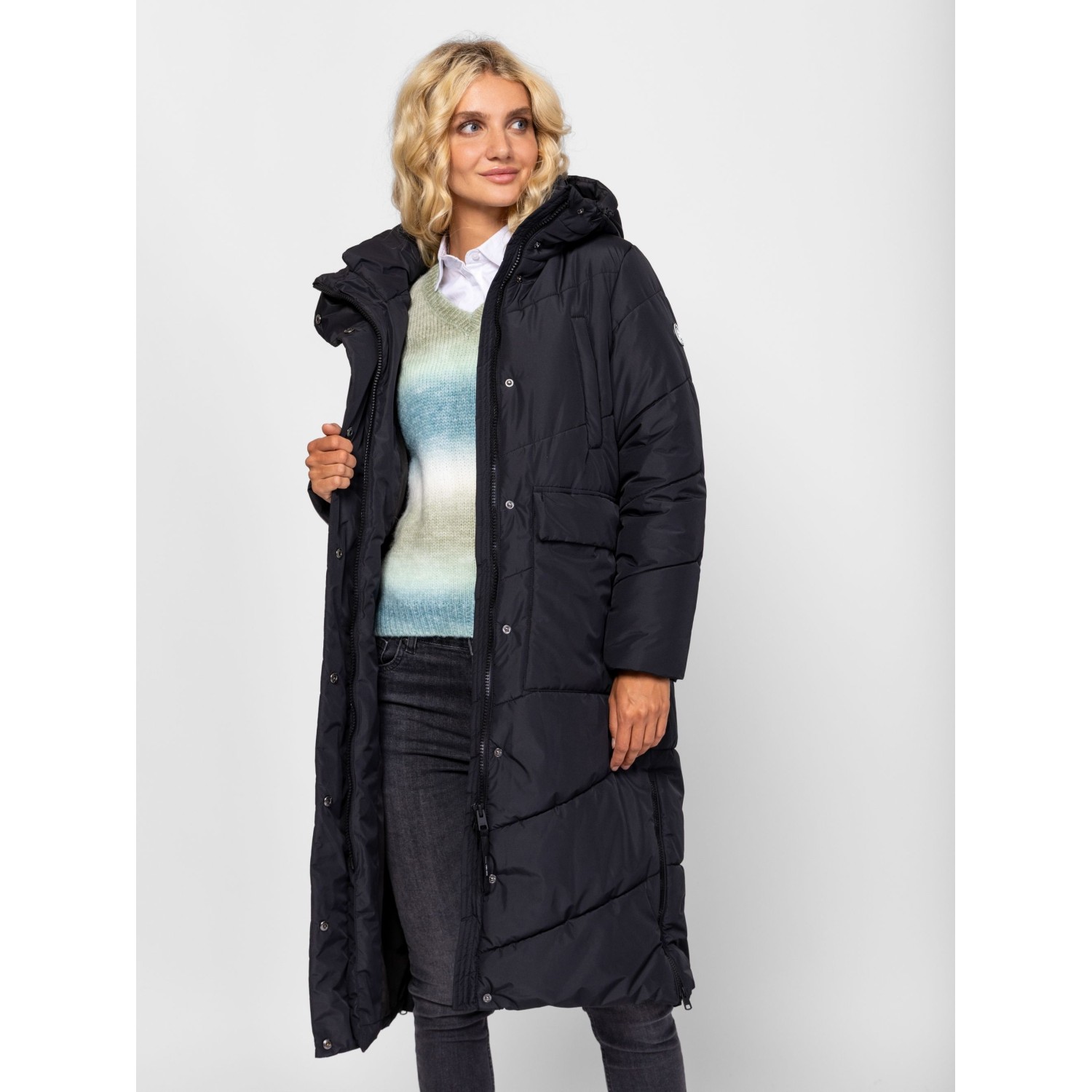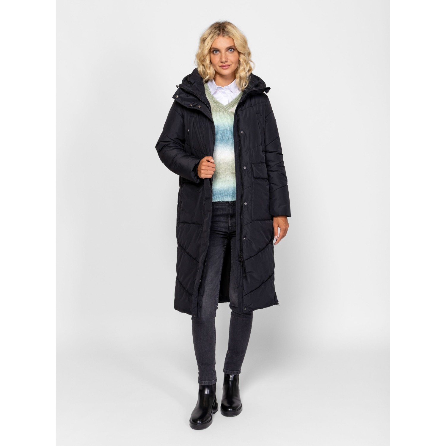 Női utcai steppelt télikabát, egyenes szabással, vádli középig érő hosszal, állítható fix kapucnival, patentos külső és belső szélfogóval, állítható derékkal, ujja alján bordás passzés kézelővel, oldalában cipzáros hasítékkal, elején nagy folt zsebekkel és cipzáros zsebekkel, ujján, kapucniján és oldalában kis márkajelzéssel. Anyaga: külső: 100% poliészter, bélés: 100% poliészter, tömés: 100% poliészter. A modell 175 cm magas és S-es méretet visel.