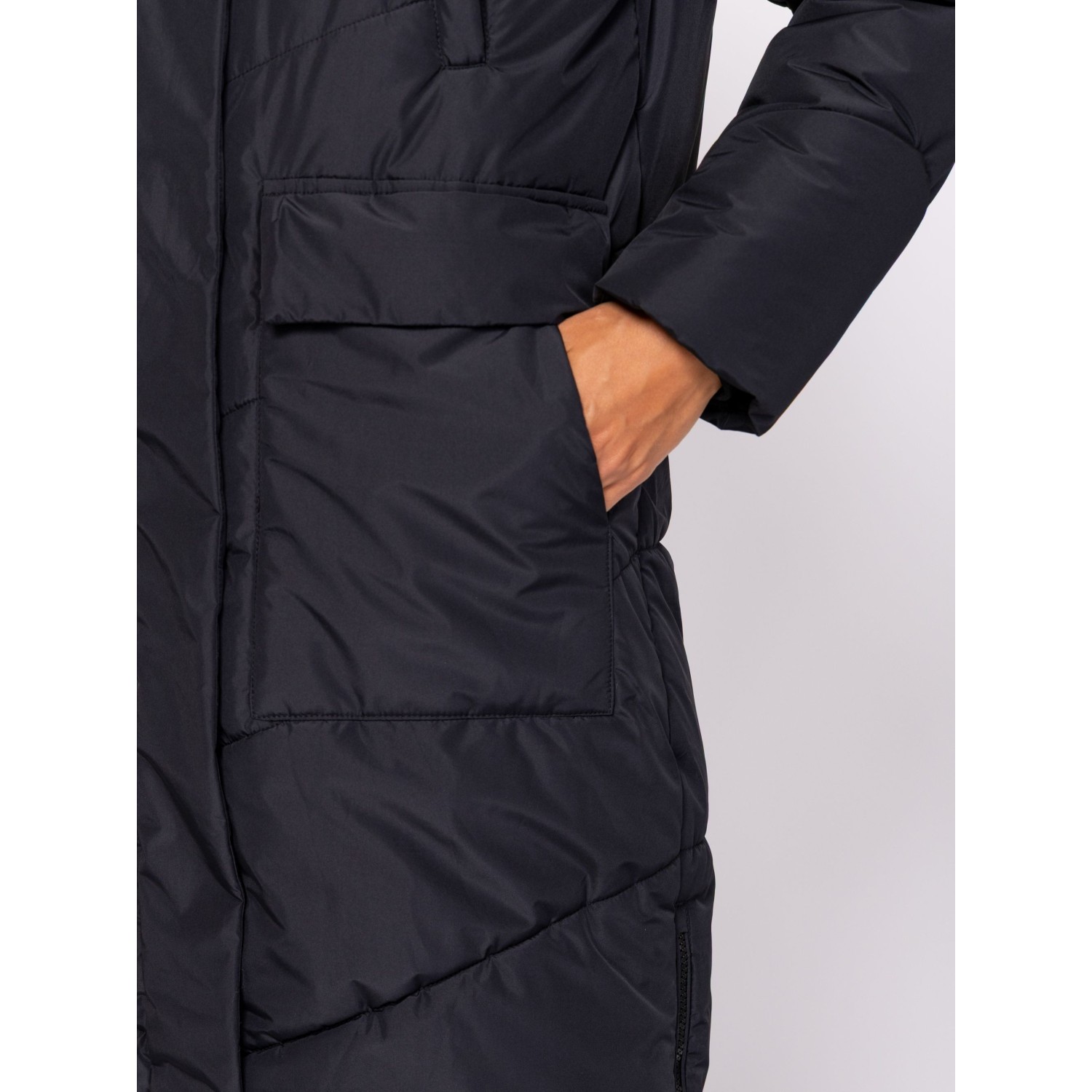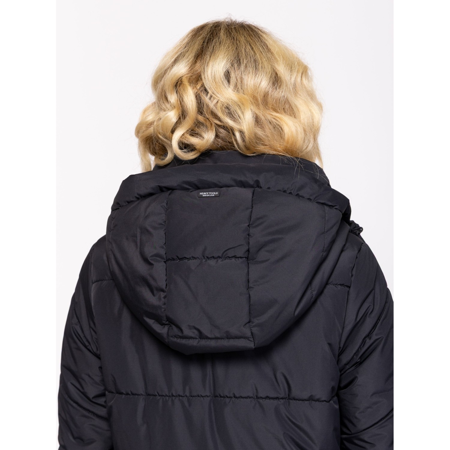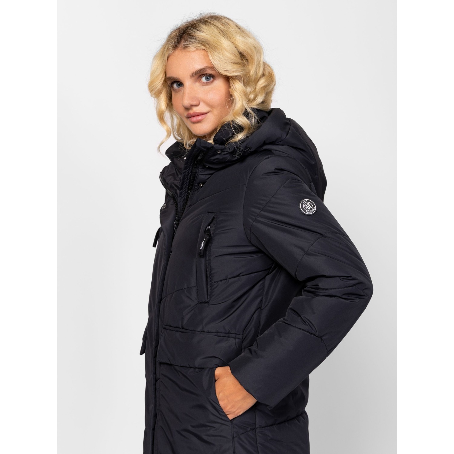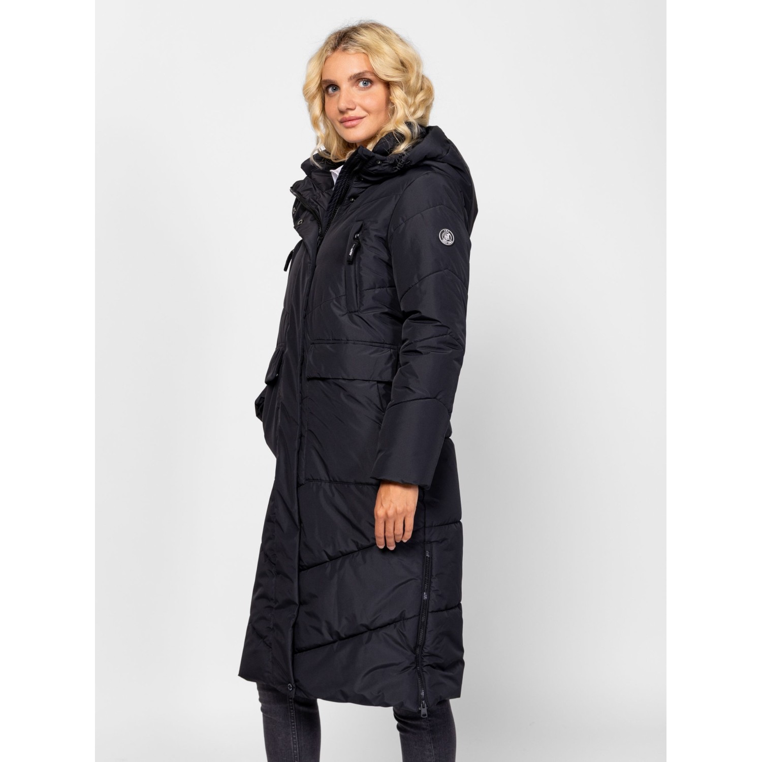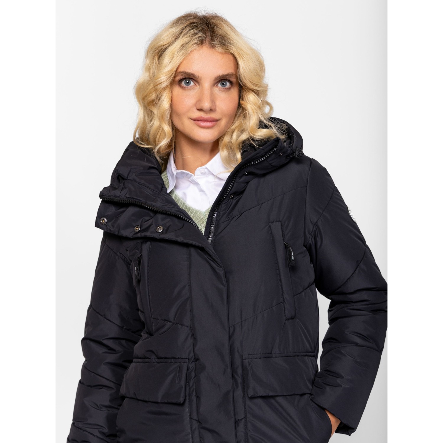 Női utcai steppelt télikabát, egyenes szabással, vádli középig érő hosszal, állítható fix kapucnival, patentos külső és belső szélfogóval, állítható derékkal, ujja alján bordás passzés kézelővel, oldalában cipzáros hasítékkal, elején nagy folt zsebekkel és cipzáros zsebekkel, ujján, kapucniján és oldalában kis márkajelzéssel. Anyaga: külső: 100% poliészter, bélés: 100% poliészter, tömés: 100% poliészter. A modell 175 cm magas és S-es méretet visel.