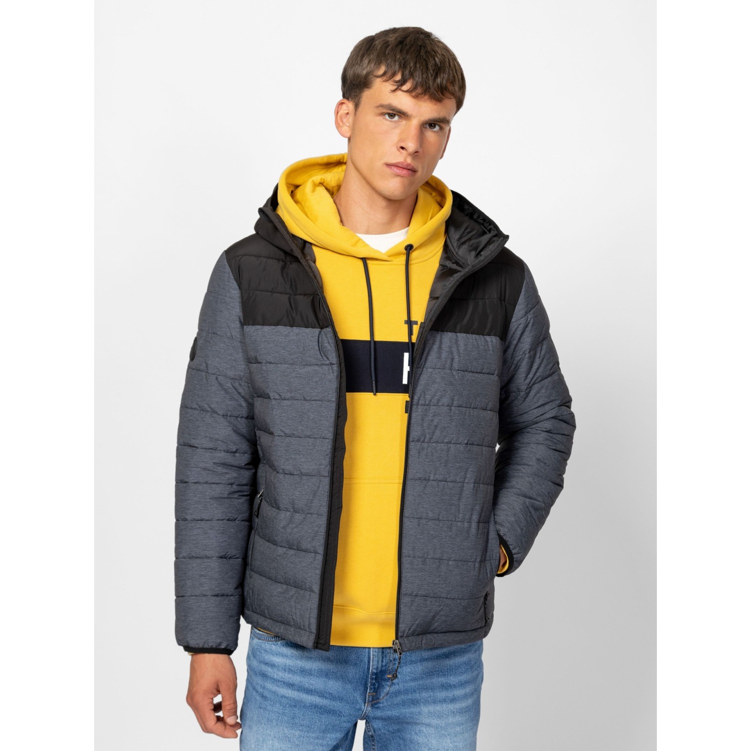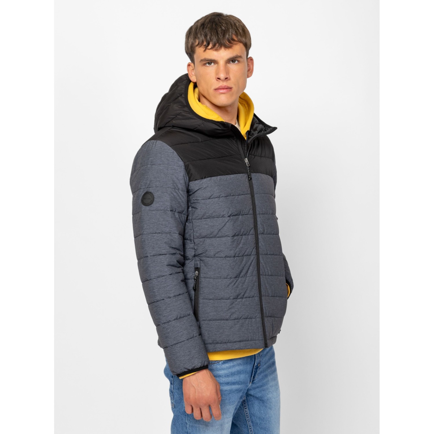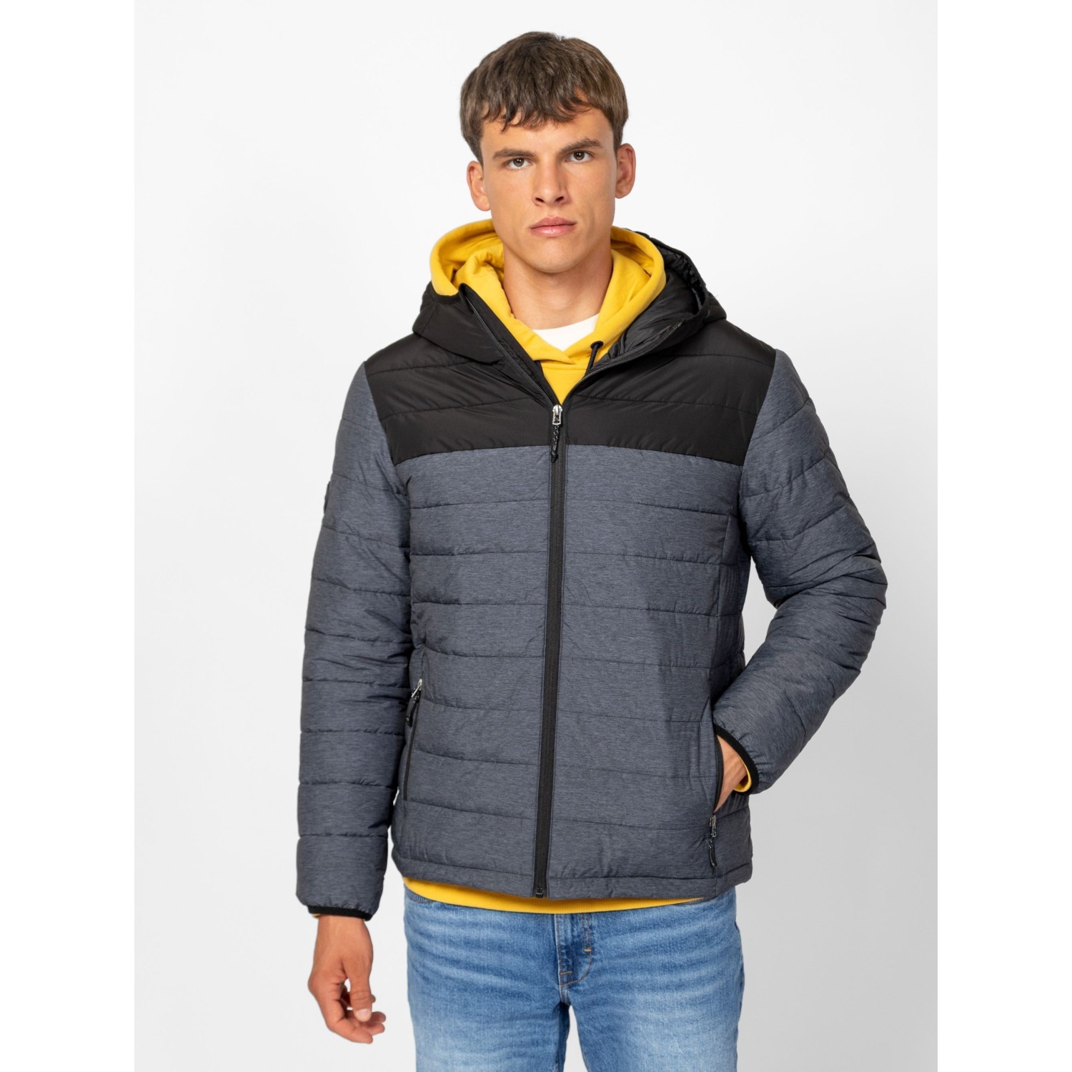 Férfi, steppelt kapucnis dzseki, kényelmes, sportos szabással és színekkel, fix kapucnival, belső szélfogóval, cipzáras zsebekkel, cipzáros belső zsebbel, kis márkajelzéssel az ujján. Anyaga: külső: 100% poliészter, bélés: 100% poliészter, tömés: 100% poliészter. A modell 188 cm magas és L-es méretet visel.