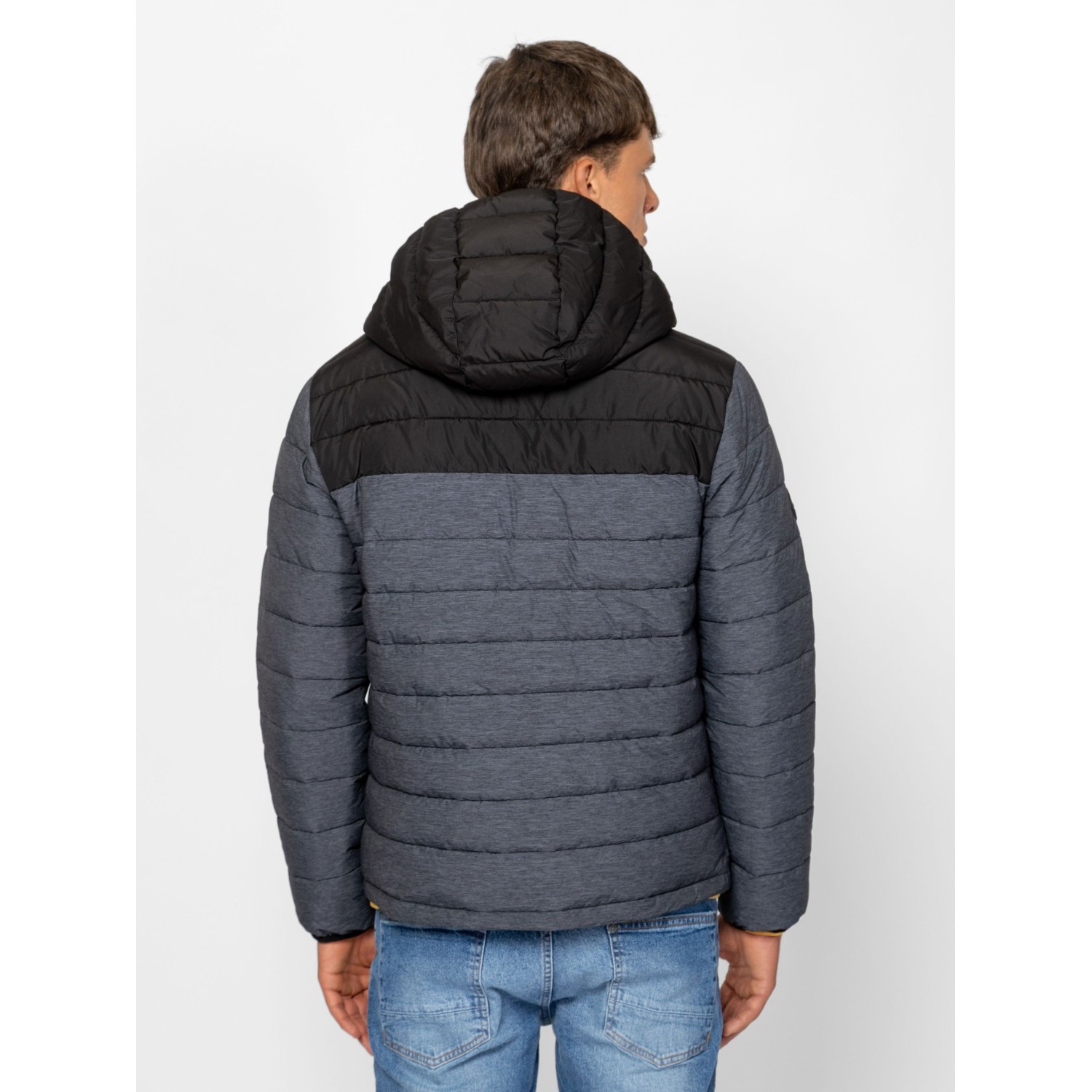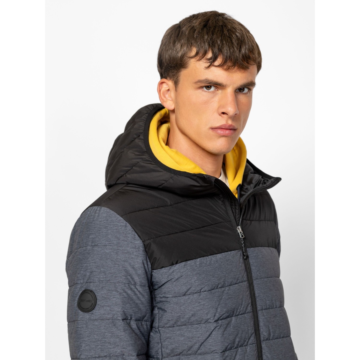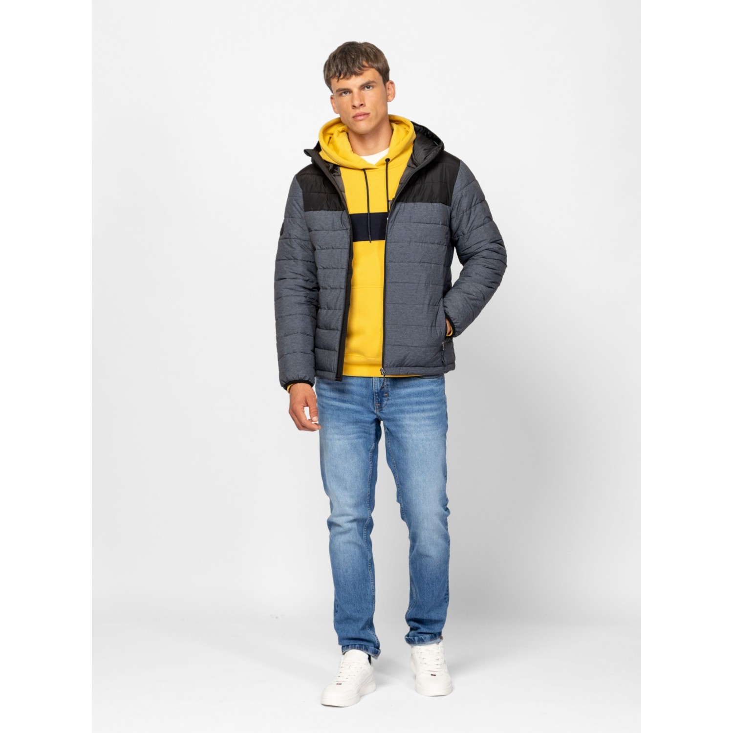 Férfi, steppelt kapucnis dzseki, kényelmes, sportos szabással és színekkel, fix kapucnival, belső szélfogóval, cipzáras zsebekkel, cipzáros belső zsebbel, kis márkajelzéssel az ujján. Anyaga: külső: 100% poliészter, bélés: 100% poliészter, tömés: 100% poliészter. A modell 188 cm magas és L-es méretet visel.