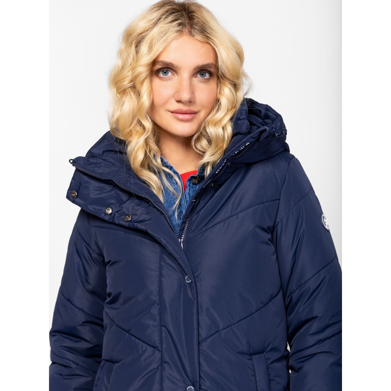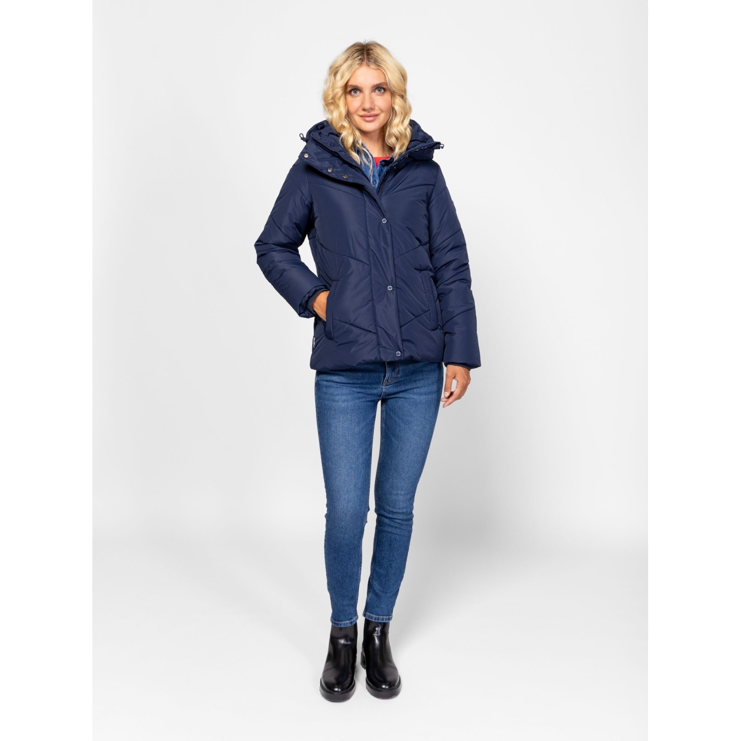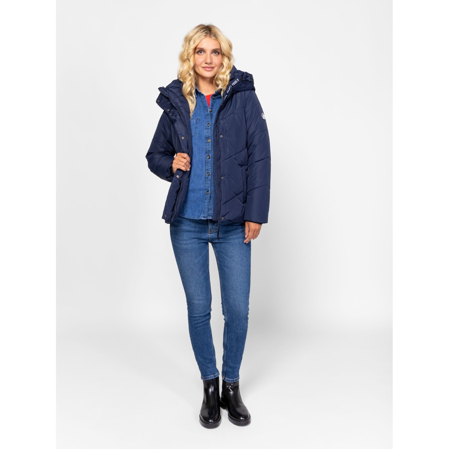 Női steppelt dzseki, egyenes szabással, csípőig érő hosszal, külső és belső szélfogóval, állítható, fix kapucnival, egyenes, cipzáros zsebekkel, bordás passzés kézelővel, kis márkajelzéssel az ujján, a kapucnin és az oldalában, nyomott márkajelzéssel a belső szélfogón. Anyaga: külső: 100% poliészter, bélés: 100% poliészter, tömés: 100% poliészter. A modell 175 cm magas és S-es méretet visel.