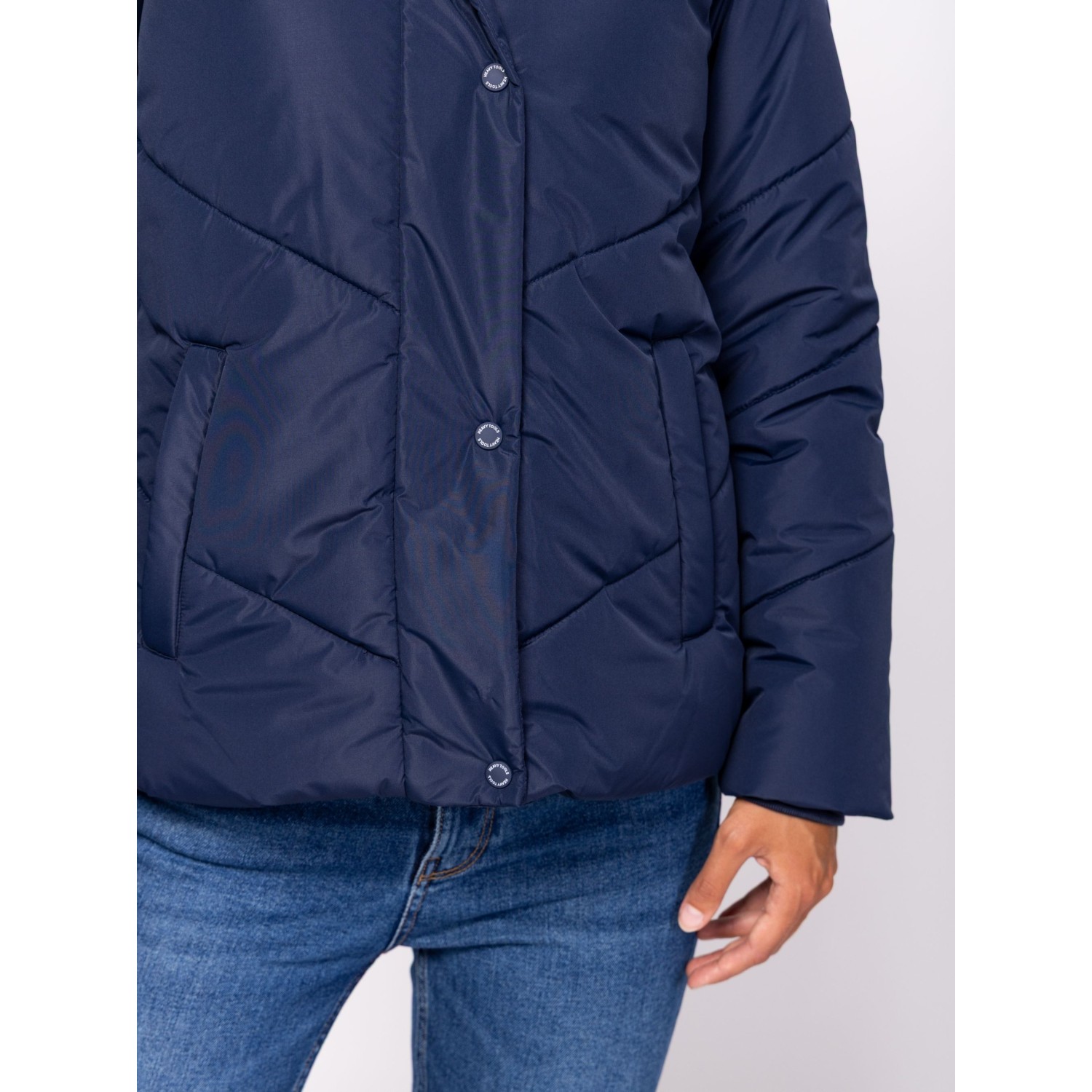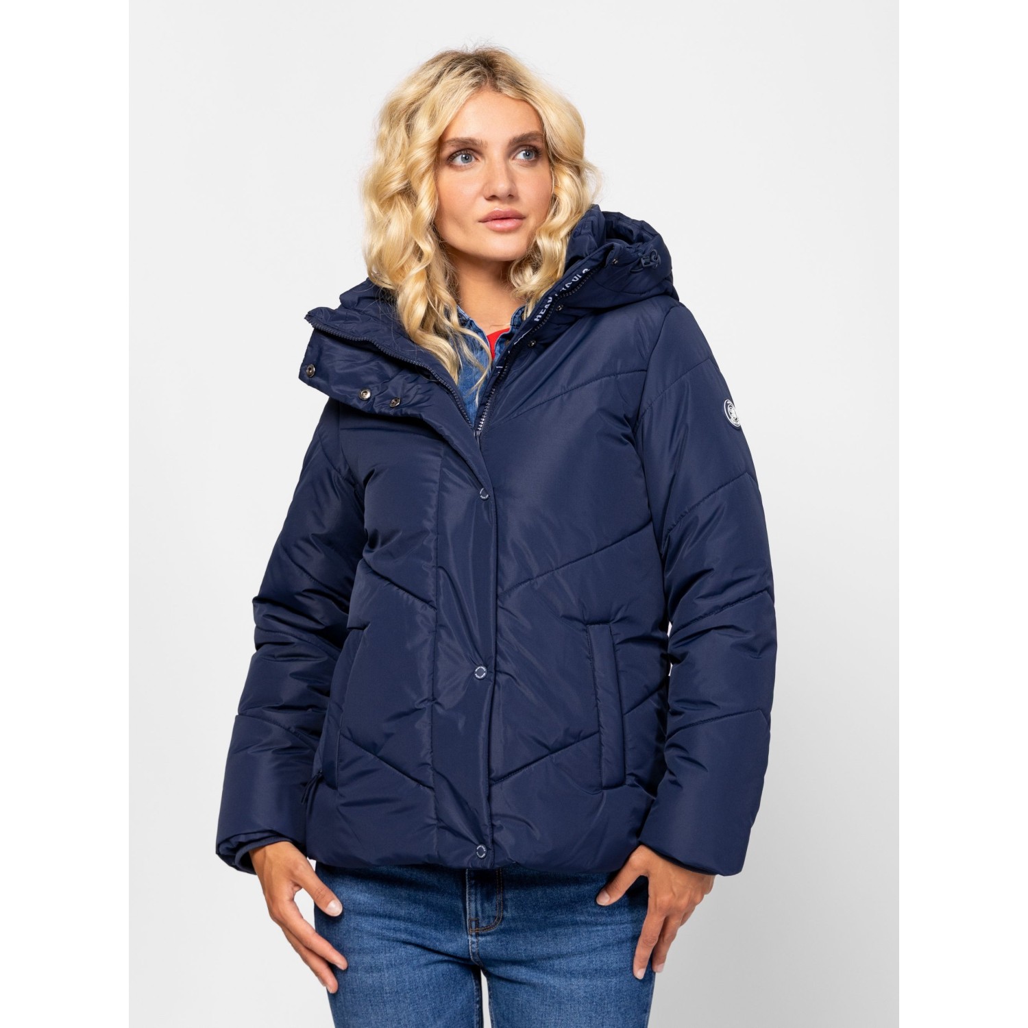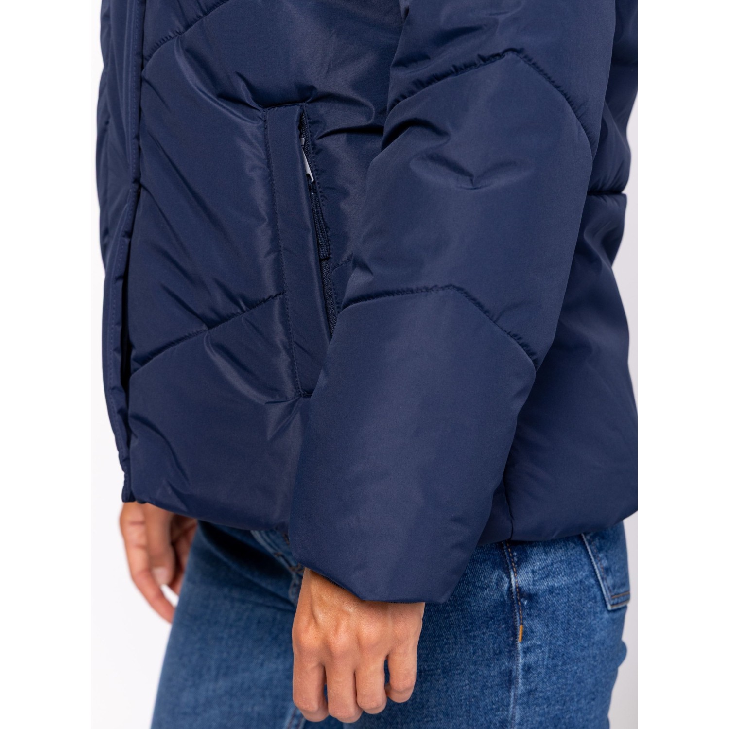 Női steppelt dzseki, egyenes szabással, csípőig érő hosszal, külső és belső szélfogóval, állítható, fix kapucnival, egyenes, cipzáros zsebekkel, bordás passzés kézelővel, kis márkajelzéssel az ujján, a kapucnin és az oldalában, nyomott márkajelzéssel a belső szélfogón. Anyaga: külső: 100% poliészter, bélés: 100% poliészter, tömés: 100% poliészter. A modell 175 cm magas és S-es méretet visel.