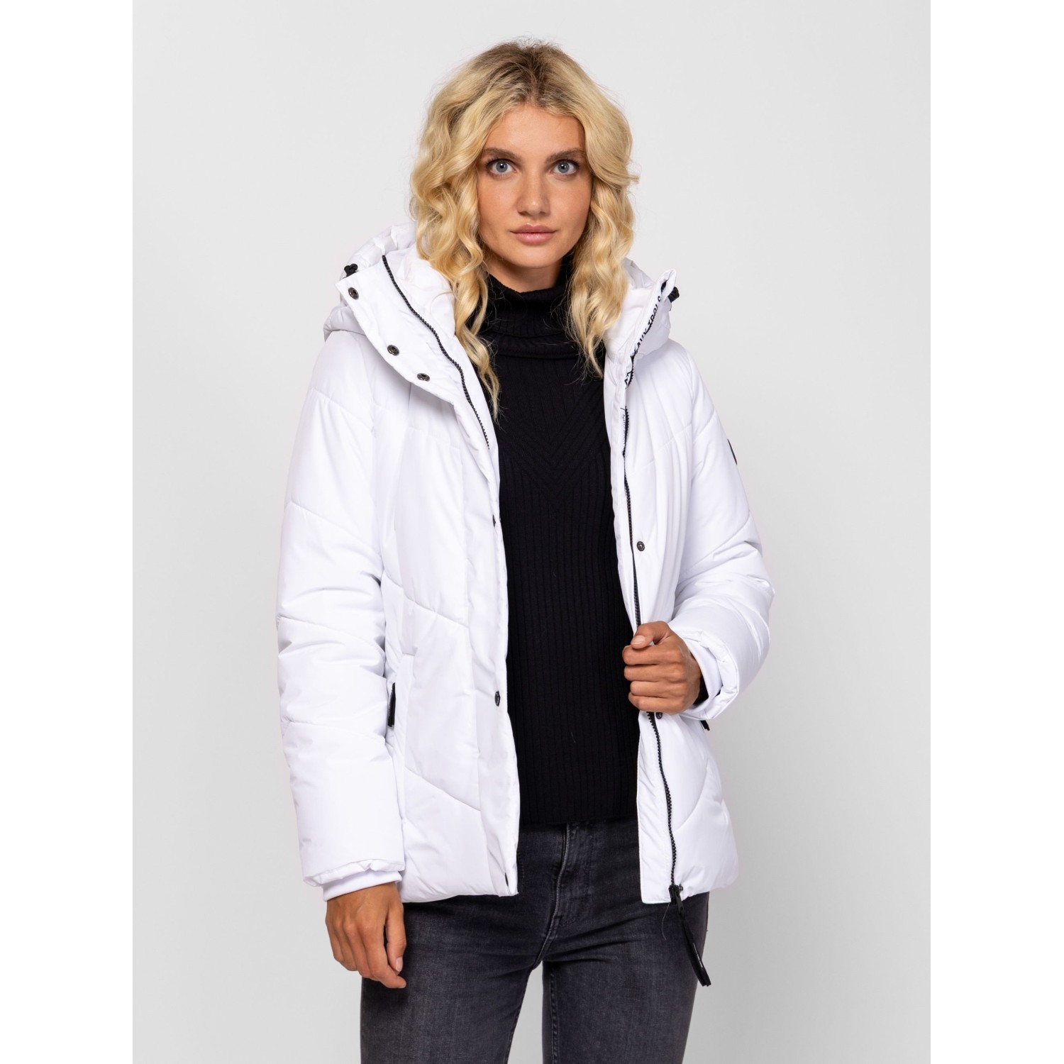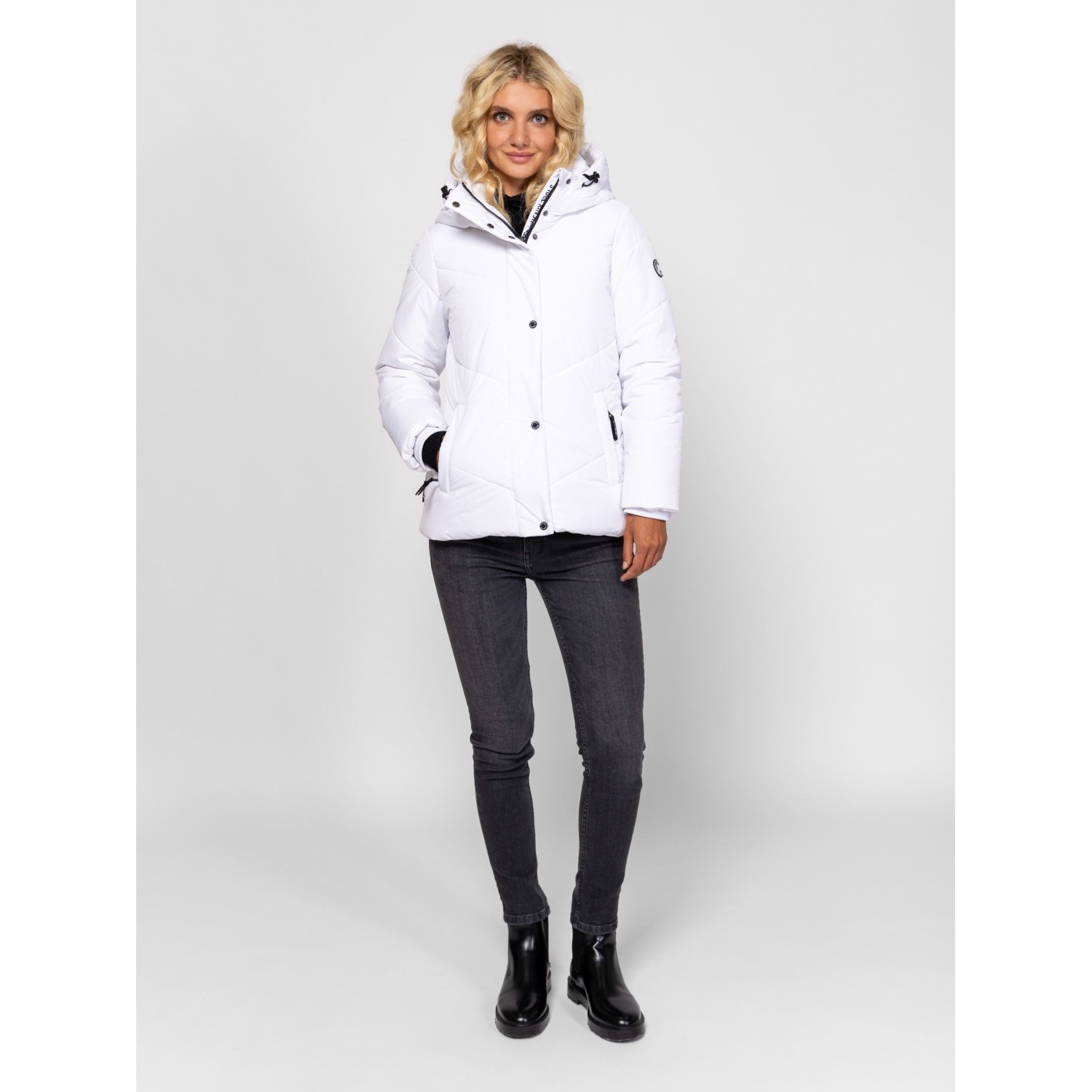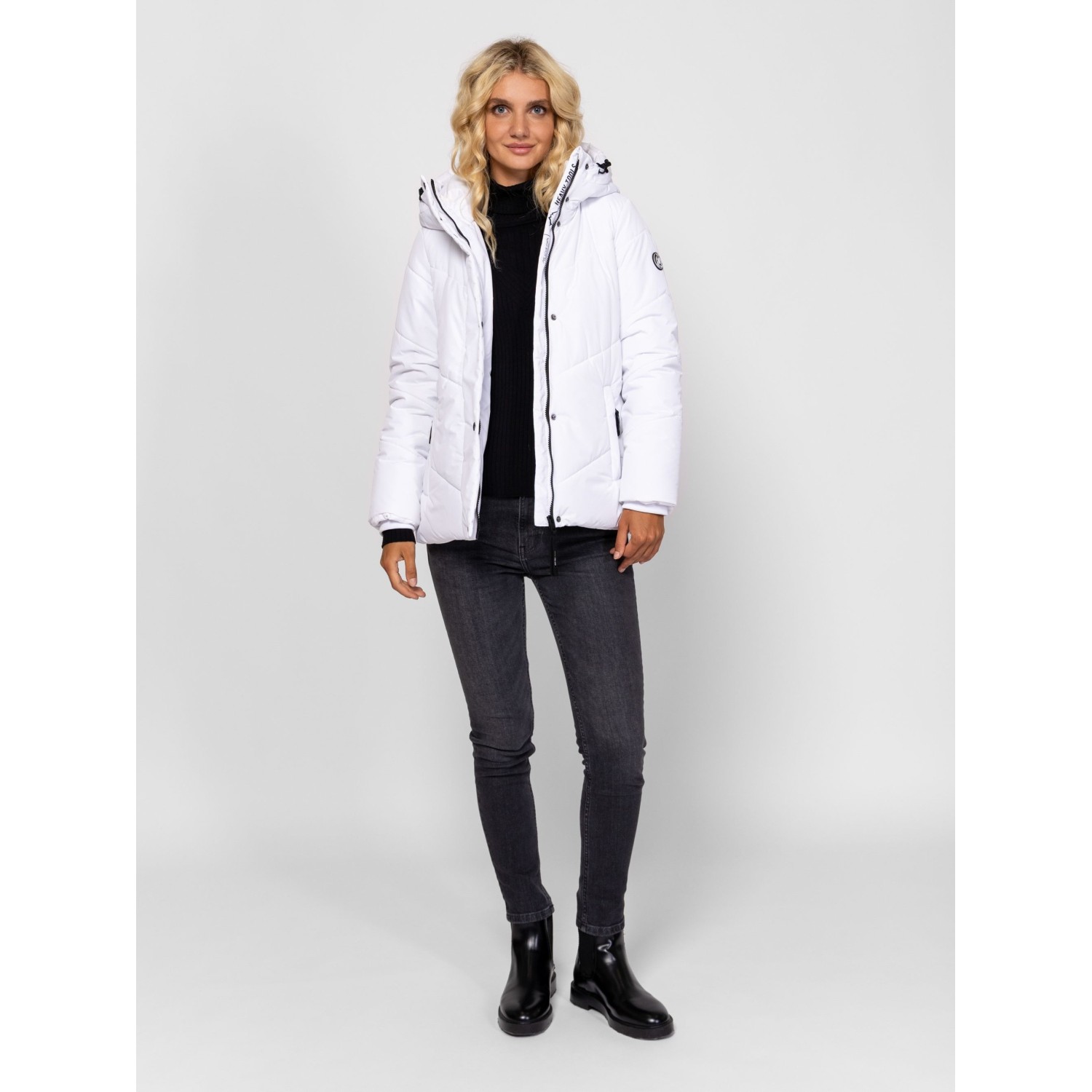 Női steppelt dzseki, egyenes szabással, csípőig érő hosszal, külső és belső szélfogóval, állítható, fix kapucnival, egyenes, cipzáros zsebekkel, bordás passzés kézelővel, kis márkajelzéssel az ujján, a kapucnin és az oldalában, nyomott márkajelzéssel a belső szélfogón. Anyaga: külső: 100% poliészter, bélés: 100% poliészter, tömés: 100% poliészter. A modell 175 cm magas és S-es méretet visel.