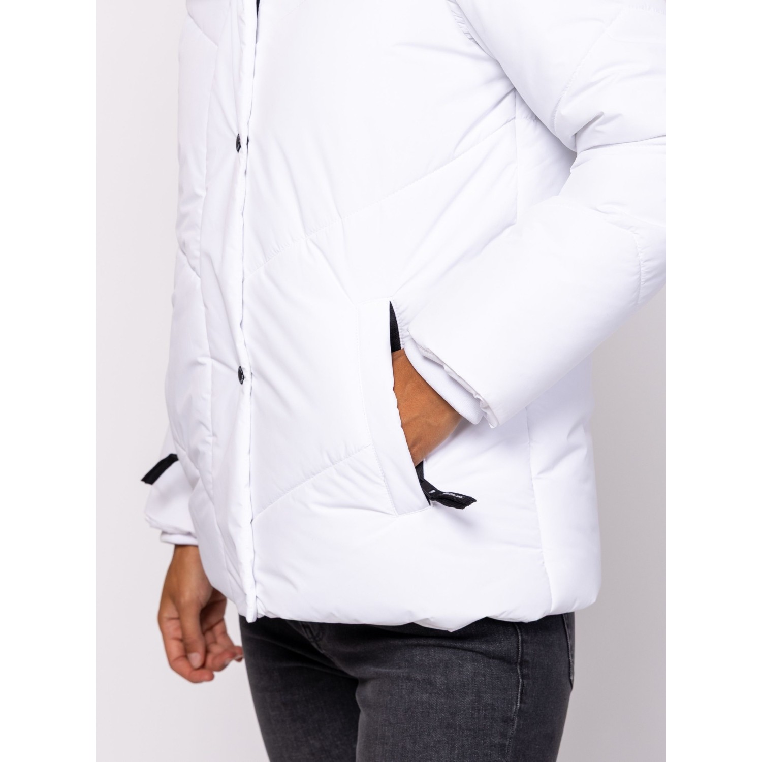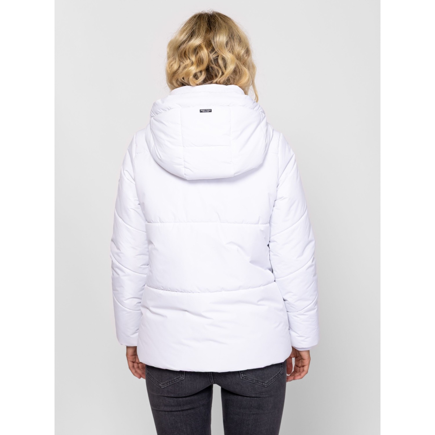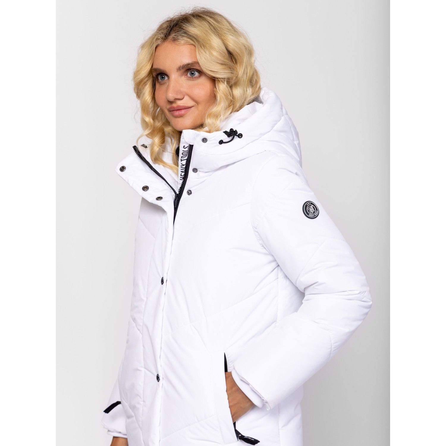 Női steppelt dzseki, egyenes szabással, csípőig érő hosszal, külső és belső szélfogóval, állítható, fix kapucnival, egyenes, cipzáros zsebekkel, bordás passzés kézelővel, kis márkajelzéssel az ujján, a kapucnin és az oldalában, nyomott márkajelzéssel a belső szélfogón. Anyaga: külső: 100% poliészter, bélés: 100% poliészter, tömés: 100% poliészter. A modell 175 cm magas és S-es méretet visel.