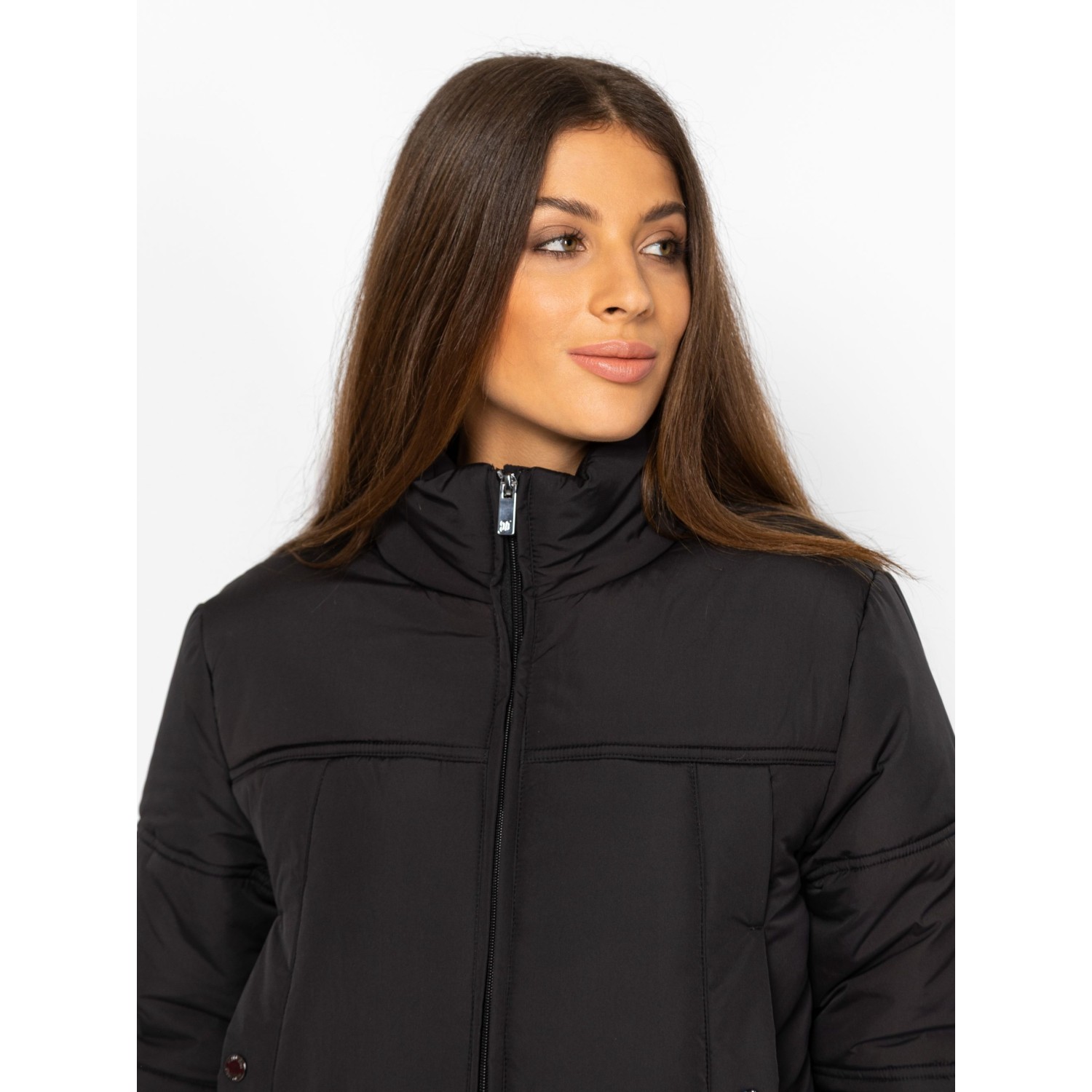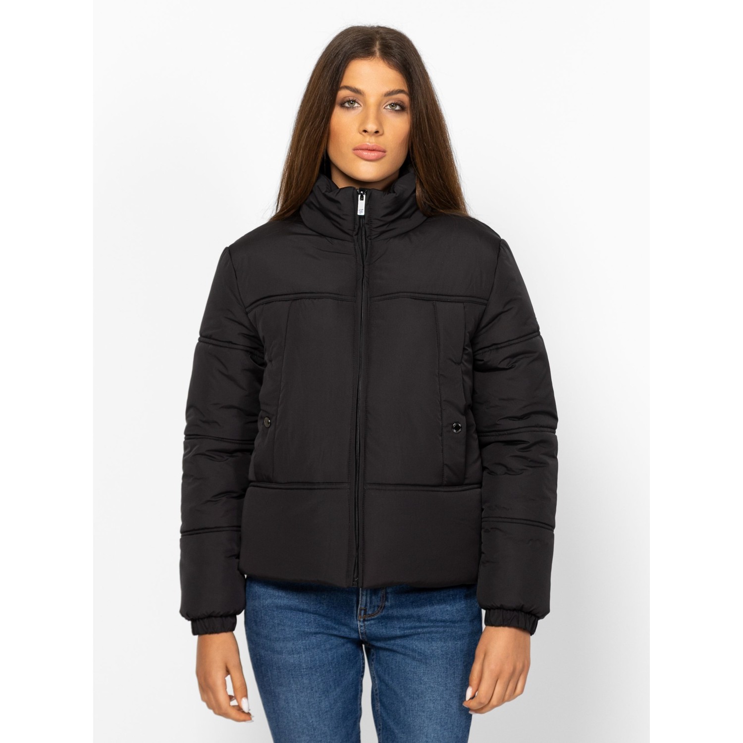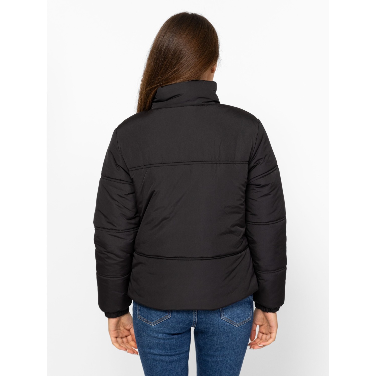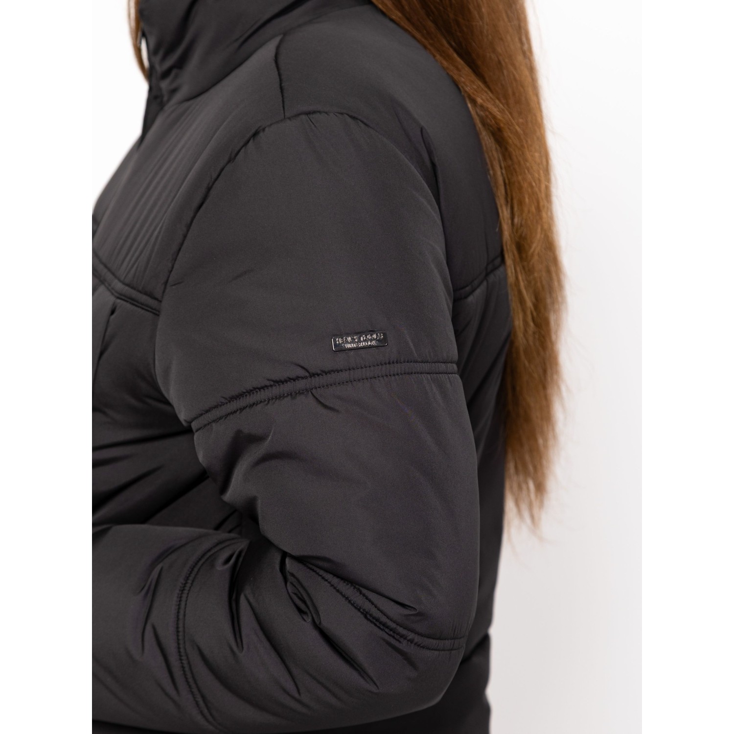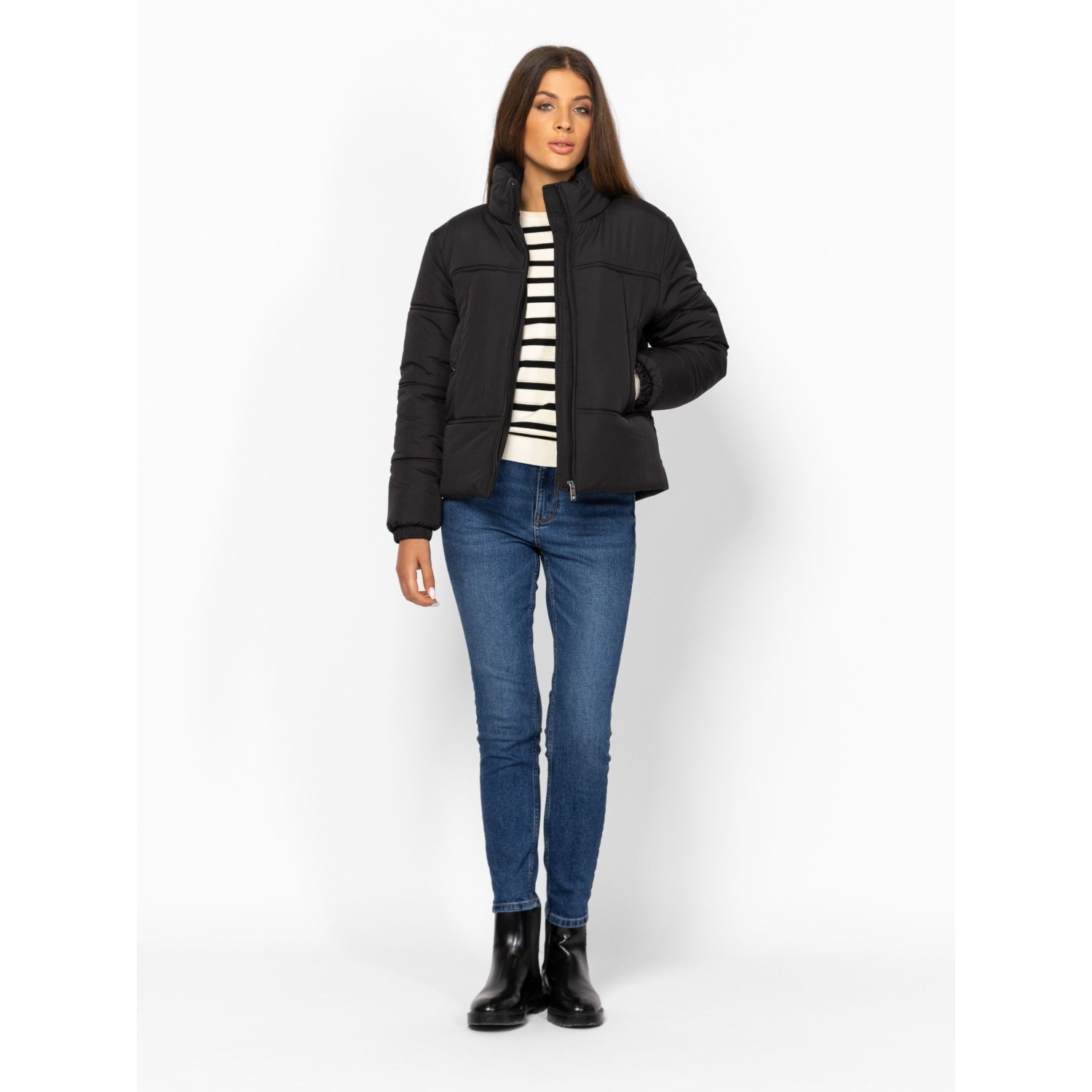 Női utcai steppelt dzseki, doboz szabással, derék alatti hosszal, belső szélfogóval, álló gallérral, gumírozott ujja aljával, patenttal záródó egyenes zsebekkel, kis fém márkajelzéssel az ujján. Anyaga: külső: 100% poliészter, bélés: 100% poliészter, tömés: 100% poliészter. A modell 175 cm magas és S-es méretet visel.