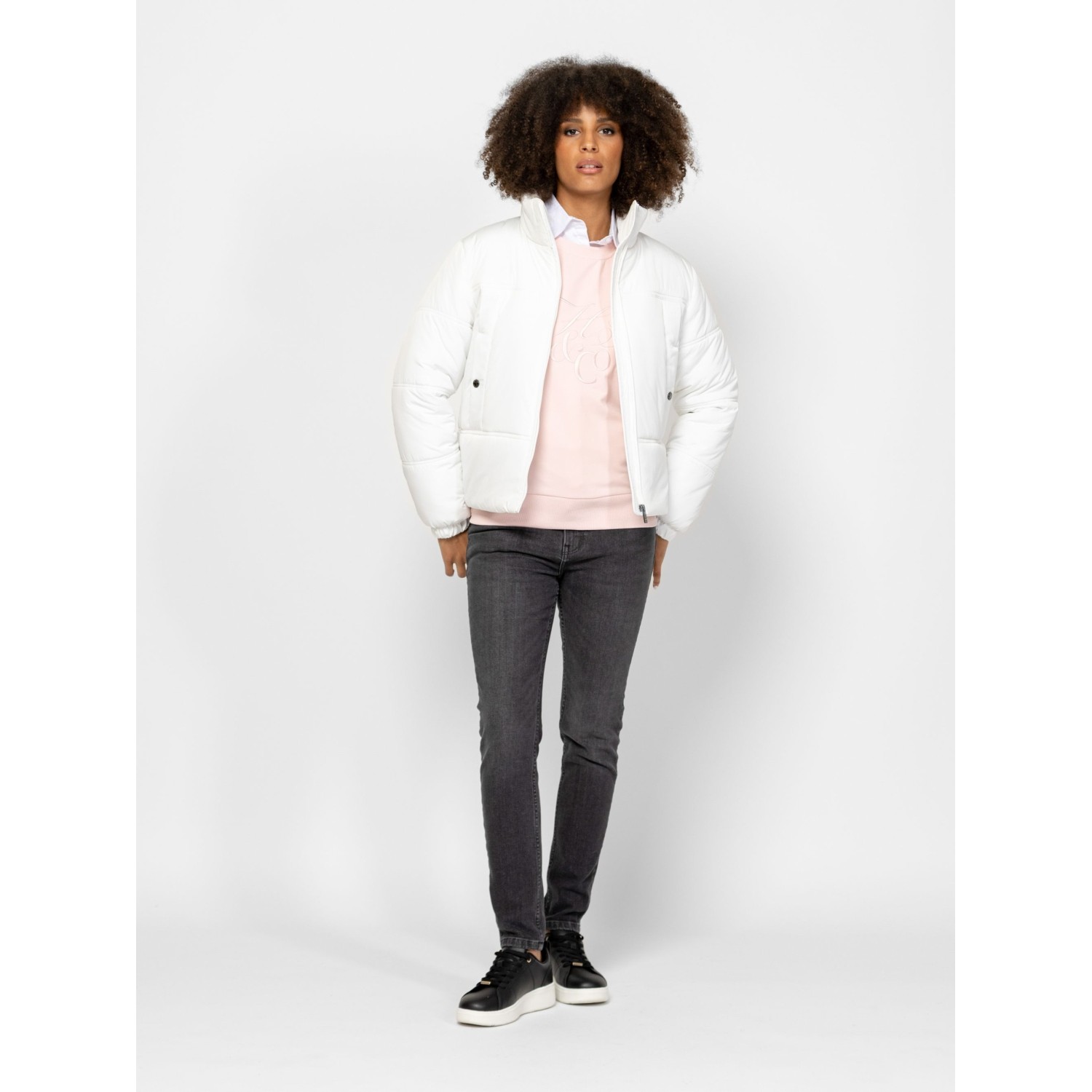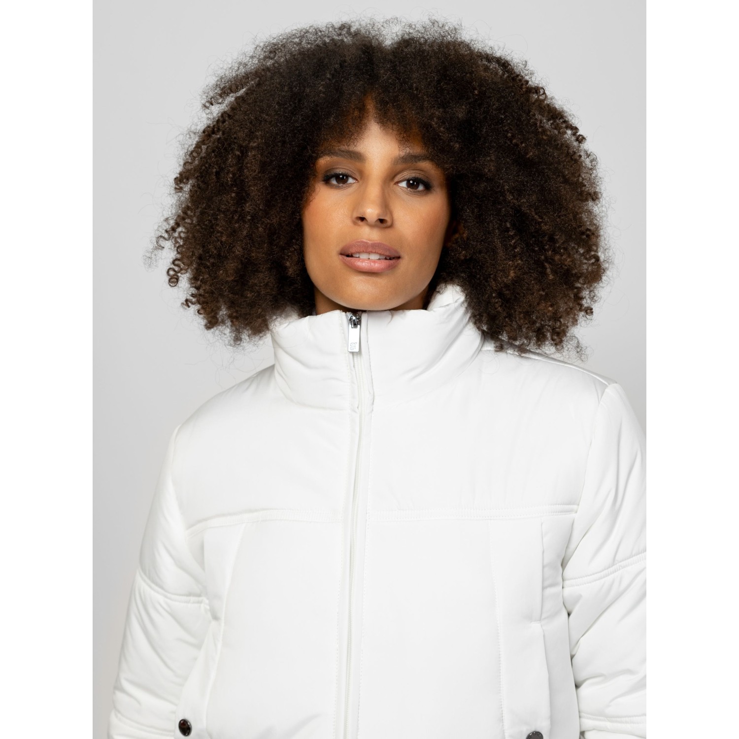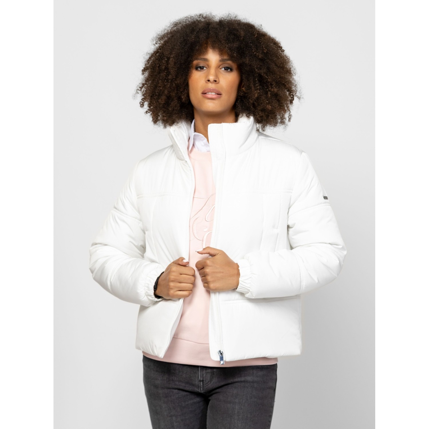Női utcai steppelt dzseki, doboz szabással, derék alatti hosszal, belső szélfogóval, álló gallérral, gumírozott ujja aljával, patenttal záródó egyenes zsebekkel, kis fém márkajelzéssel az ujján. Anyaga: külső: 100% poliészter, bélés: 100% poliészter, tömés: 100% poliészter. A modell 175 cm magas és S-es méretet visel.