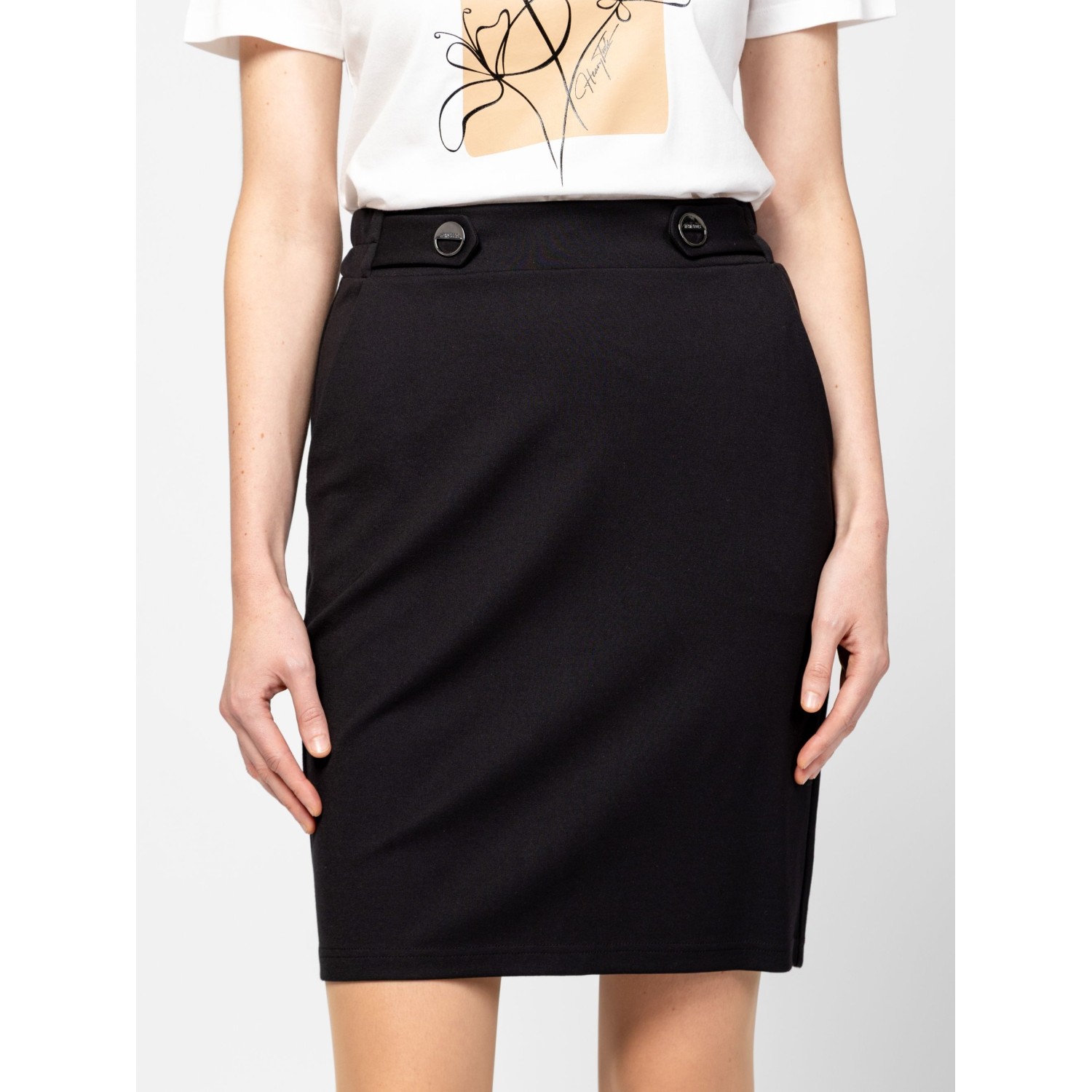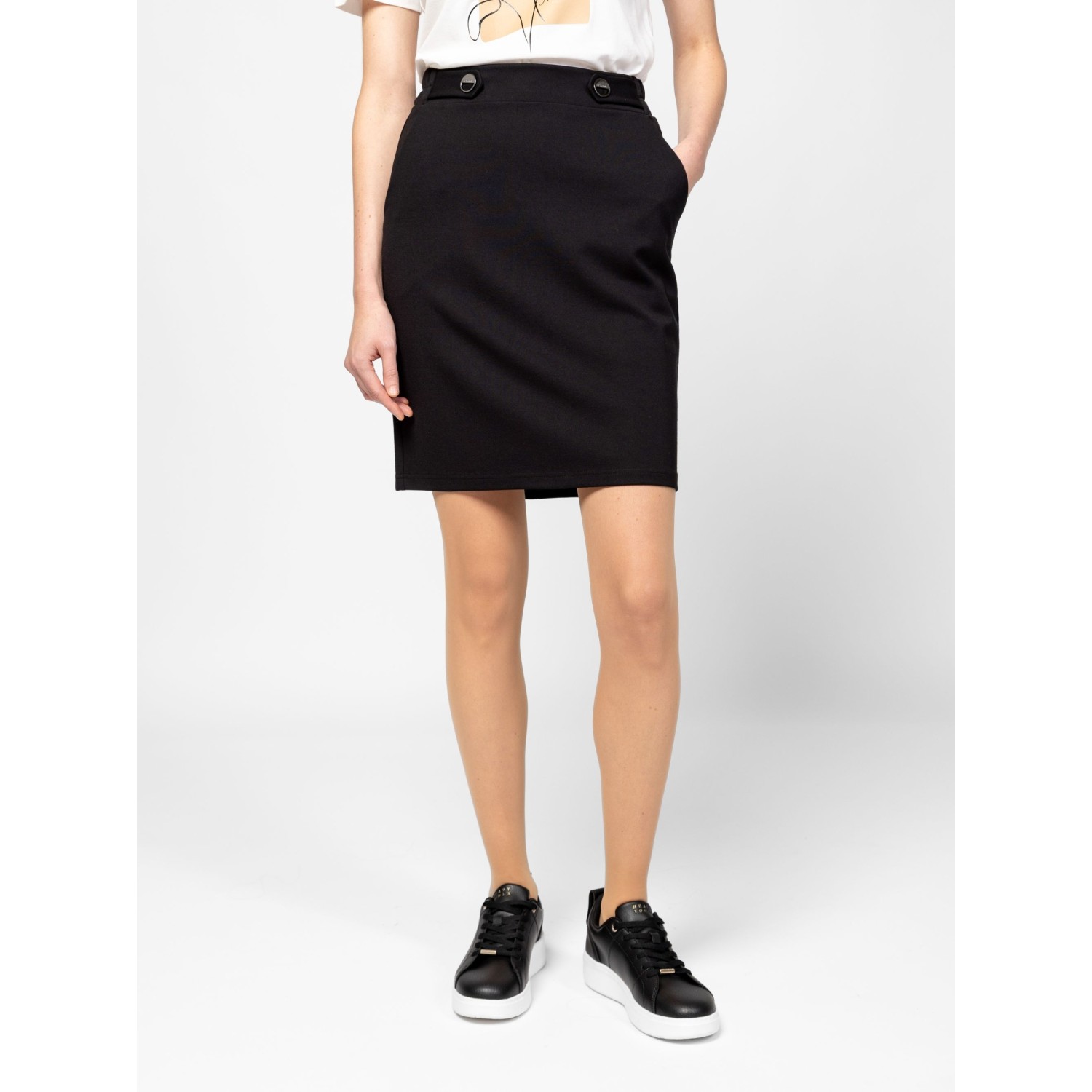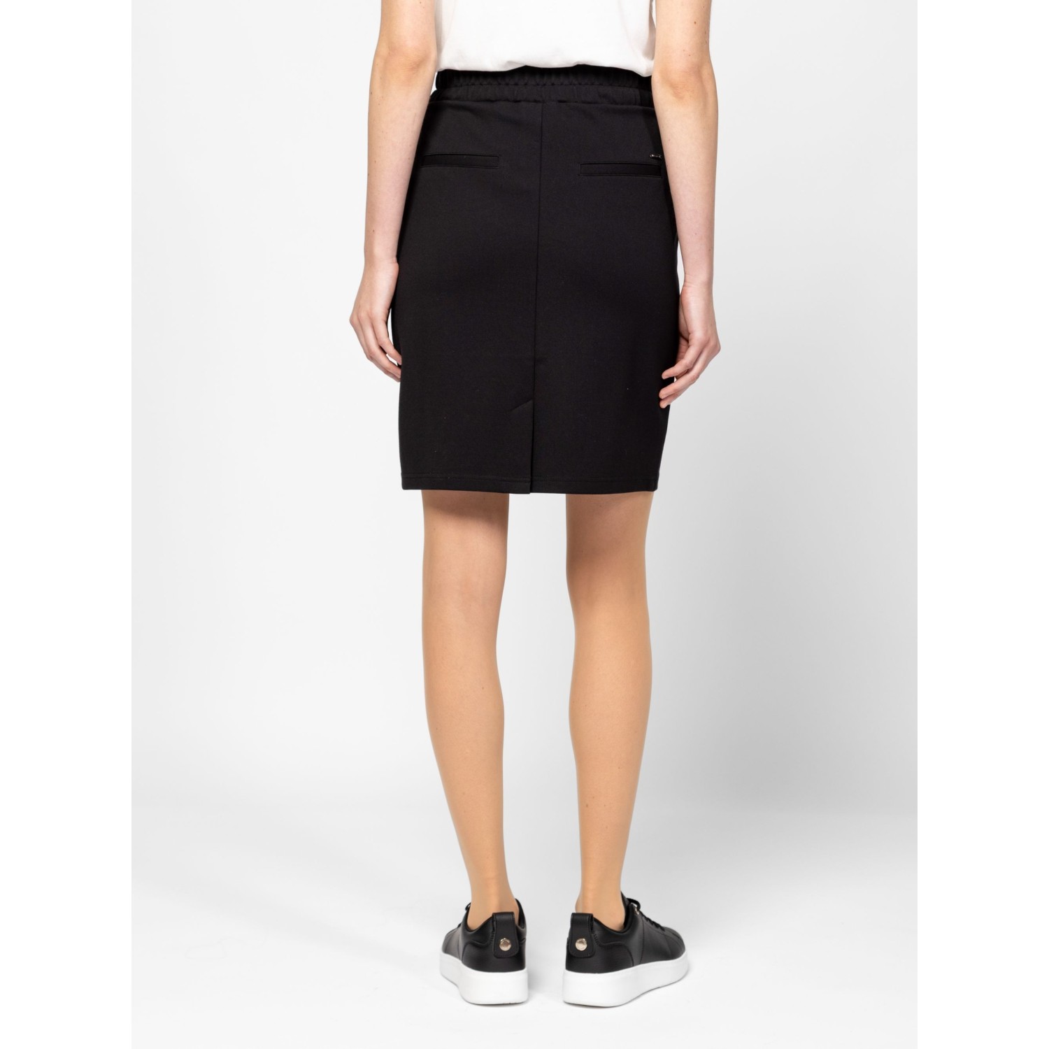 Női szoknya, egyenes szabással, térd feletti hosszal, oldalán zsebekkel, gumírozott derékkal, hátán díszzsebekkel és hasítékkal, magas viszkóztartalmú, könnyen kezelhető anyagból, logózott fém gombokkal a derekán. Anyaga: 63% viszkóz, 32% nylon, 5% elasztán. A modell 175 cm magas és S-es méretet visel.