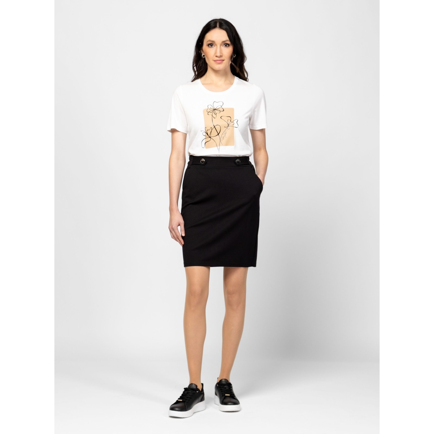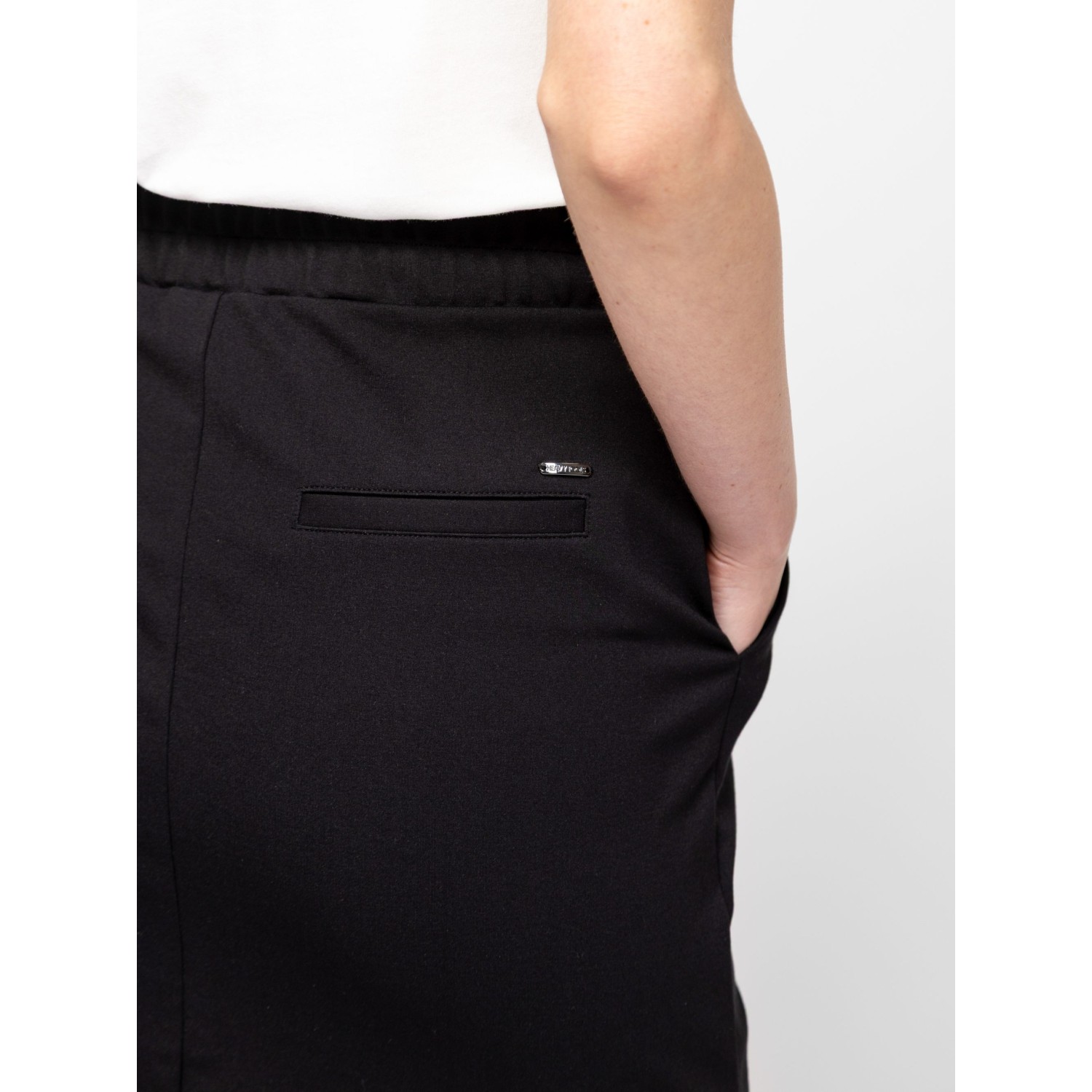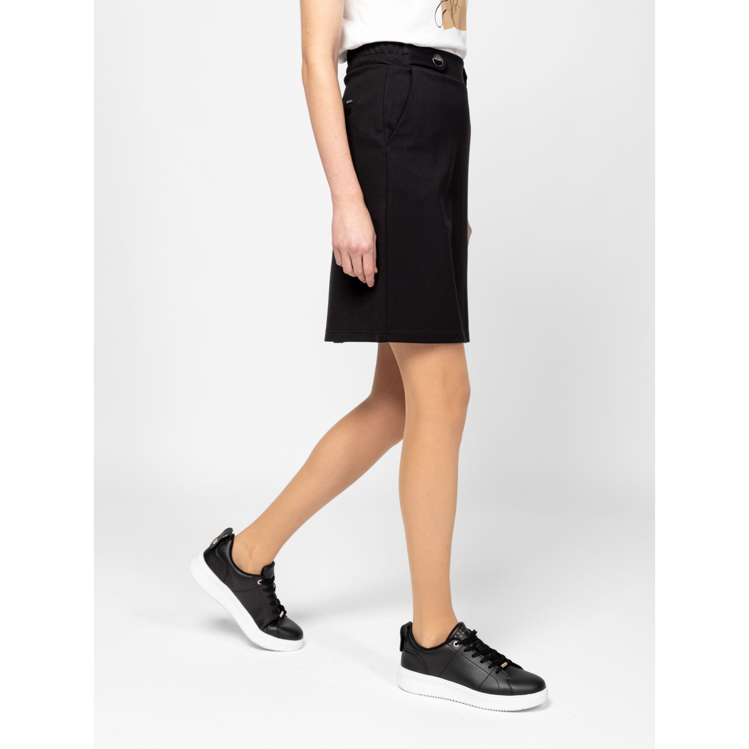 Női szoknya, egyenes szabással, térd feletti hosszal, oldalán zsebekkel, gumírozott derékkal, hátán díszzsebekkel és hasítékkal, magas viszkóztartalmú, könnyen kezelhető anyagból, logózott fém gombokkal a derekán. Anyaga: 63% viszkóz, 32% nylon, 5% elasztán. A modell 175 cm magas és S-es méretet visel.