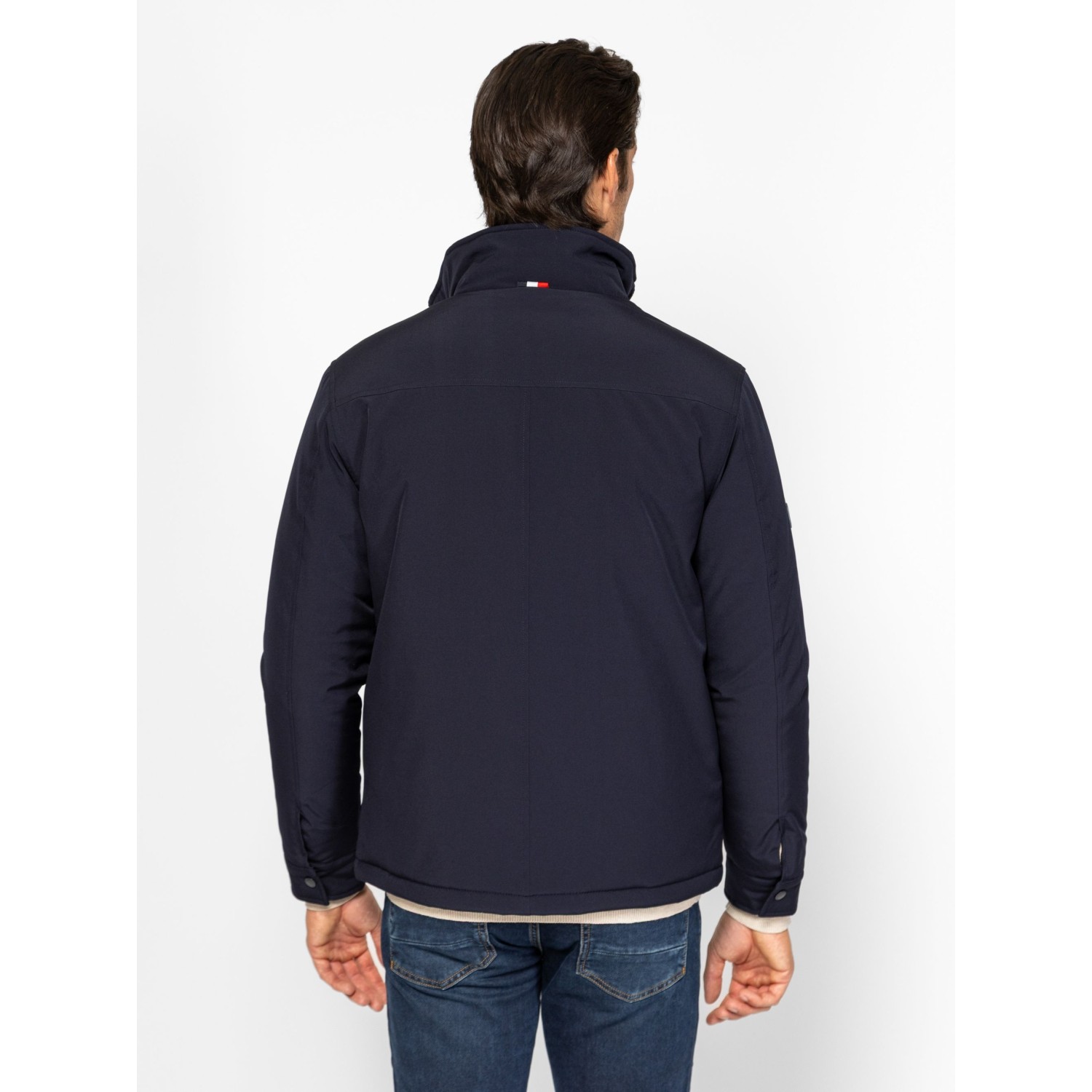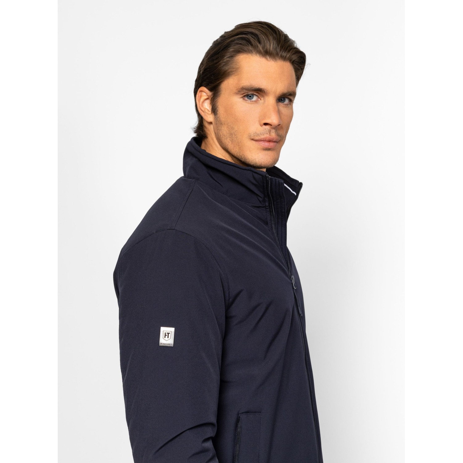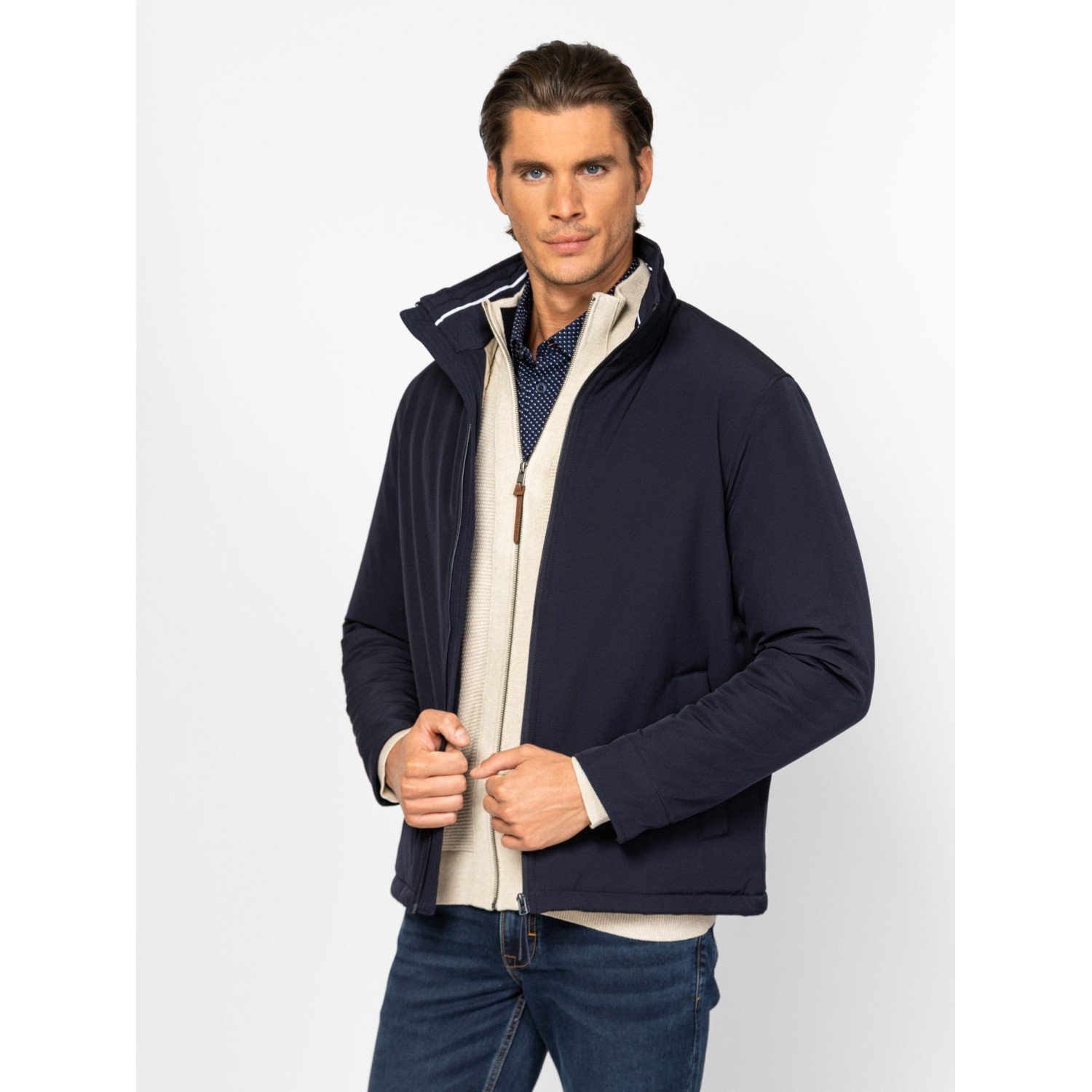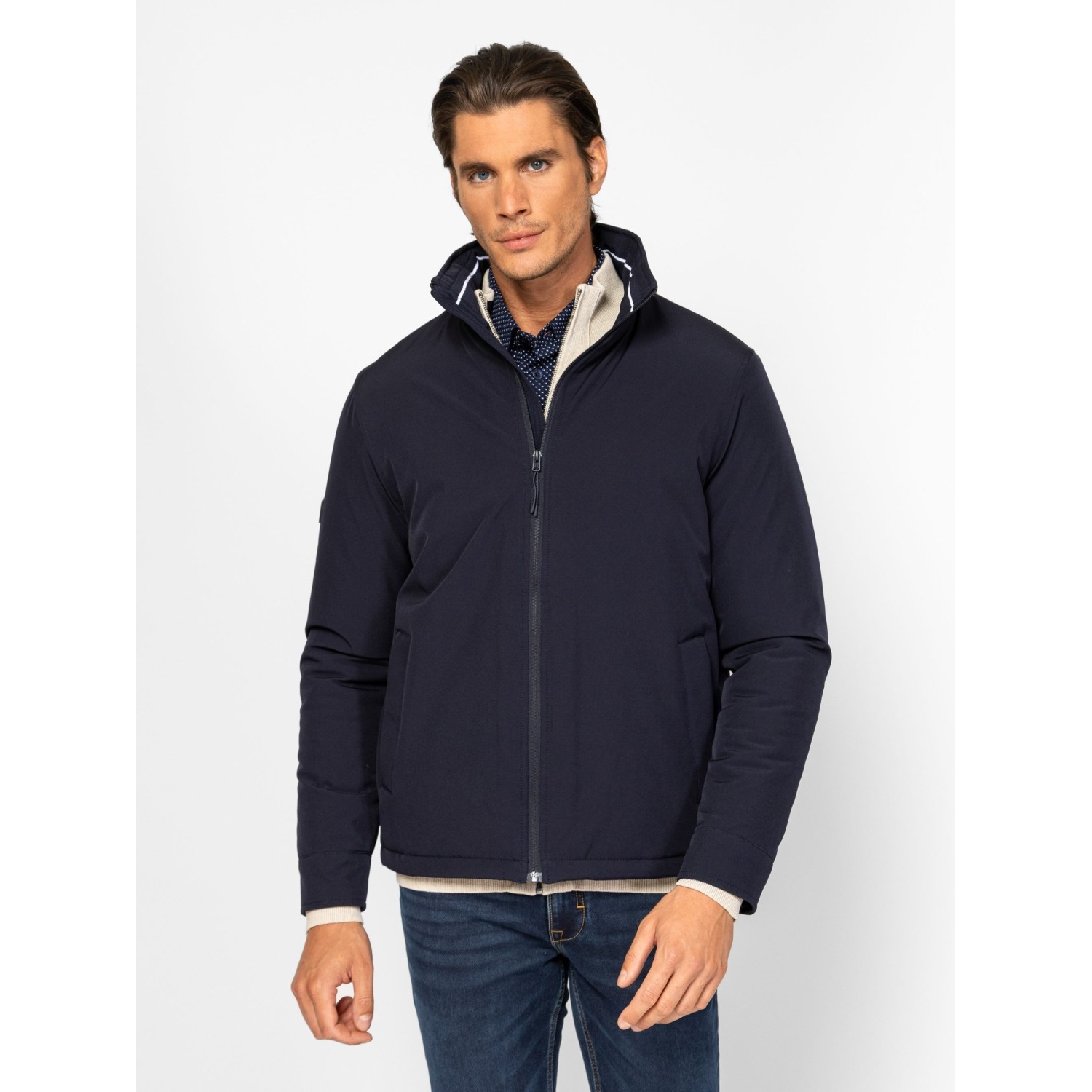 Férfi dzseki, klasszikus színekben, rövid állású, kényelmes fazonnal, cipzáras záródással, állítható aljjal, patentos kézelővel. Elején cipzáros zsebekkel, belső zsebbekkel, ujján kis fém márkajelzéssel. Anyaga: külső: 100% poliészter, bélés: 100% poliészter, tömés: 100% poliészter. A modell 188 cm magas és L-es méretet visel.