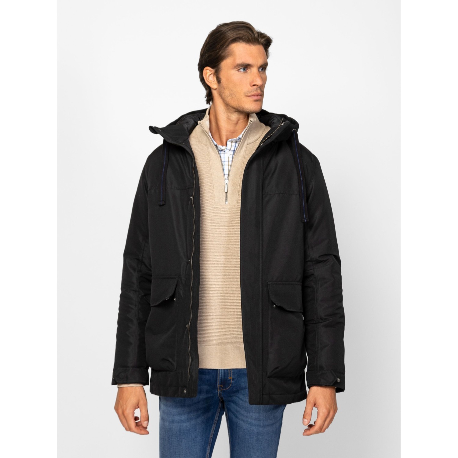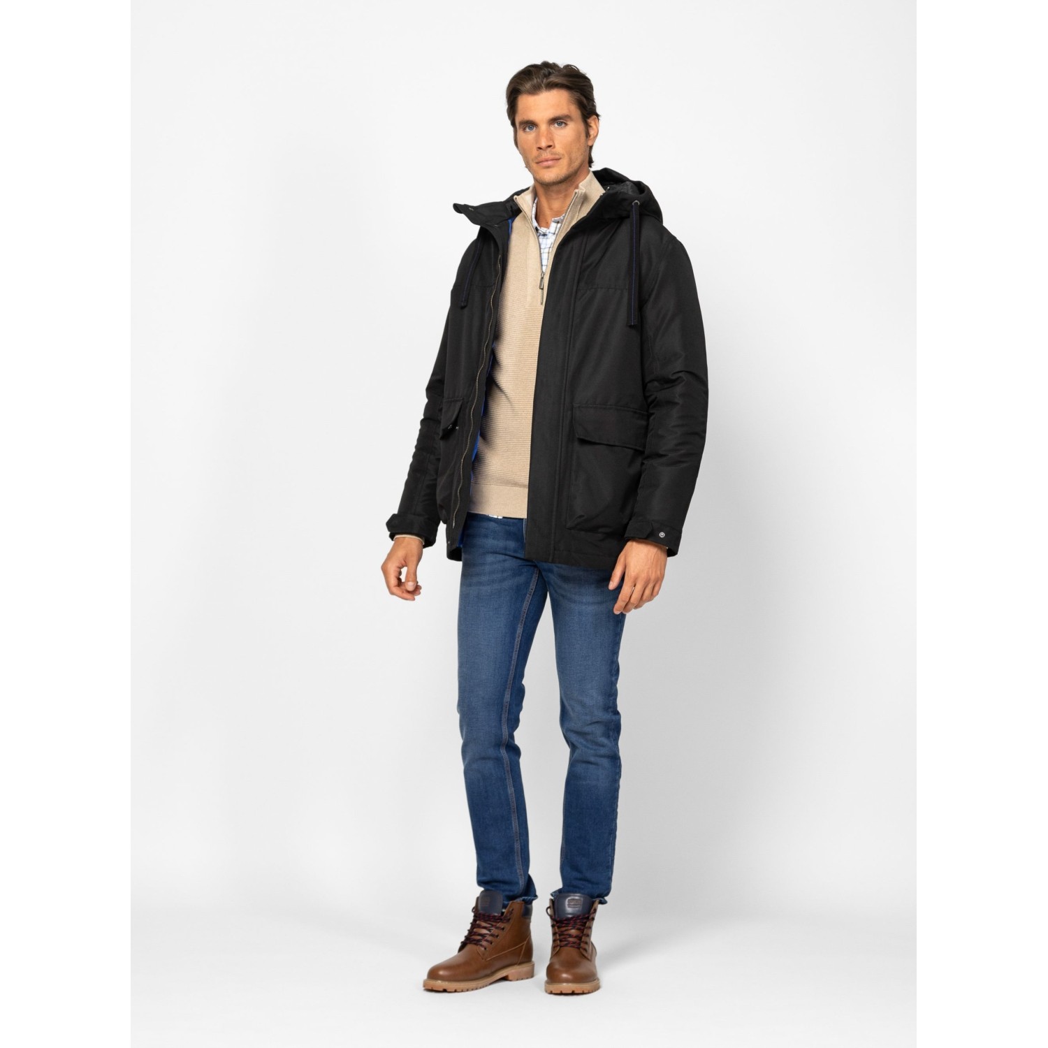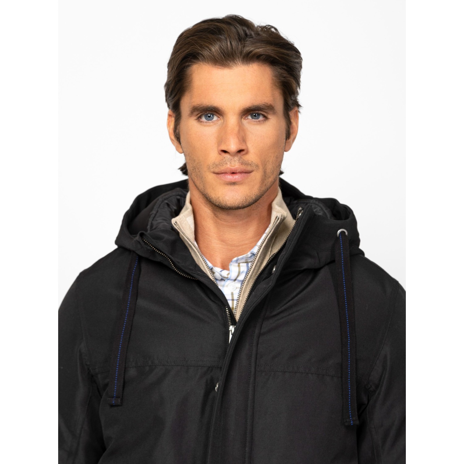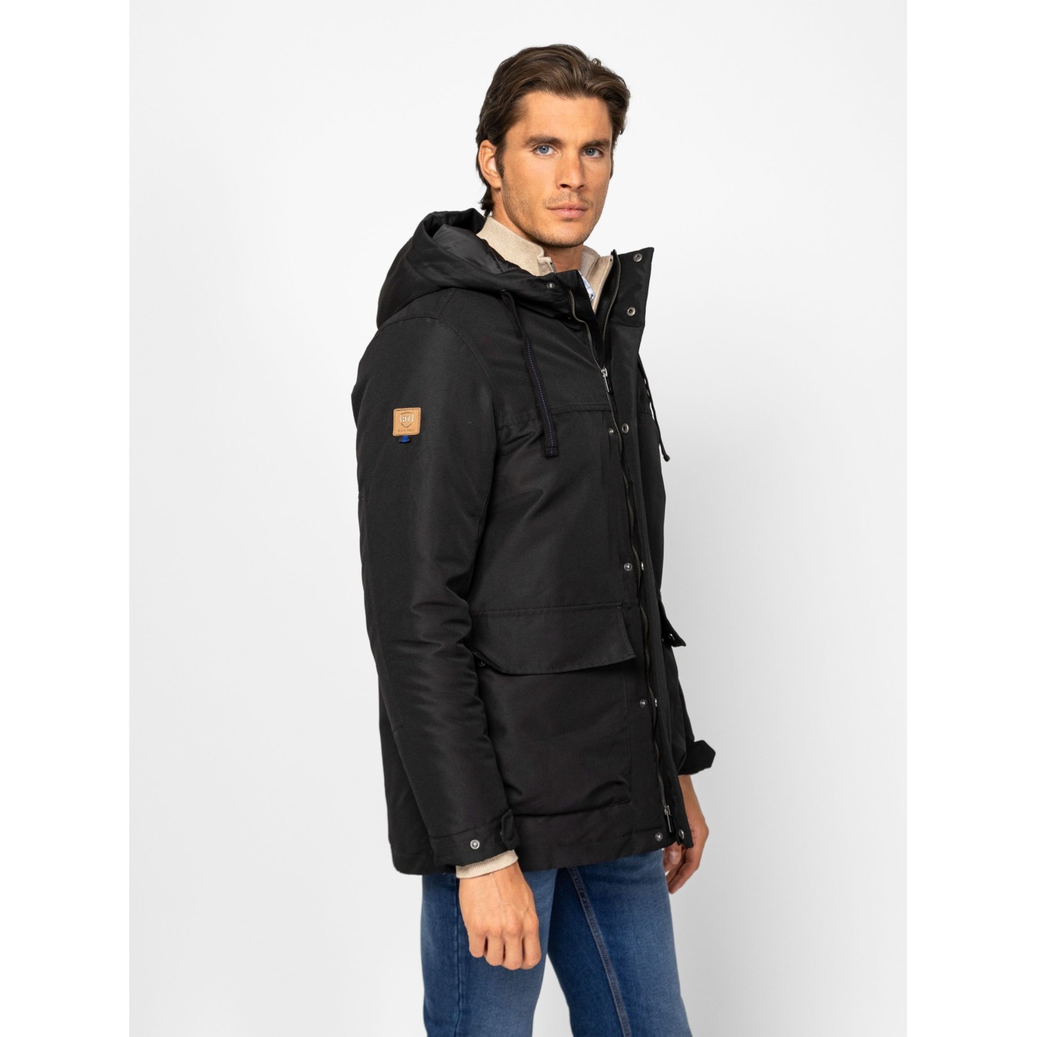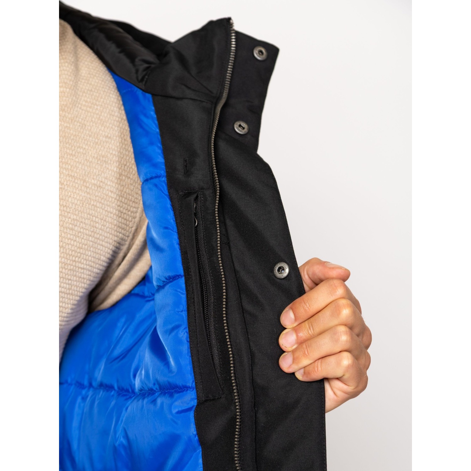 Férfi télikabát, vízálló anyagból, ragasztott varratokkal, steppelt béléssel, két irányban állítható, fix kapucnival, állítható ujja bőséggel, cipzáros záródással, külső és belső szélfogóval. Elején több funkciós nagy foltzsebbel, belül cipzáros belső zsebbel, ujján kis bőr dombornyomott márkajelzéssel. Anyaga: külső: 100% poliészter, bélés: 100% poliészter, tömés: 100% poliészter. Vízállóság: 10000 mm/24h, lélegzőképesség: 2000 gr/m2/24h. A modell 188 cm magas és L-es méretet visel.