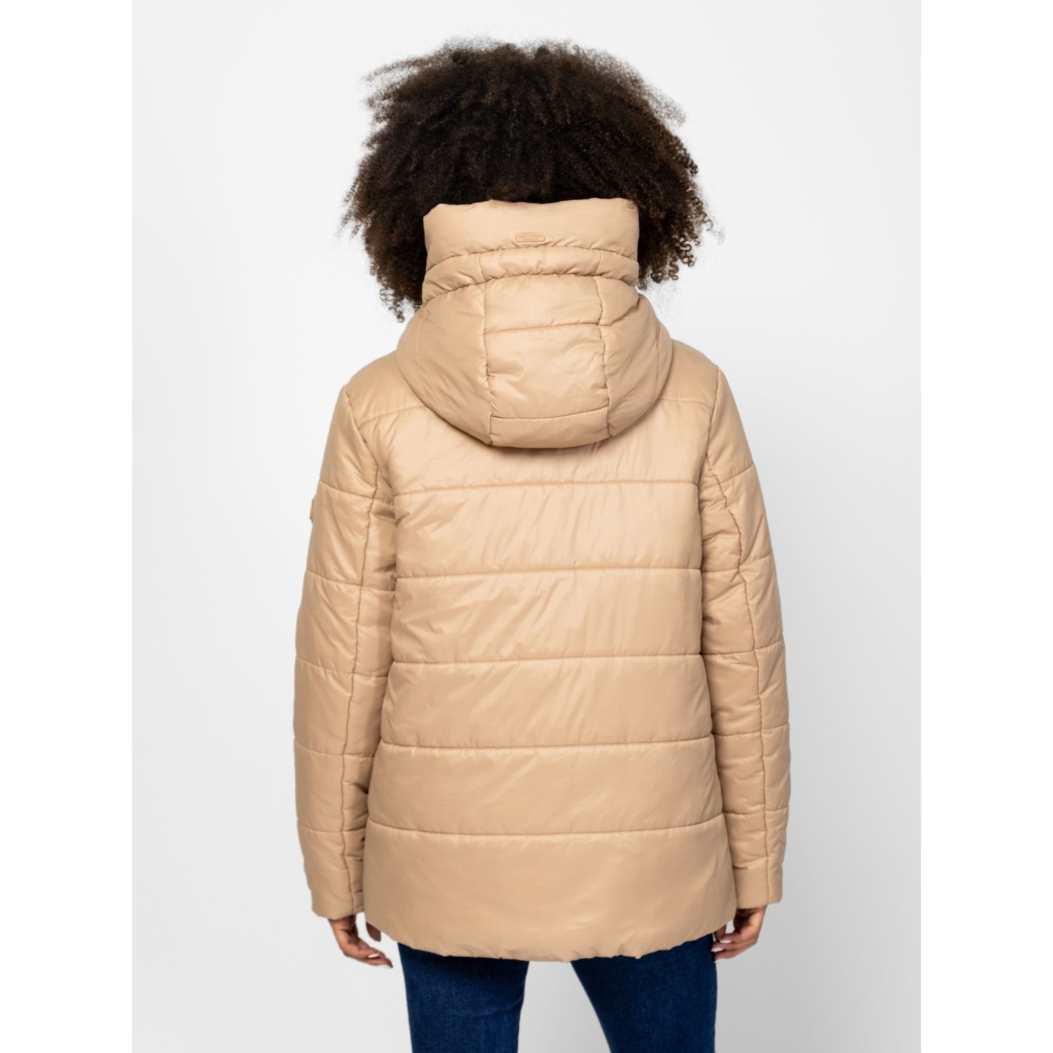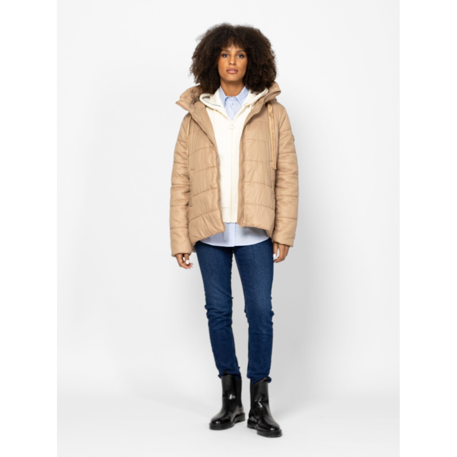 Női utcai steppelt dzseki, bővebb szabással, csípőig érő hosszal, belső szélfogóval, fix kapucnival, egyenes zsebekkel, kis fém márkajelzéssel az ujján és a kapucnin. Anyaga: külső: 100% nylon, bélés: 100% nylon, tömés: 100% poliészter. A modell 175 cm magas és S-es méretet visel.