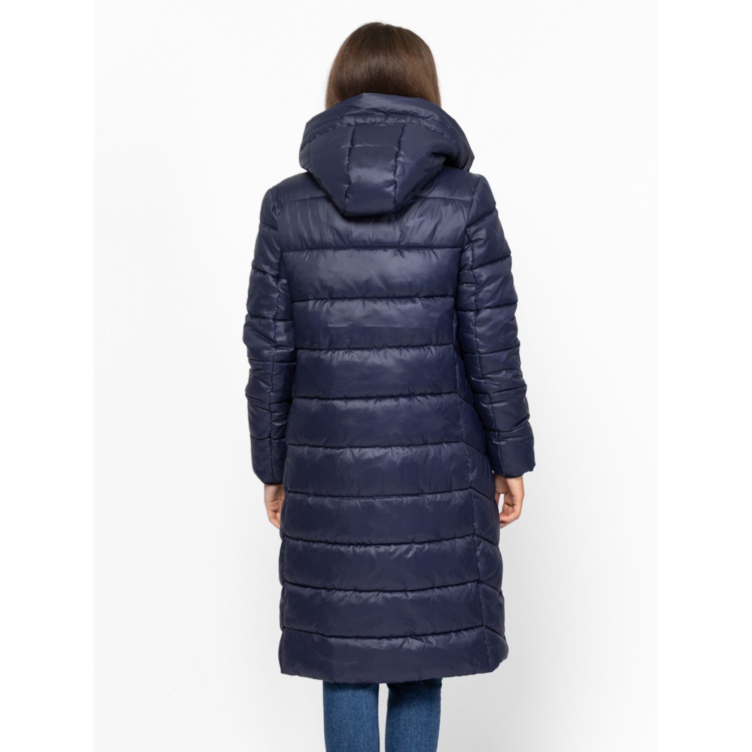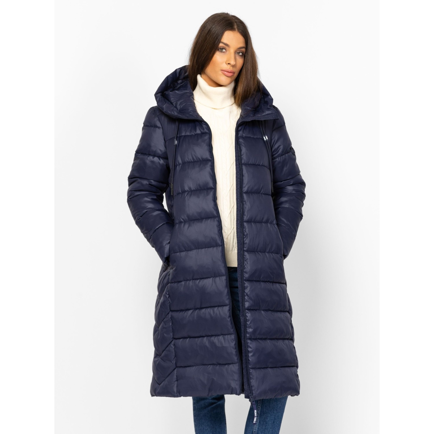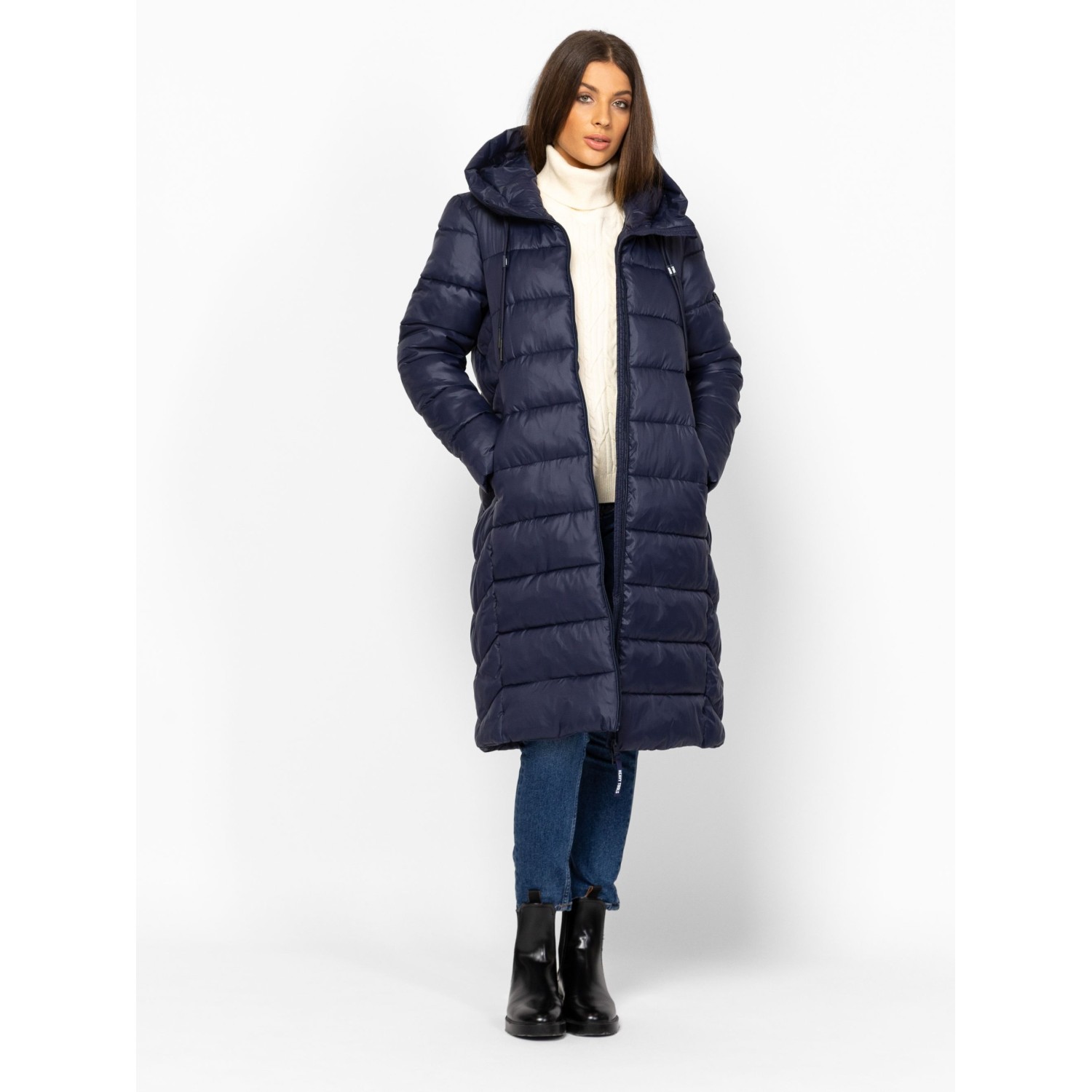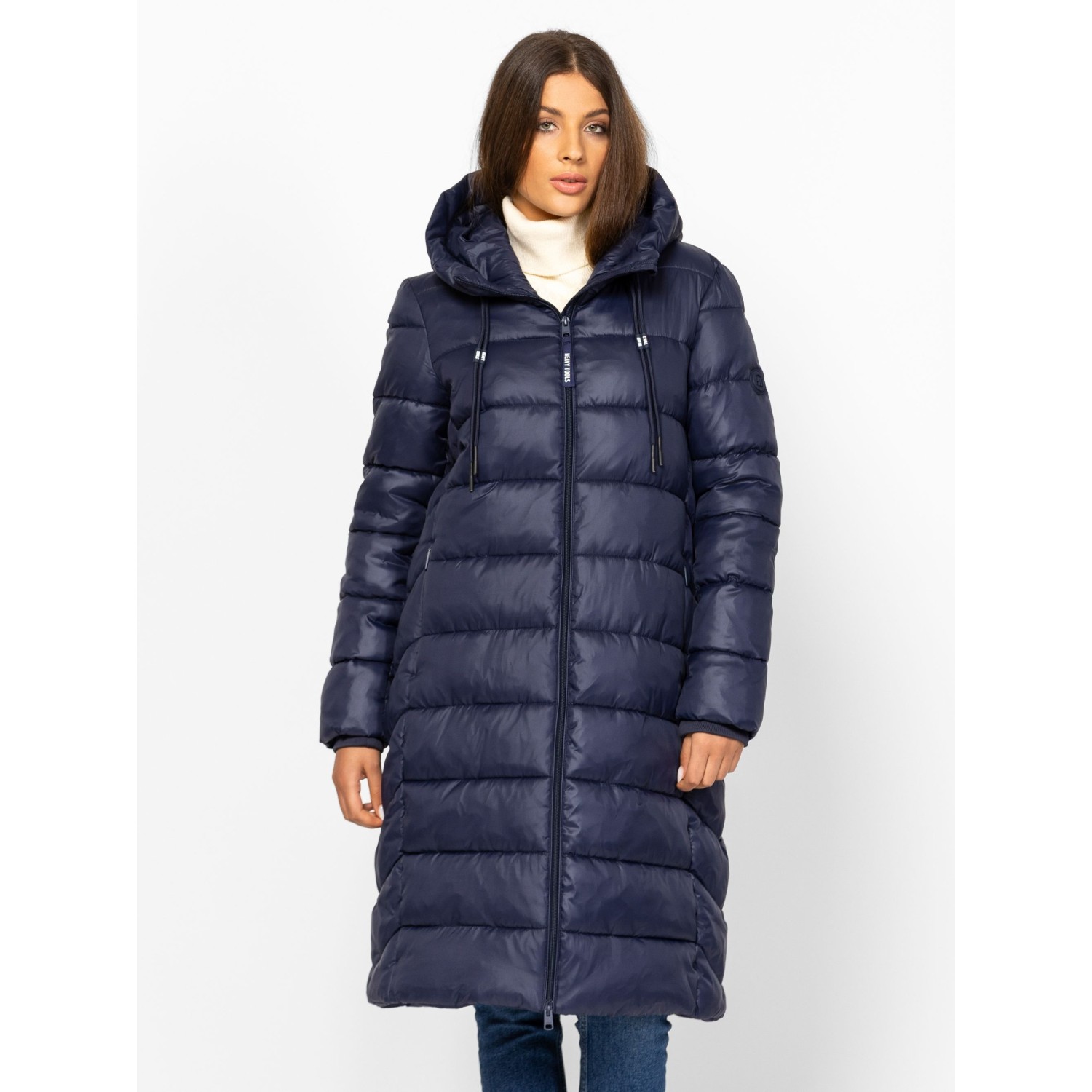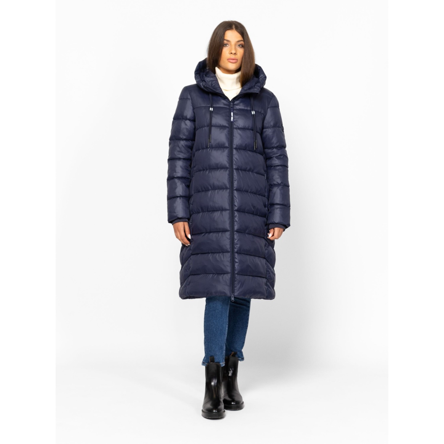 Női utcai steppelt télikabát, bővebb szabással, térdig érő hosszal, belső szélfogóval, fix, állítható kapucnival, szabásvonalba helyezett rejtett cipzáros zsebekkel, bordás passzés kézelővel az ujja alján, kis márkajelzéssel az ujján és a kapucniján. Anyaga: külső: 100% nylon, bélés: 100% poliészter, tömés: 100% poliészter. A modell 175 cm magas és S-es méretet visel.