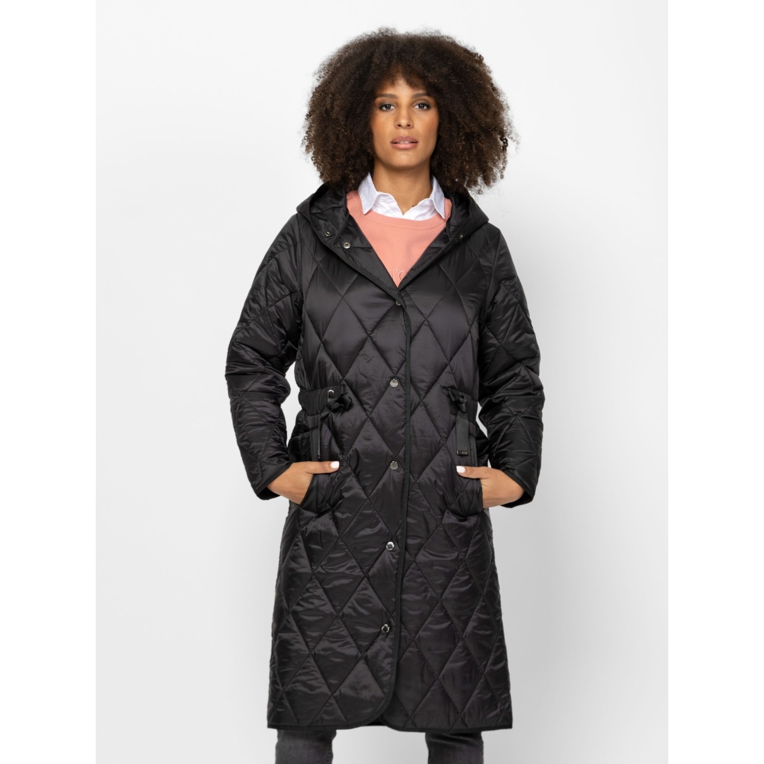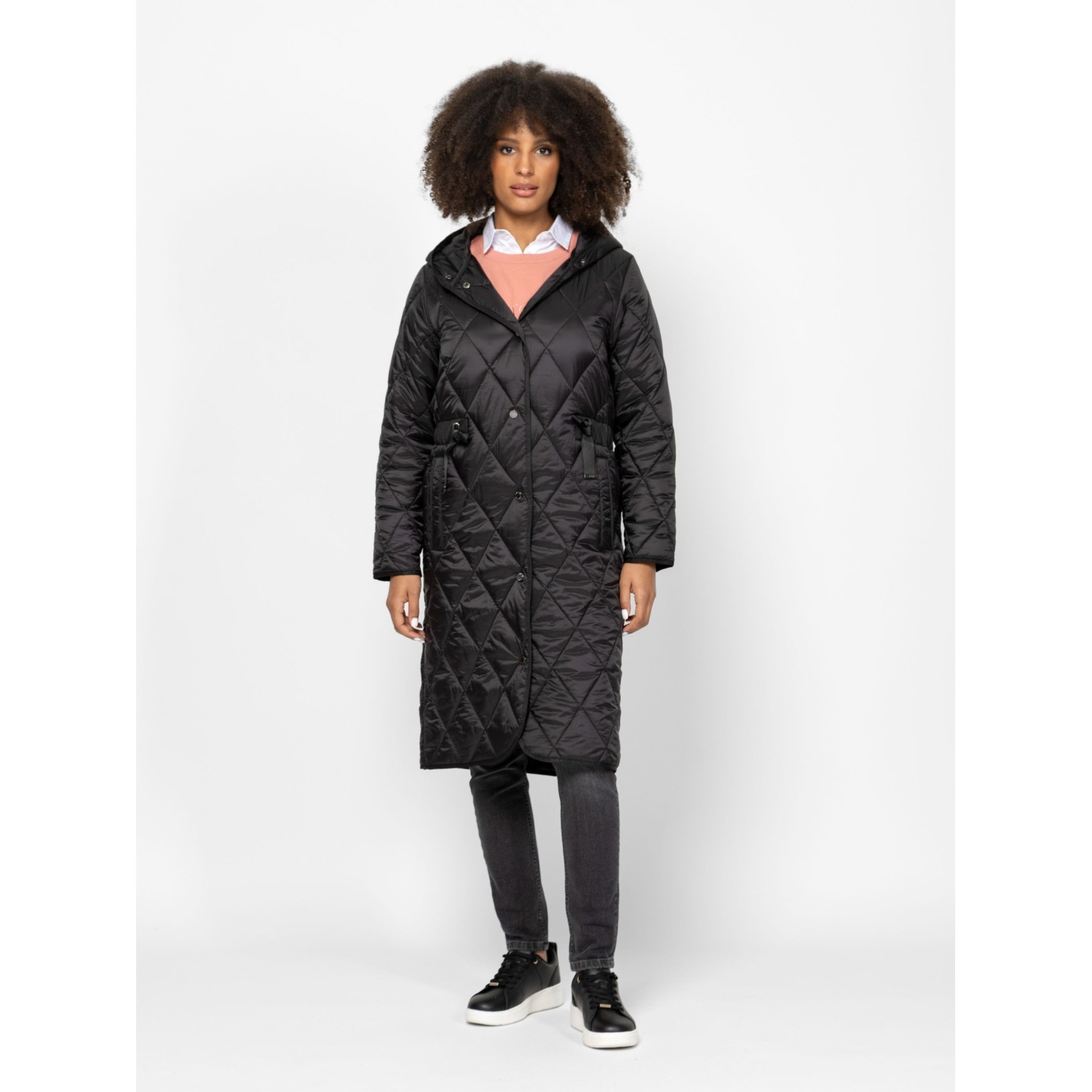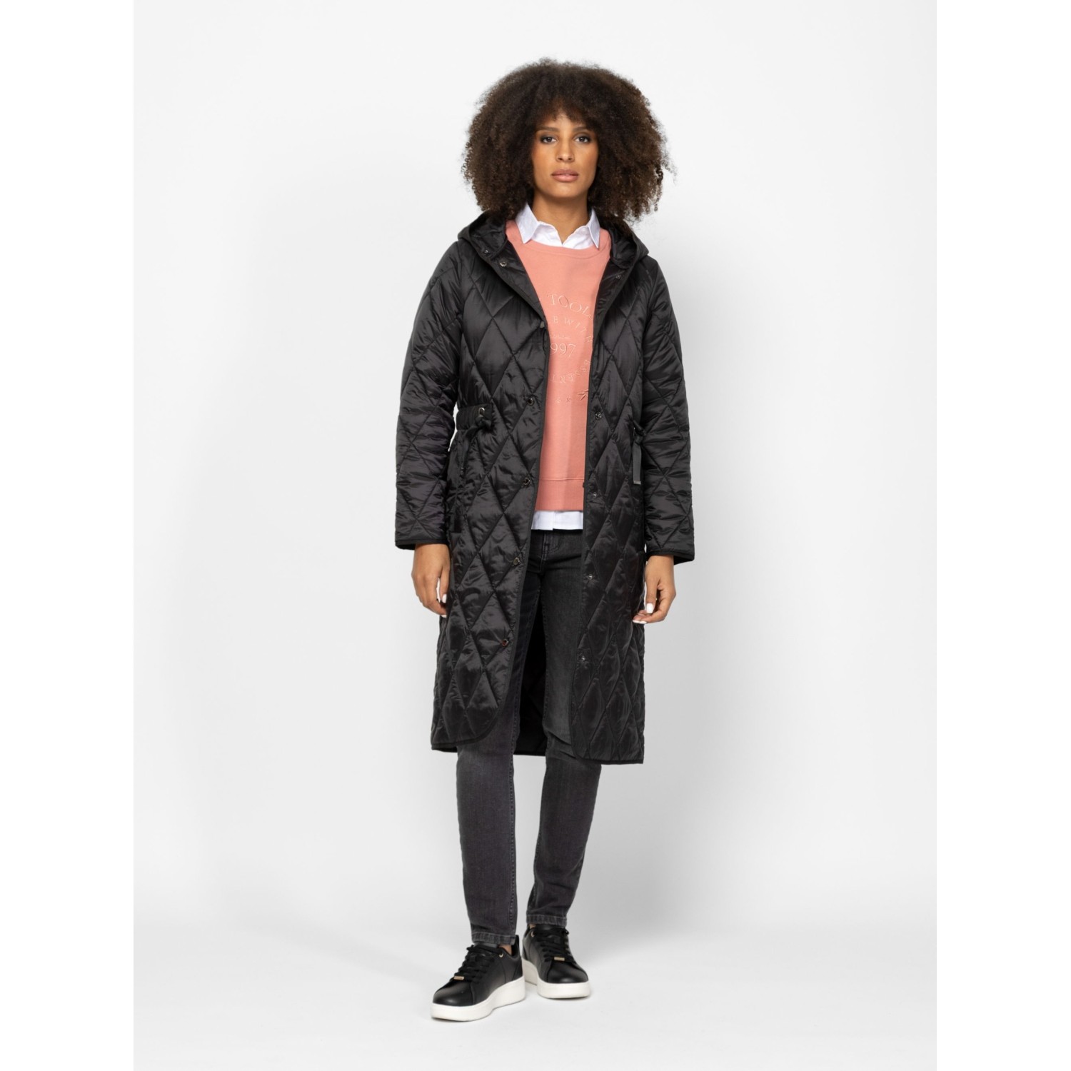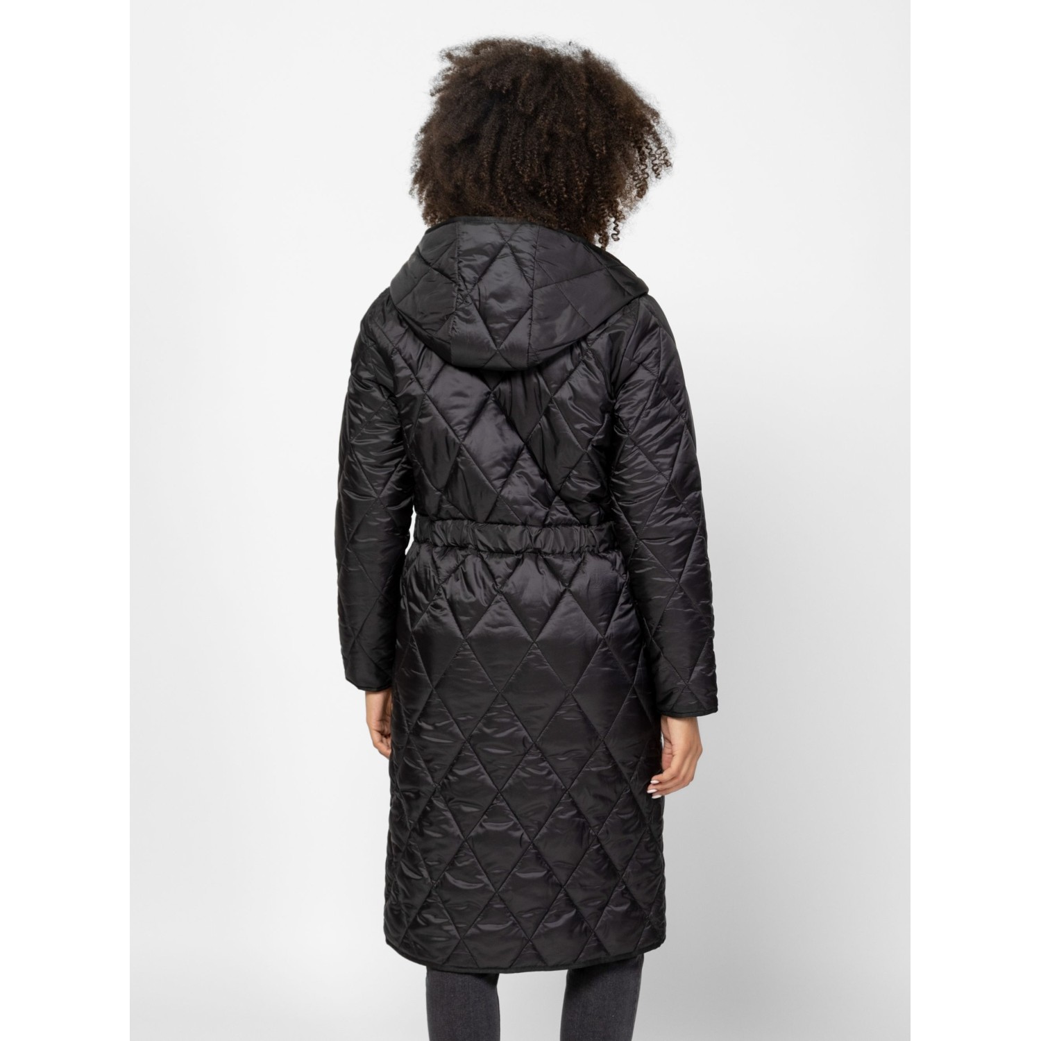 Női átmeneti kabát sikkes, steppelt anyagból, klasszikus színekben, trendi szabással, térdig érő hosszal, patentos záródással, fix kapucnival, állítható derékkal, egyenes zsebekkel és kis fém márkajelzésekkel az ujján. Anyaga: külső: 100% poliészter, lightweight, bélés: 100% poliészter, tömés: 100% poliészter. A modell 175 cm magas és S-es méretet visel.
