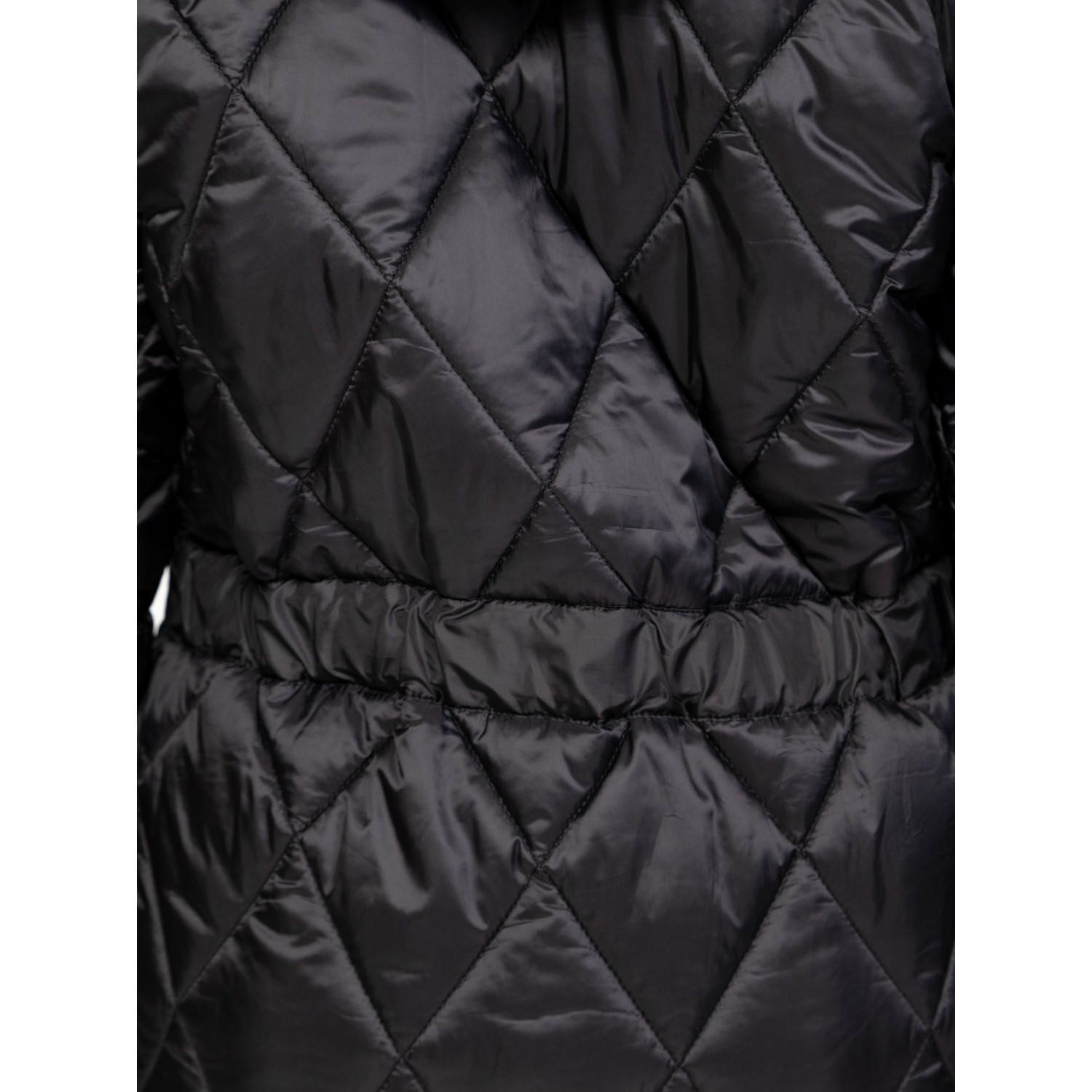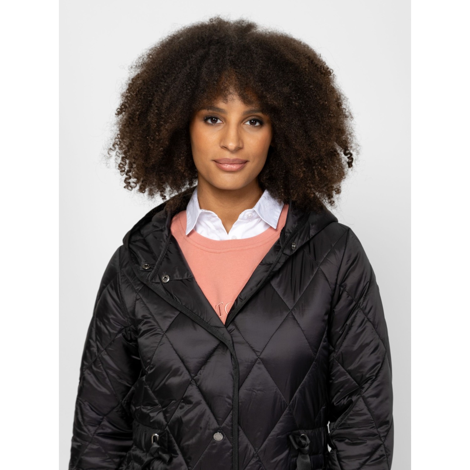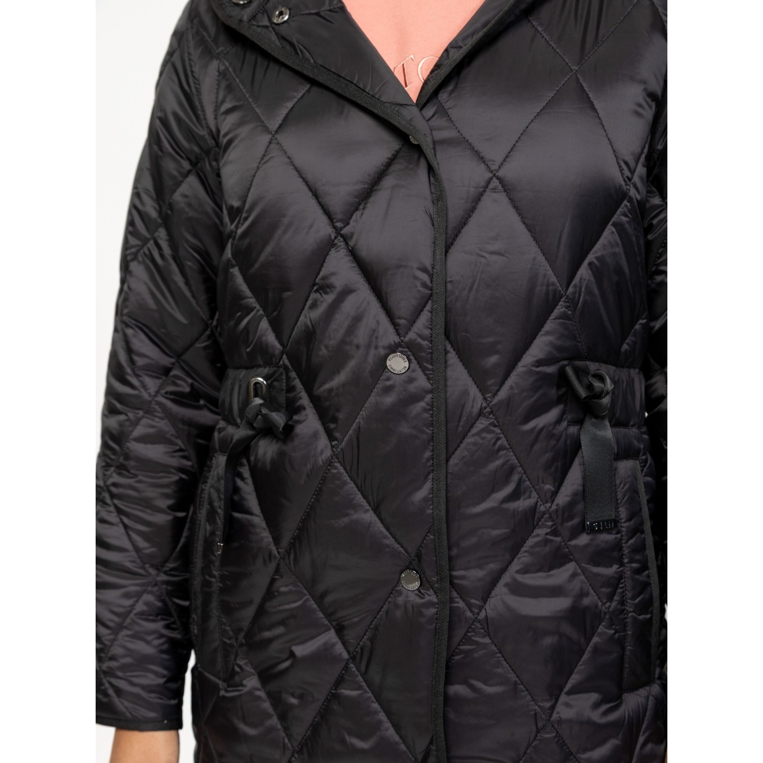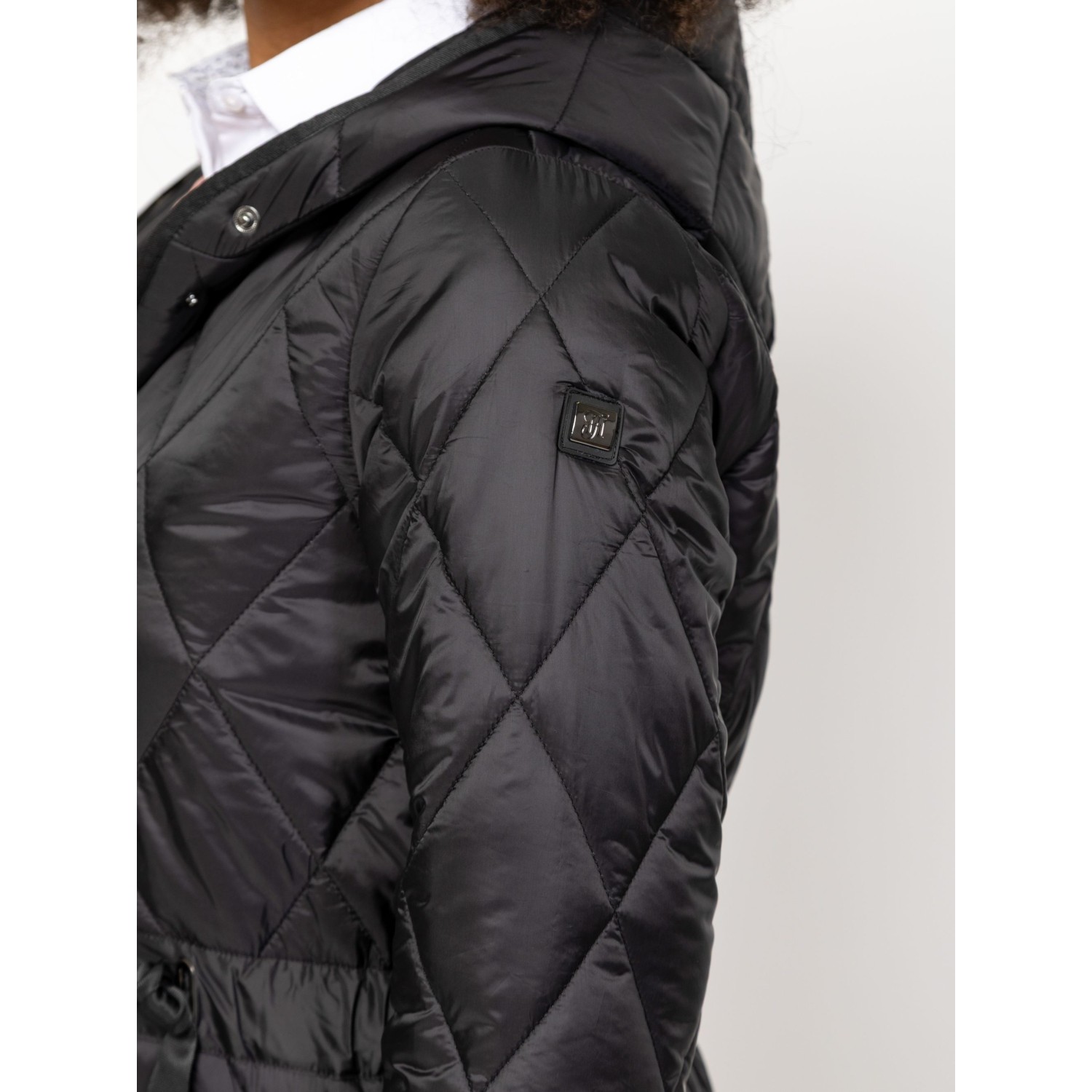 Női átmeneti kabát sikkes, steppelt anyagból, klasszikus színekben, trendi szabással, térdig érő hosszal, patentos záródással, fix kapucnival, állítható derékkal, egyenes zsebekkel és kis fém márkajelzésekkel az ujján. Anyaga: külső: 100% poliészter, lightweight, bélés: 100% poliészter, tömés: 100% poliészter. A modell 175 cm magas és S-es méretet visel.