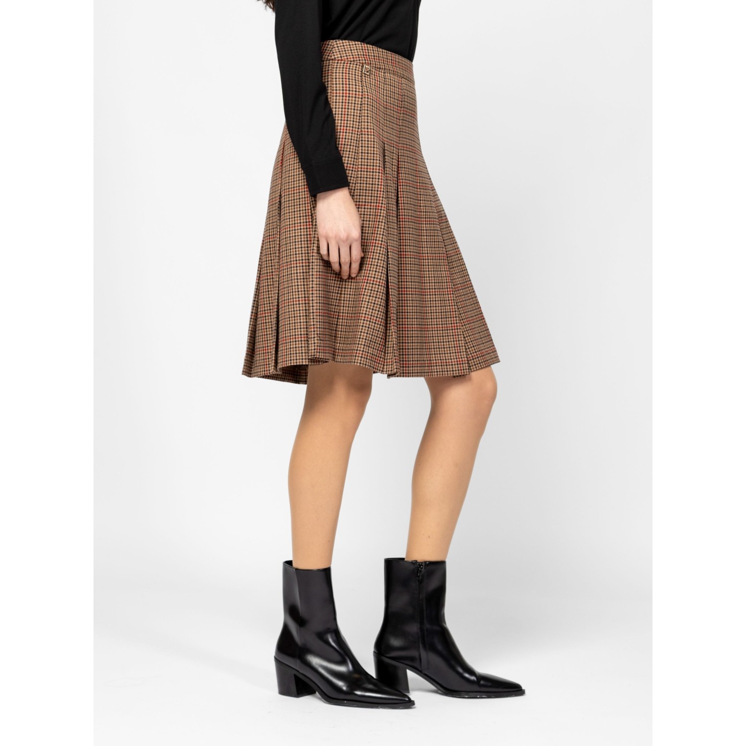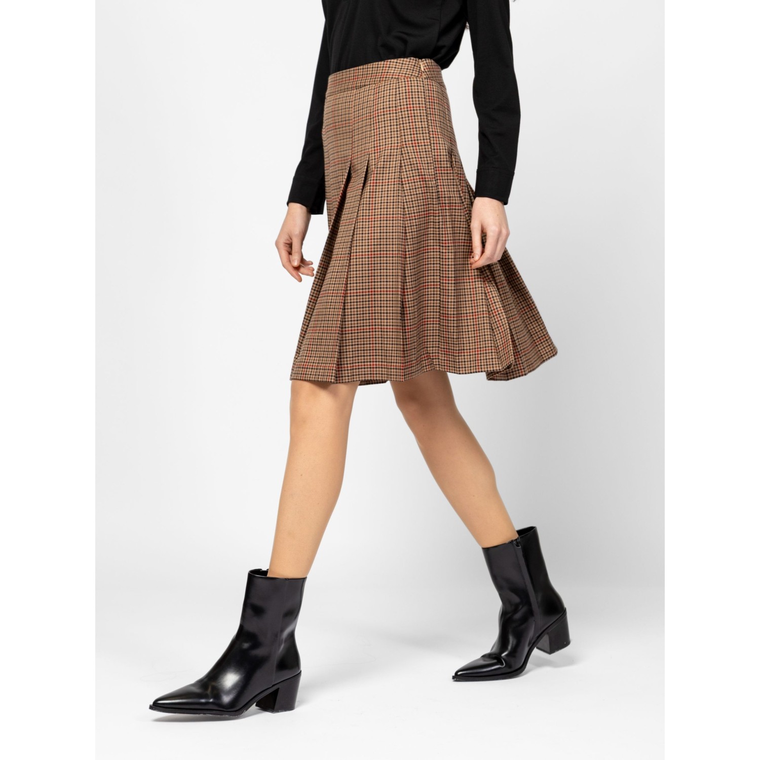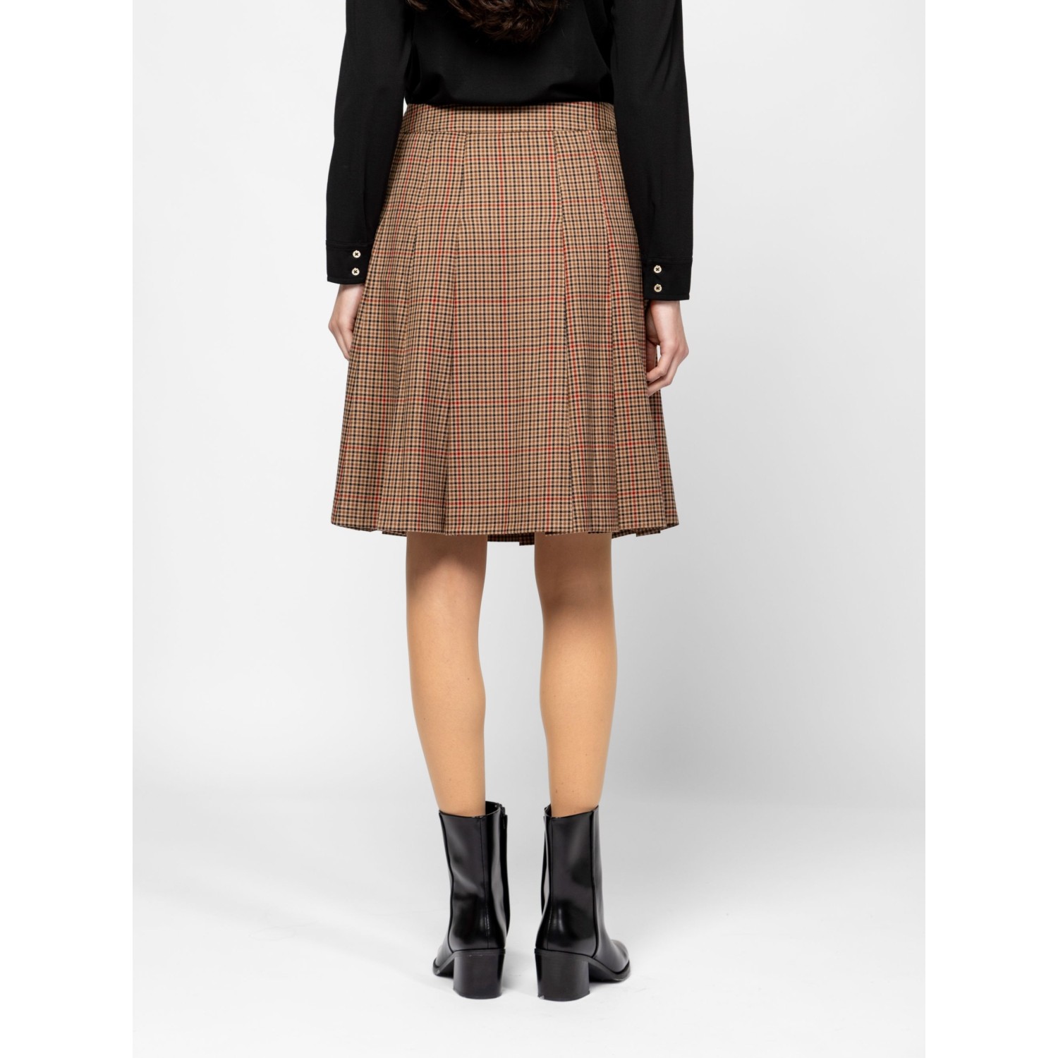 Női szoknya, plisszírozott hatással, térdig érő hosszal, oldalában rejtett cipzárral, elasztikus anyagból, alap színben és trendi kockás mintával, kis fém márkajelzéssel az elején. Anyaga: 60% poliészter, 35% viszkóz, 5% elasztán. A modell 175 cm magas és S-es méretet visel.