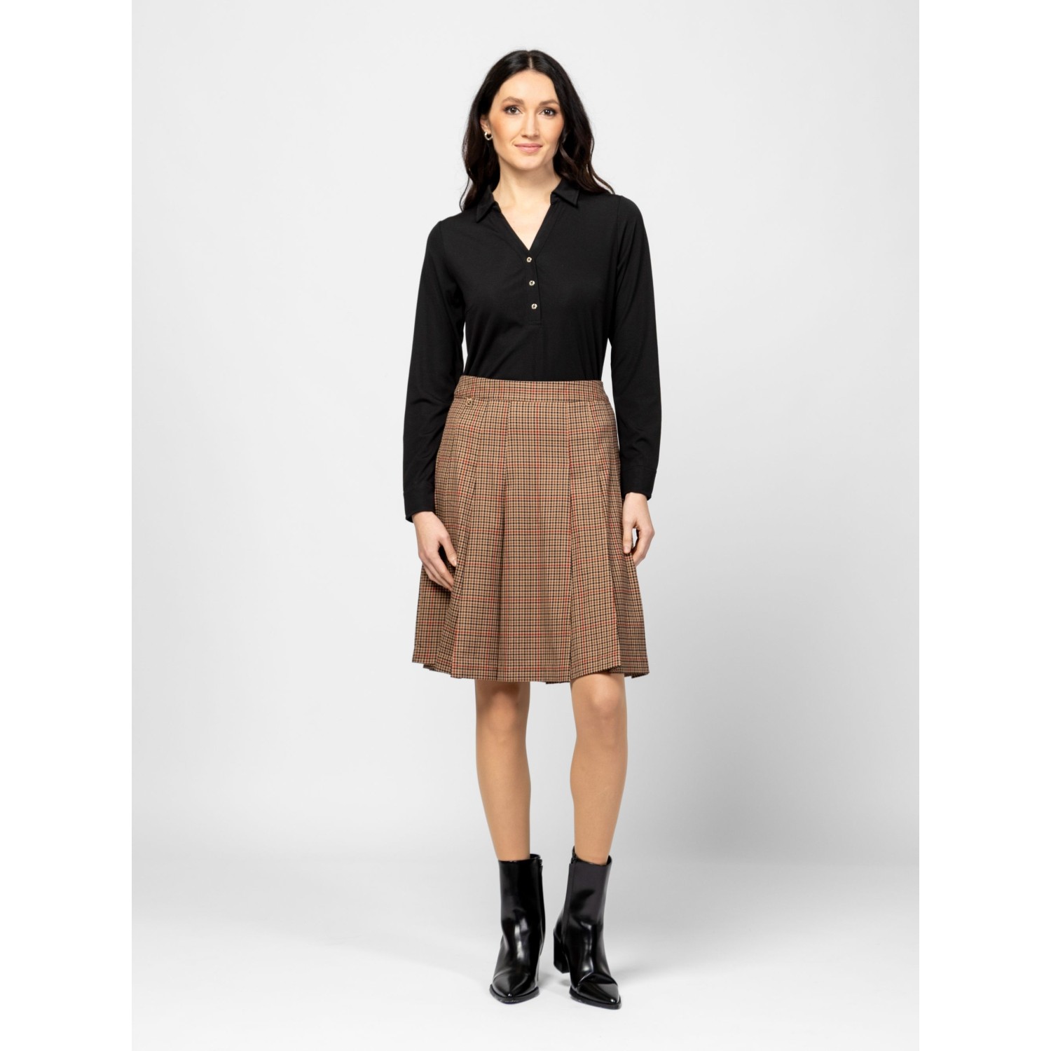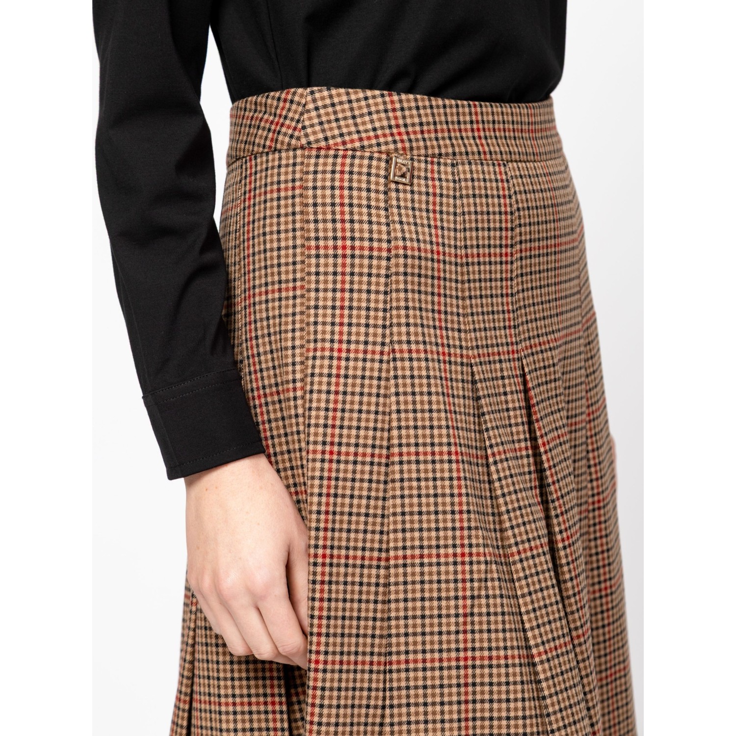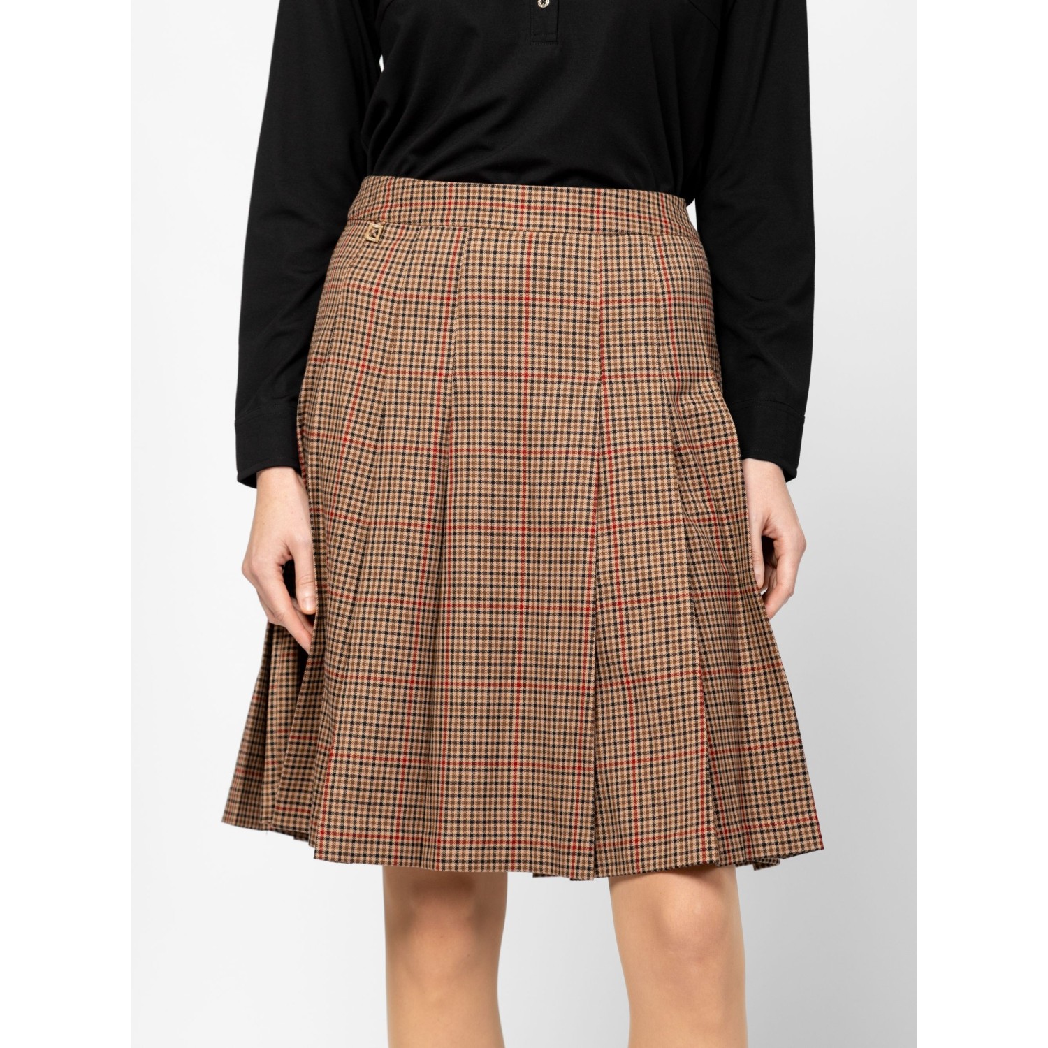 Női szoknya, plisszírozott hatással, térdig érő hosszal, oldalában rejtett cipzárral, elasztikus anyagból, alap színben és trendi kockás mintával, kis fém márkajelzéssel az elején. Anyaga: 60% poliészter, 35% viszkóz, 5% elasztán. A modell 175 cm magas és S-es méretet visel.