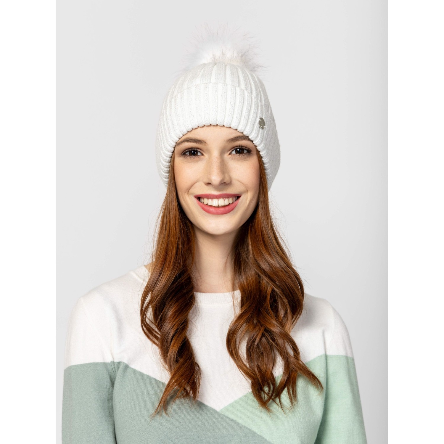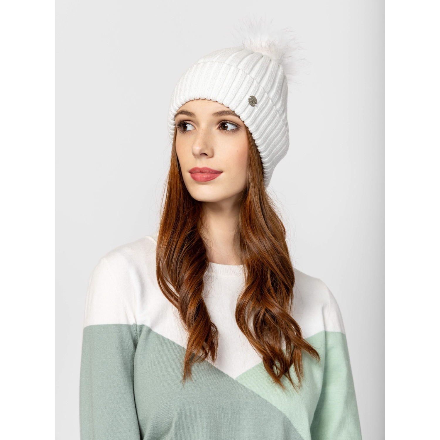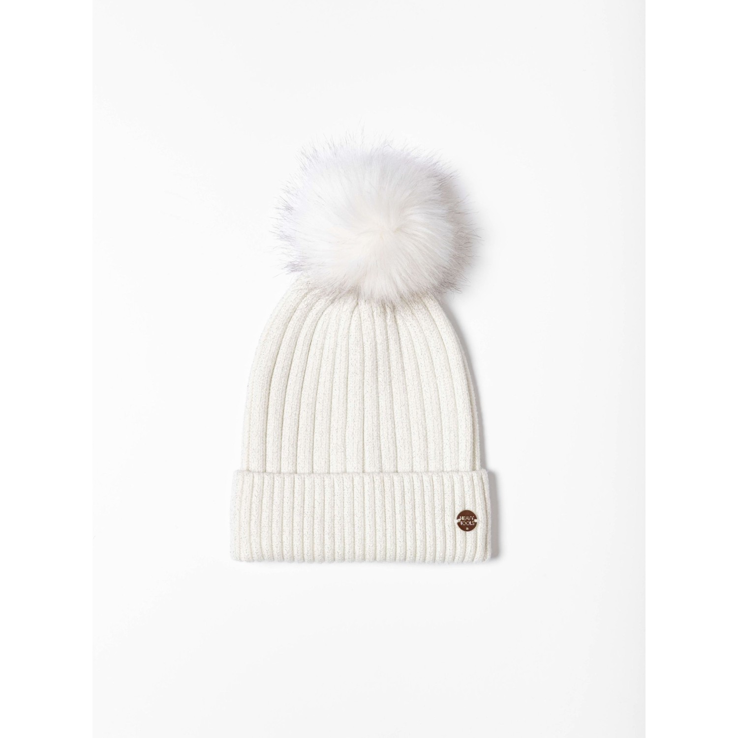 Női kötött sapka, lurex fonallal, dekoratív pomponnal, kis fém márkajelzéssel az oldalán. Anyaga: 50 % viscose, 30% poliészter, 10% poliamid, 10% lurex.