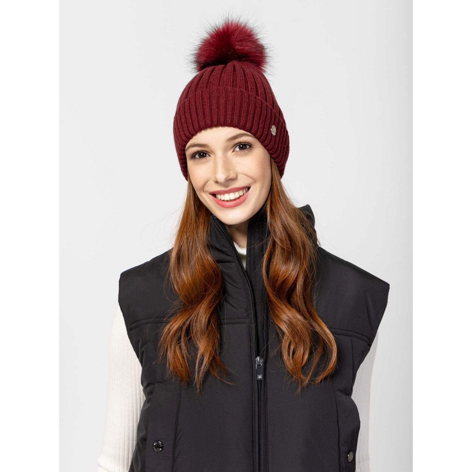 Női kötött sapka, lurex fonallal, dekoratív pomponnal, kis fém márkajelzéssel az oldalán. Anyaga: 50 % viscose, 30% poliészter, 10% poliamid, 10% lurex.