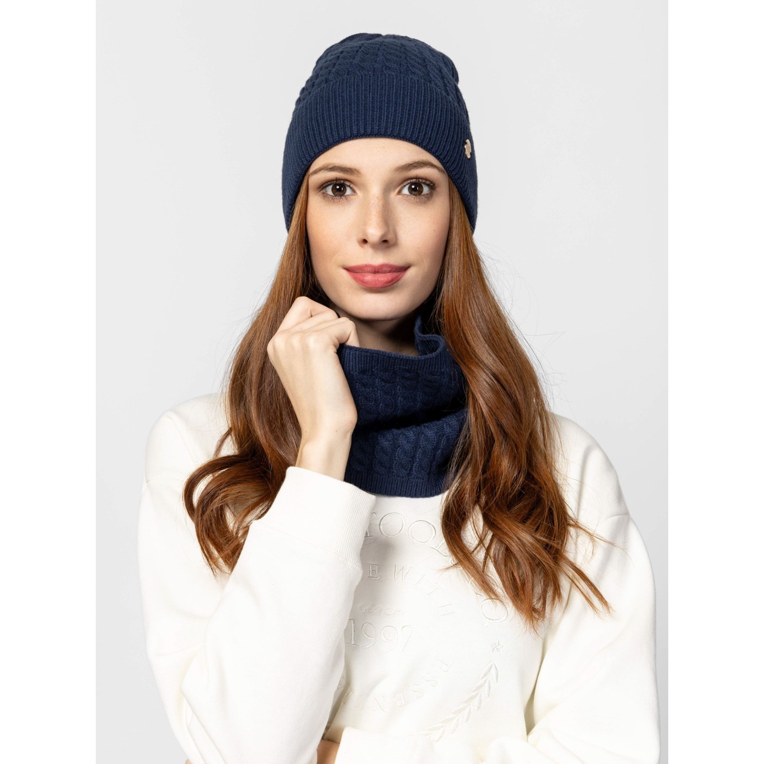 Női bordás kötött, csavart mintás csősál, fém márkajelzéssel, alap színekben. Kombináld PANIPAT25 sapkánkkal. Anyaga: 50% viszkóz, 26% poliészter, 24% poliamid.