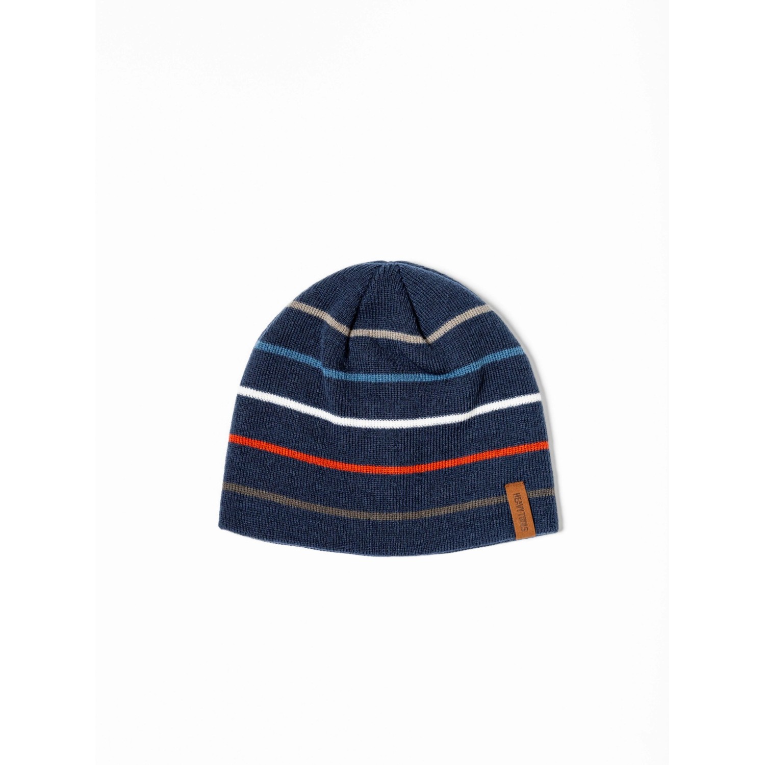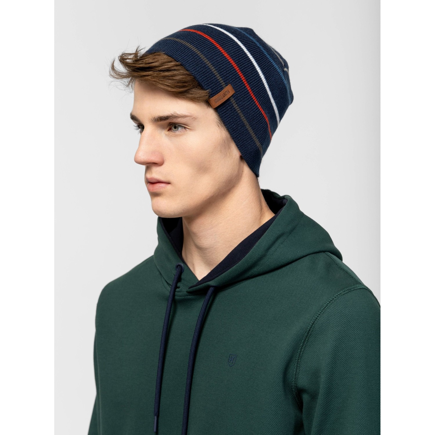 Férfi kötött sapka, színes csíkozással, oldalán márkajelzéssel. Anyaga: 100% akril.