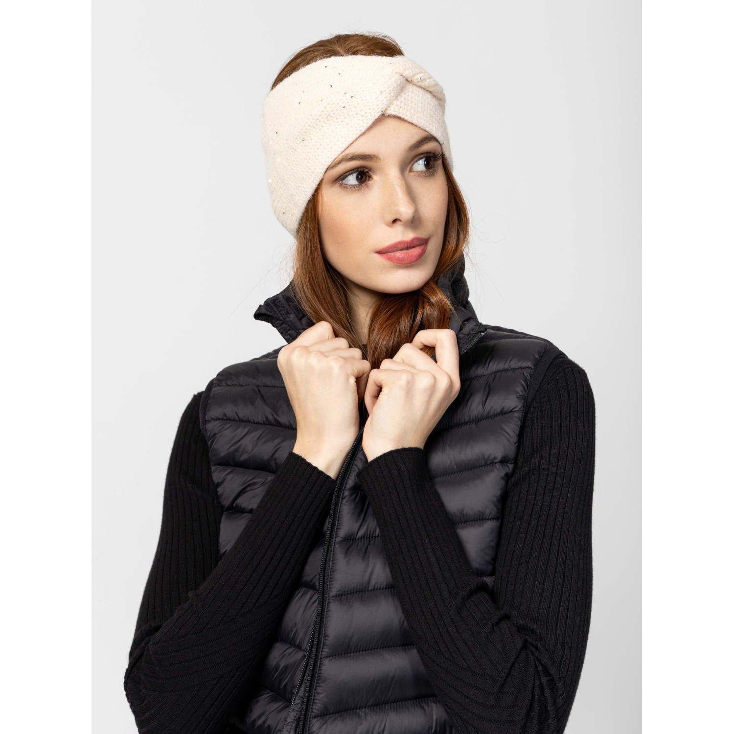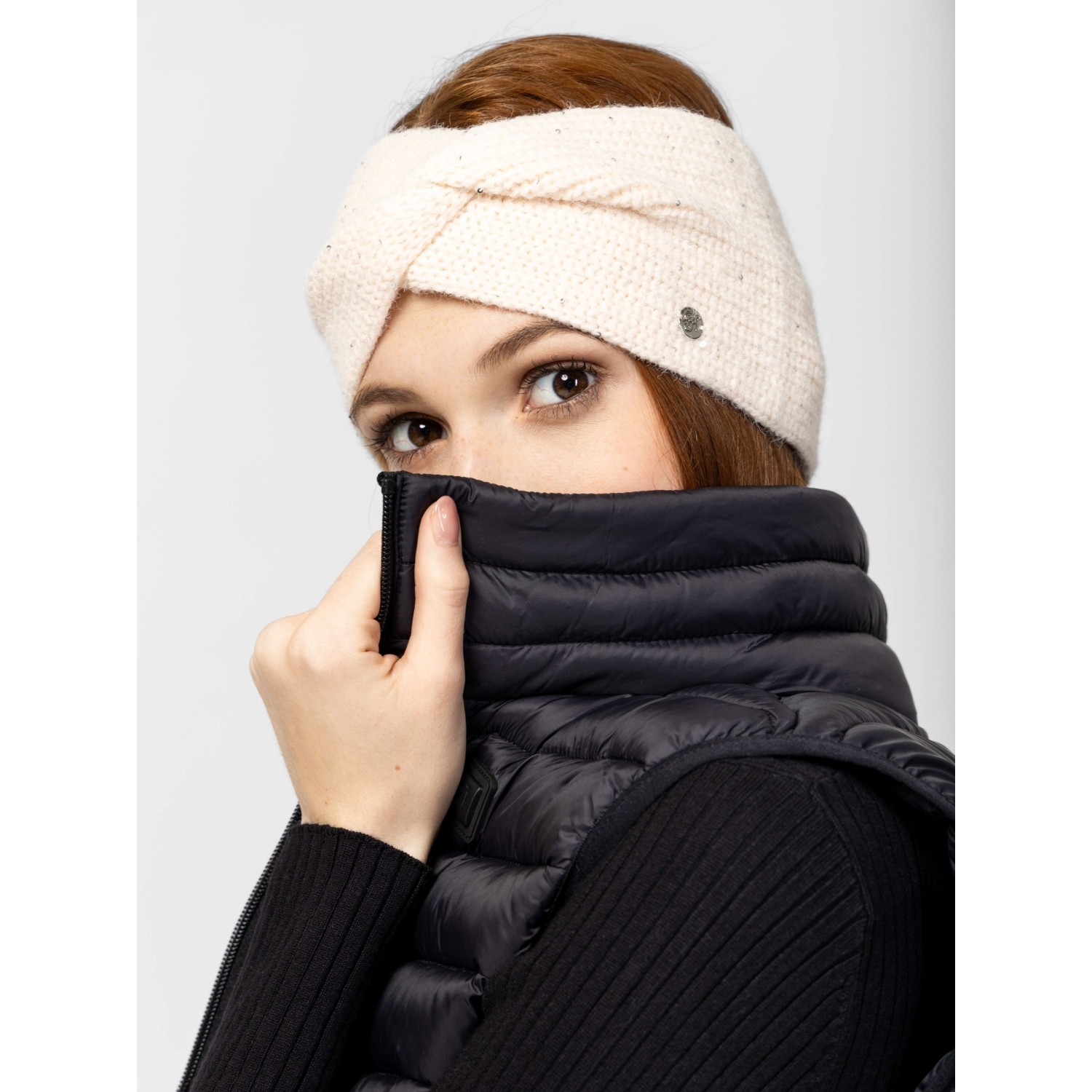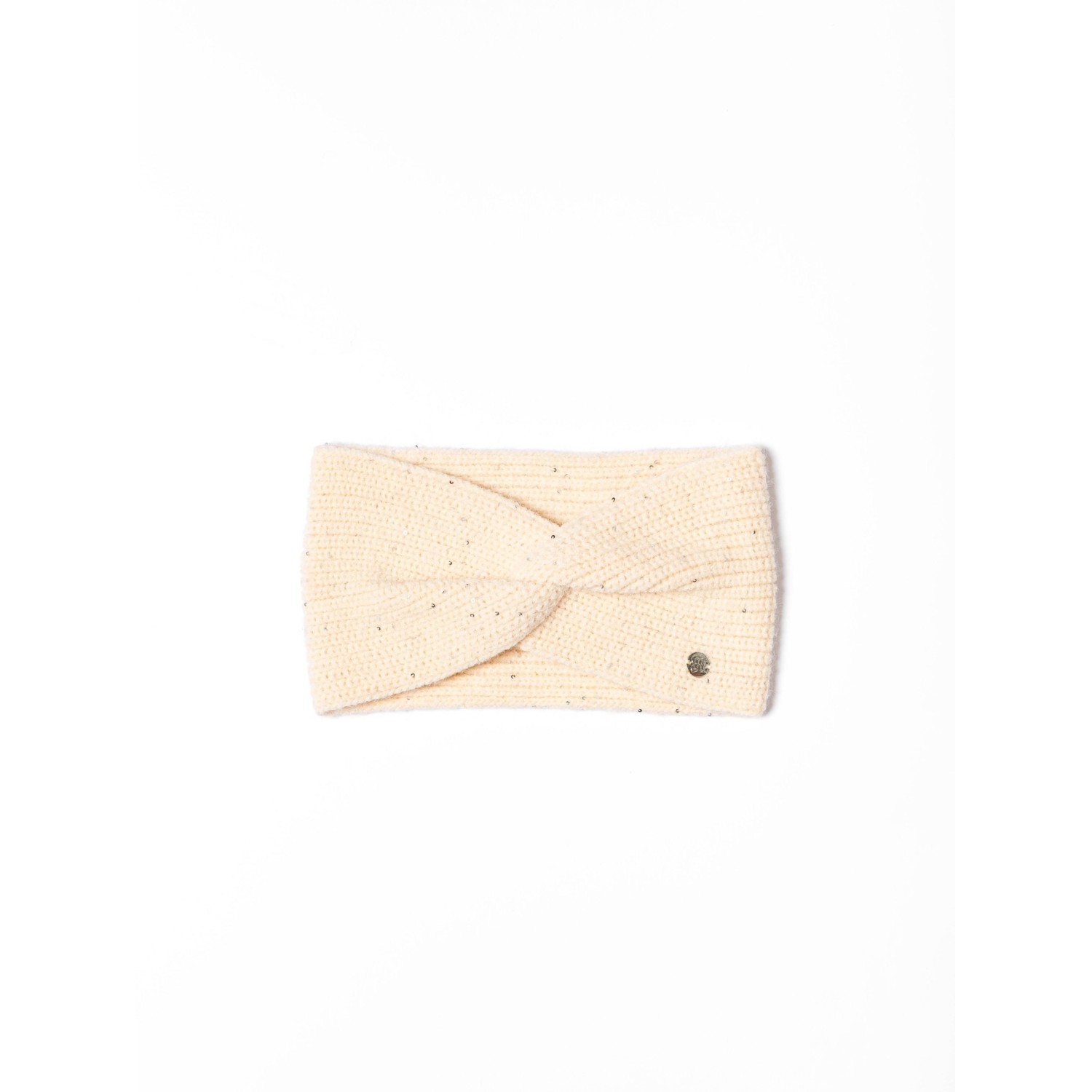 Női bordás kötött fejpánt a hűvösebb napokra, kis fém márkajelzéssel az elején, alap színekben. Anyaga: 40% akril, 32% poliészter, 22% poliamid, 6% strassz.