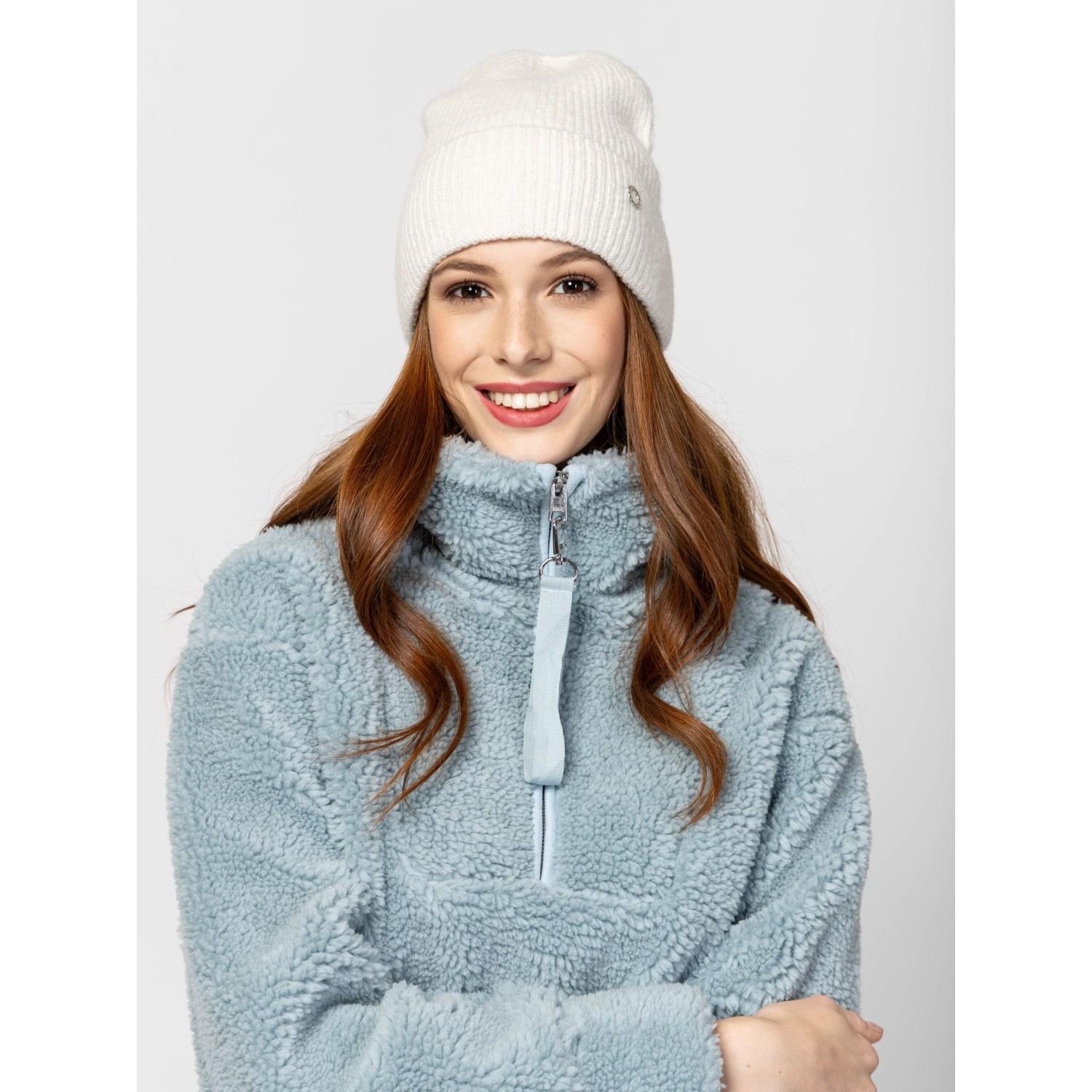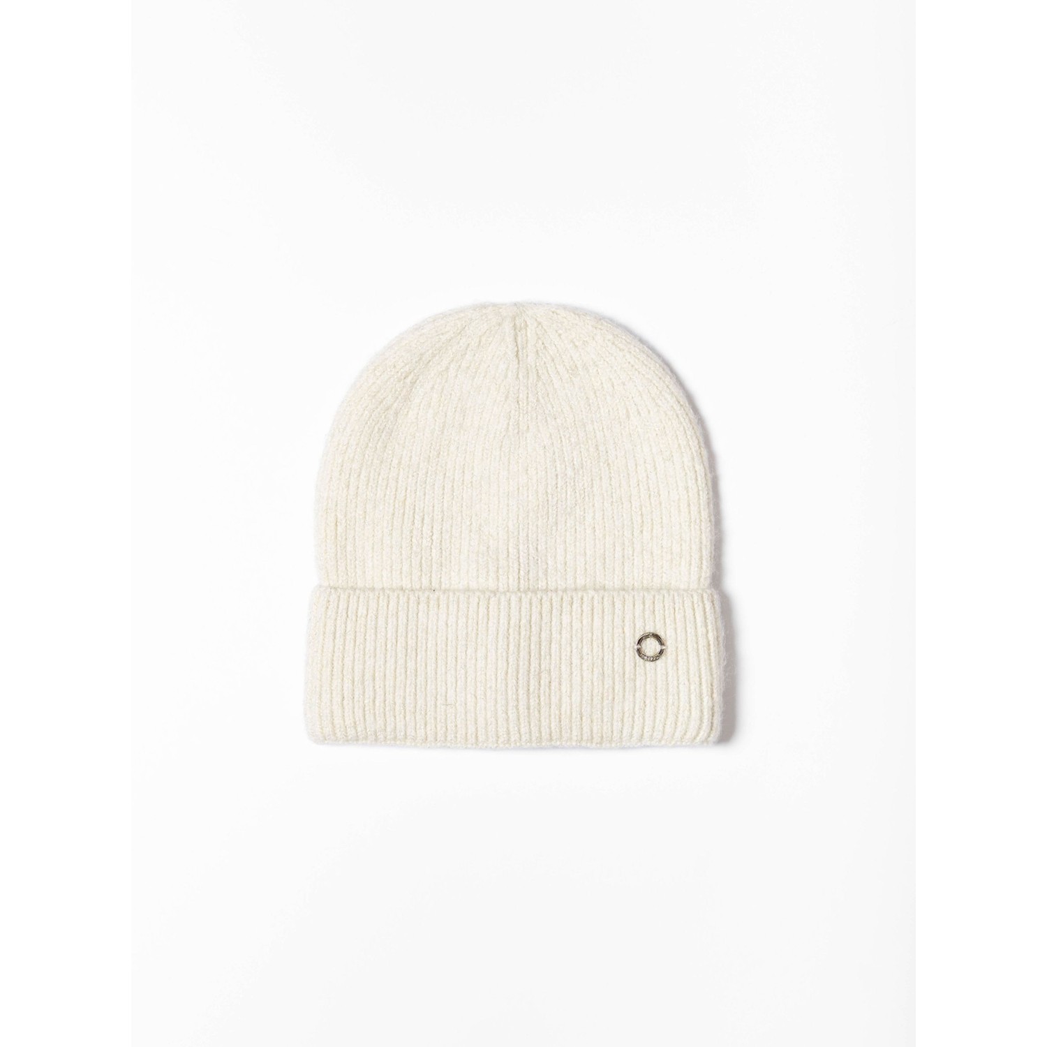 Női bordás kötött sapka, kis fém márkajelzéssel az oldalán. Anyaga: 52% akril, 24% pamut, 22% poliészter, 2% elasztán.