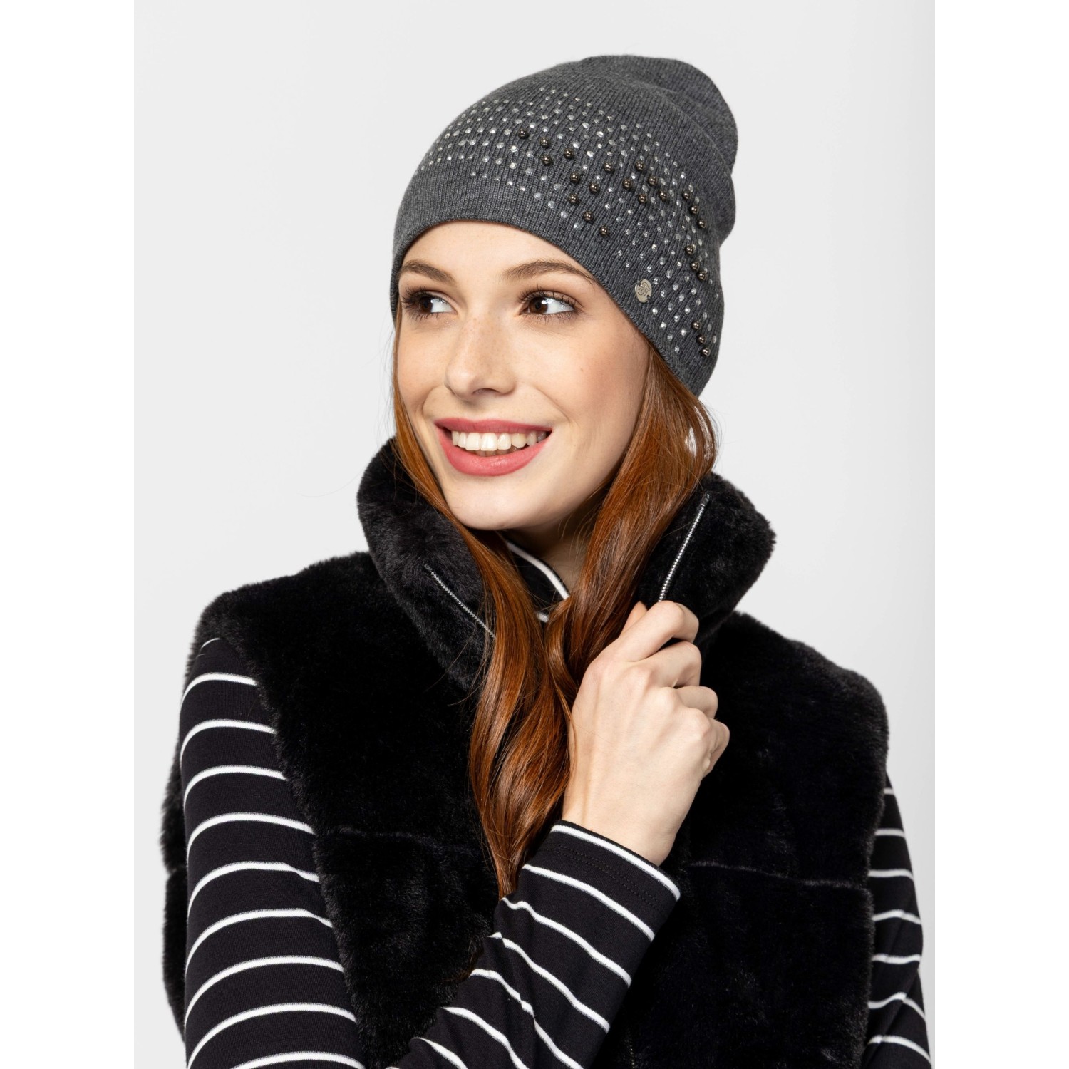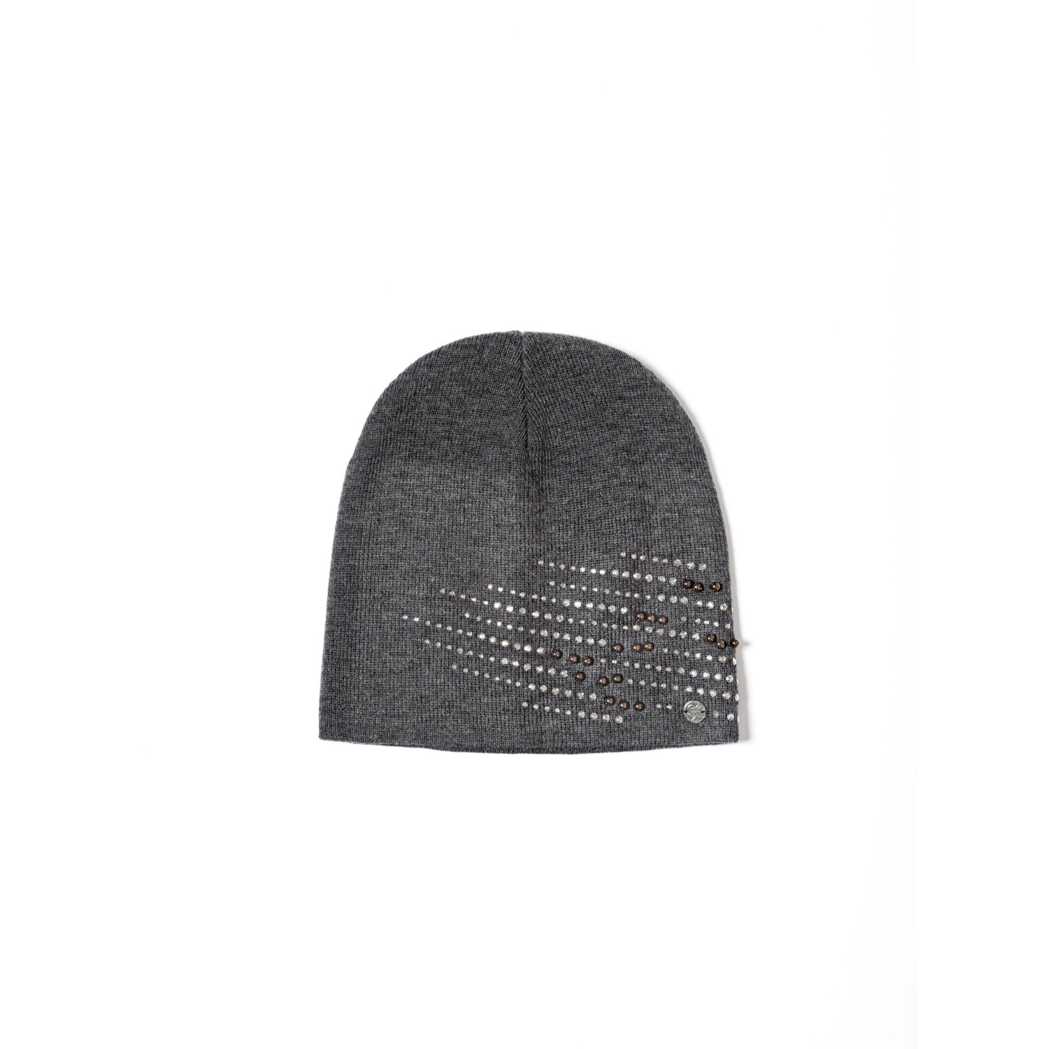 Női kötött sapka, elején köves díszítéssel és kis fém márkajelzéssel . Anyaga: 100% akril.