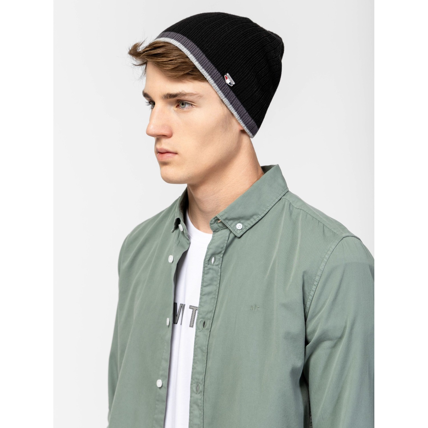Férfi kötött sapka, bordázott kötésmintával, alap színekben, alján csíkozással, oldalán kis fém márkajelzéssel. Anyaga: 100% akril.