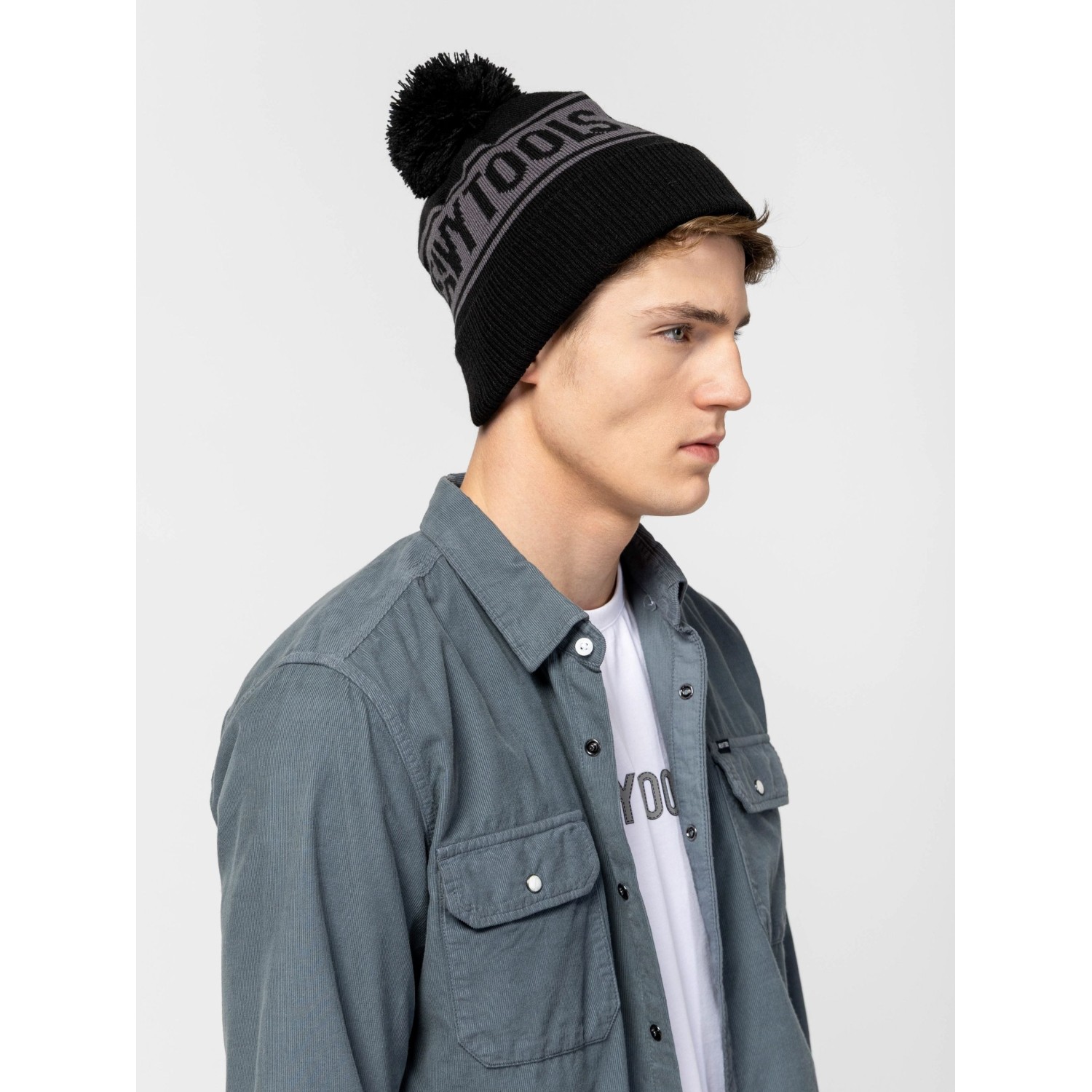 Férfi kötött sapka pomponnal, belekötött nagy márkajelzéssel. Anyaga: 100% akril.