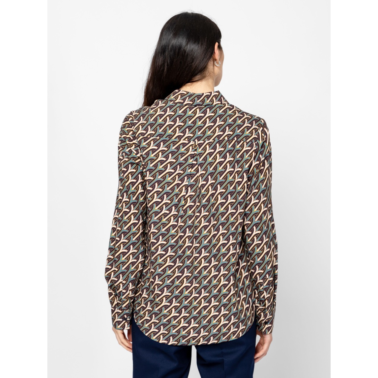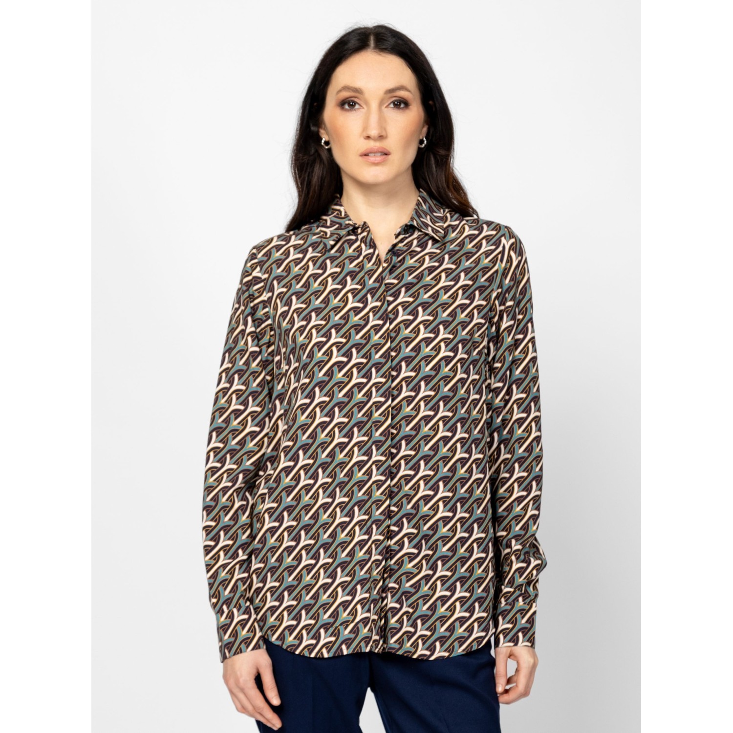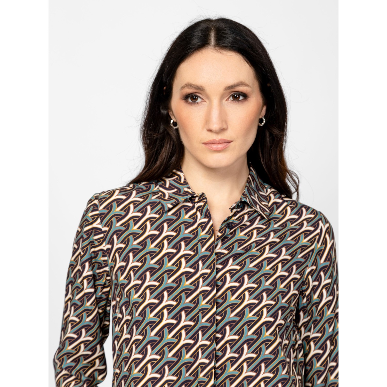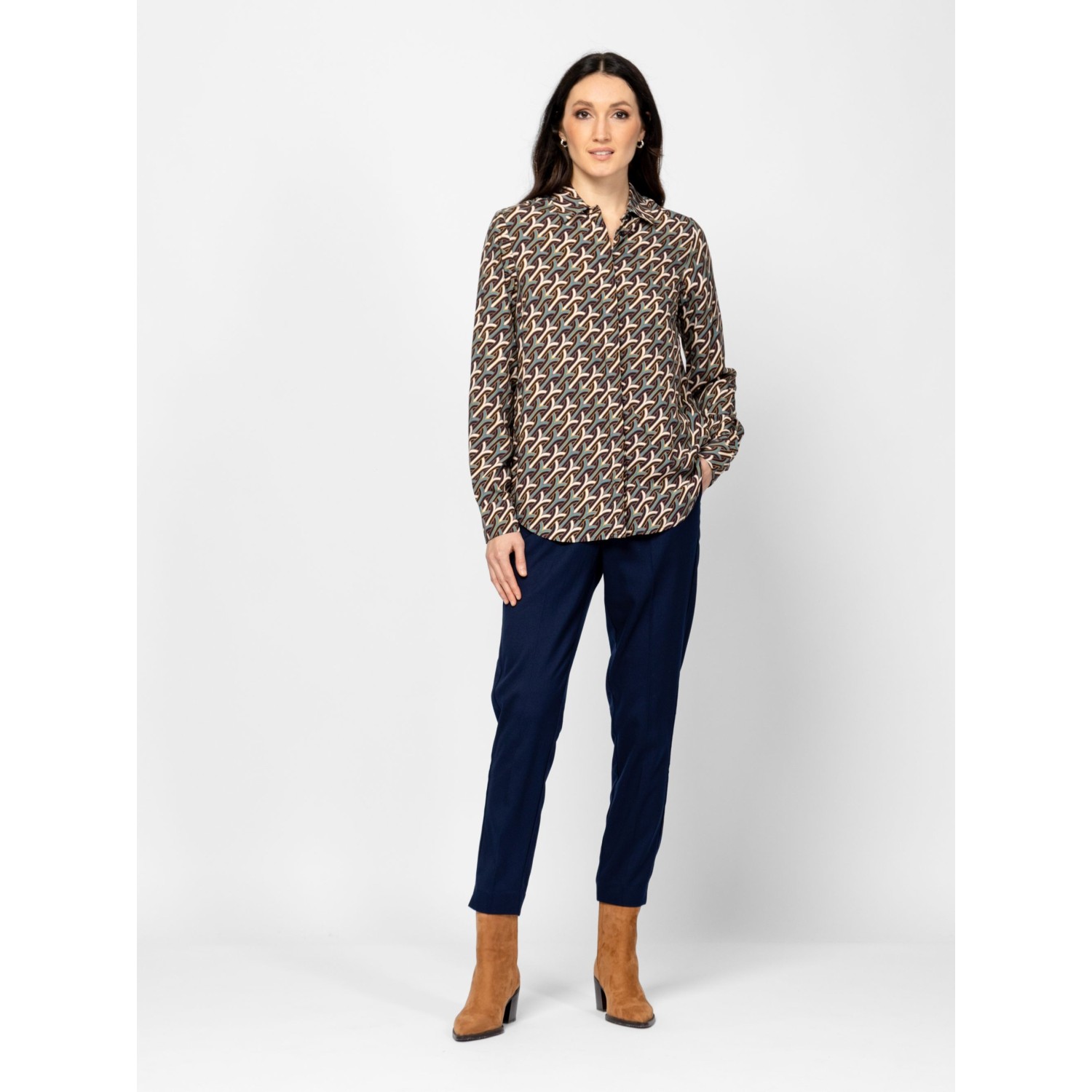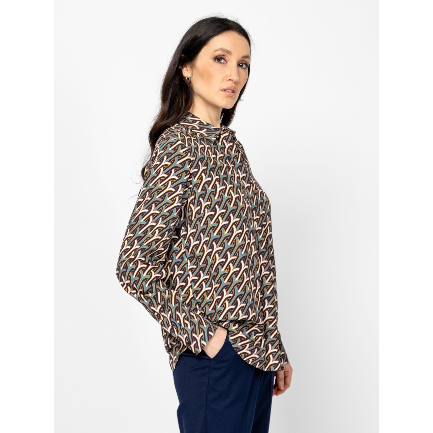 Női ingblúz bővebb szabással, dekoratív állógallérral, rejtett gombolással, gombos kézelővel, könnyen kezelhető viszkóz anyagból, sikkes mintákkal, kis fém márkajelzéssel a hátán. Anyaga: 100% viszkóz. A modell 175 cm magas és S-es méretet visel.