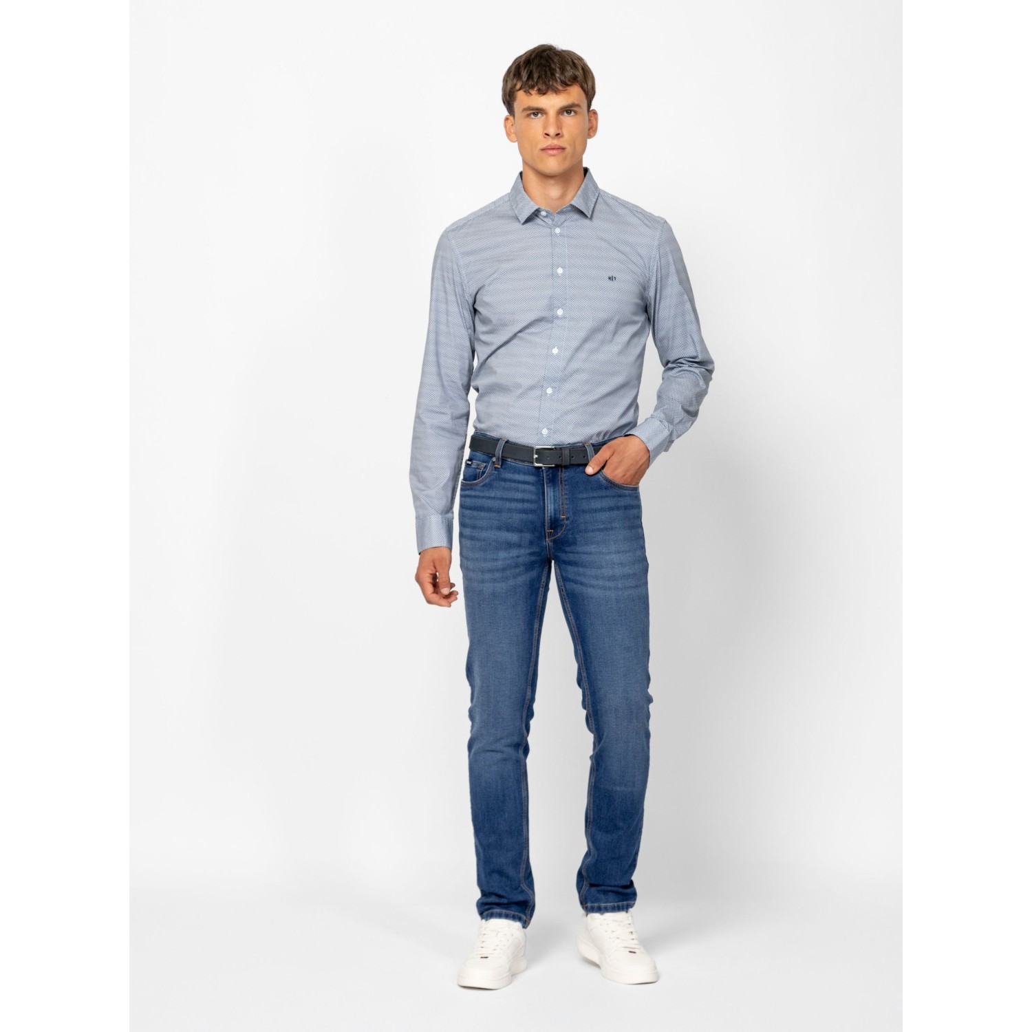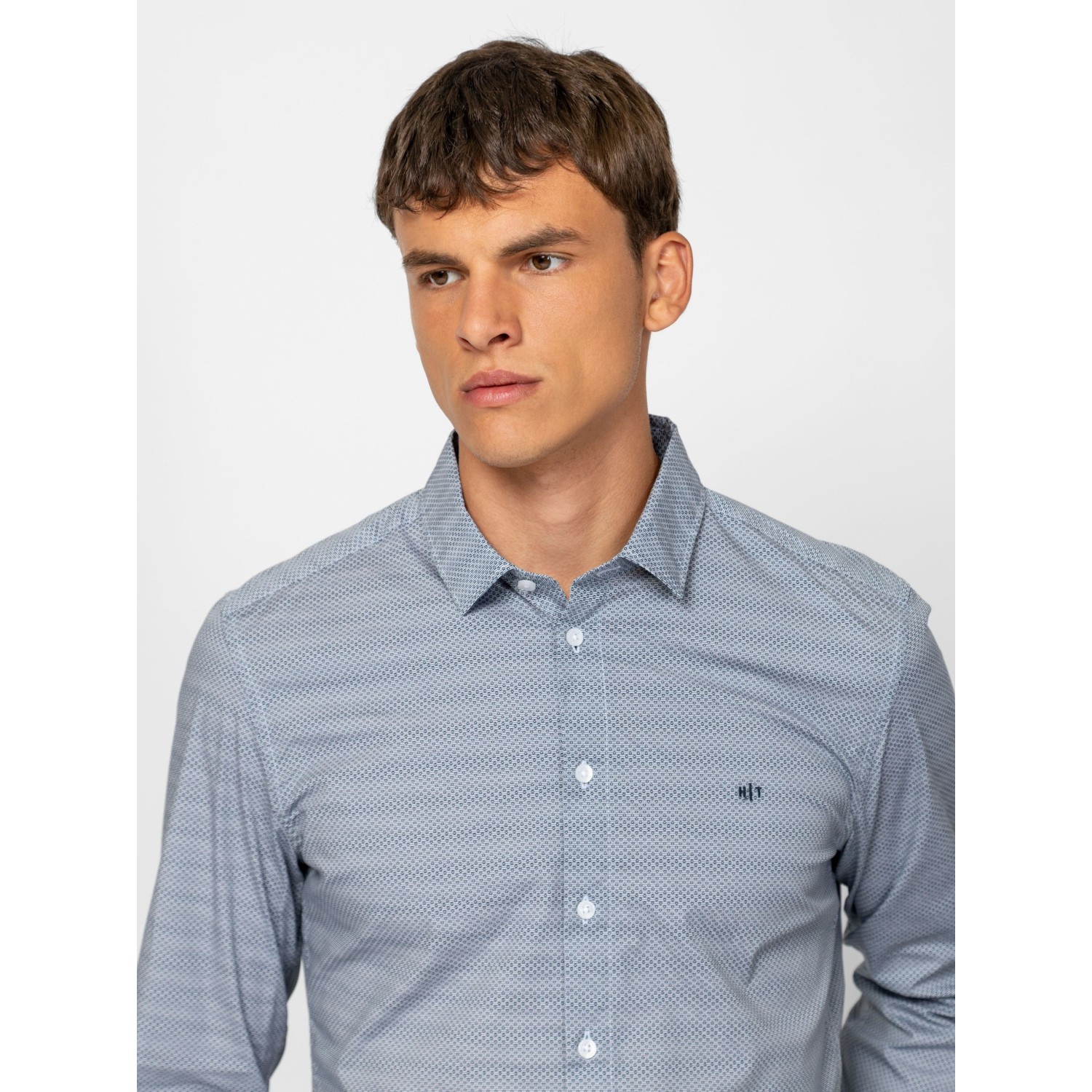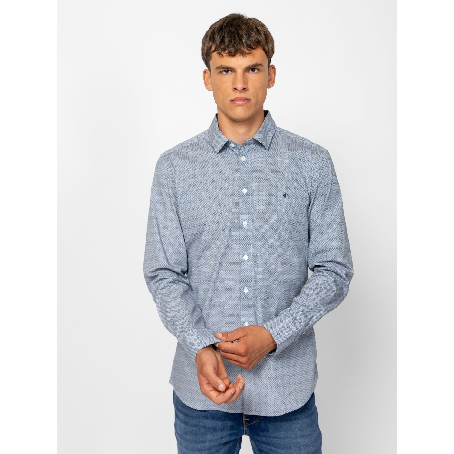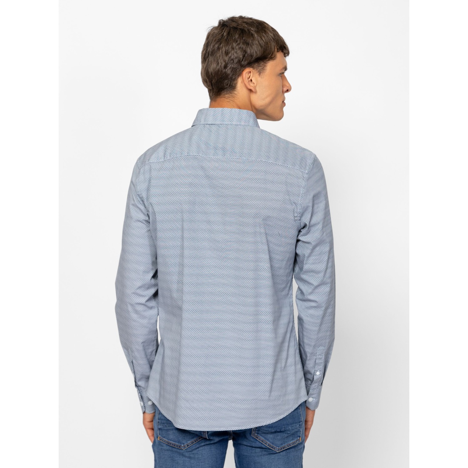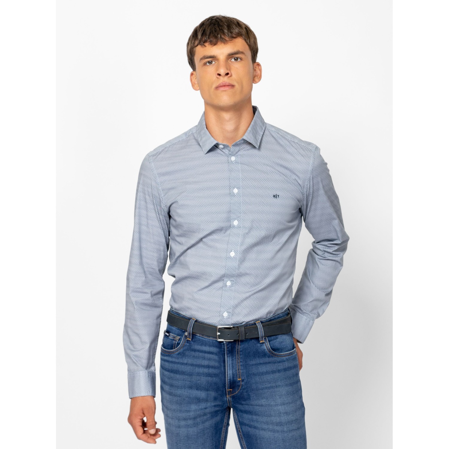 Férfi hosszú ujjú ing, shaped-fit fazonnal, apró mintás anyagból, szépen kidolgozott, gallér megoldással, elején kis hímzett márkajelzéssel és gombos mandzsettával. A rugalmas pamut anyag kellemes érzetet biztosít akár egész napos viselet során is. Anyaga: 97% pamut, 3% elasztán, puplin. A modell 188 cm magas és L-es méretet visel.