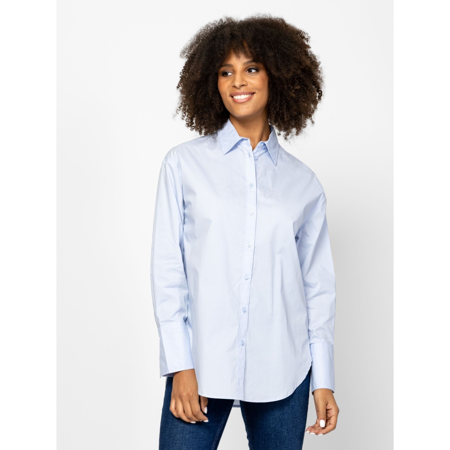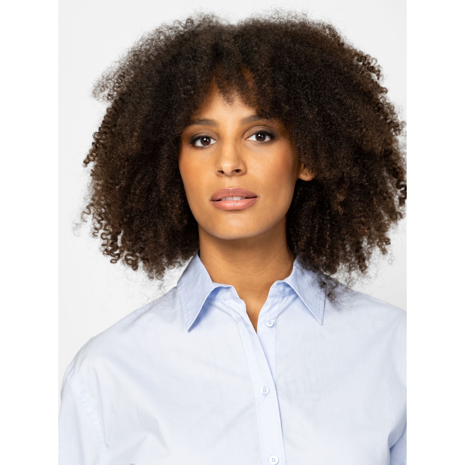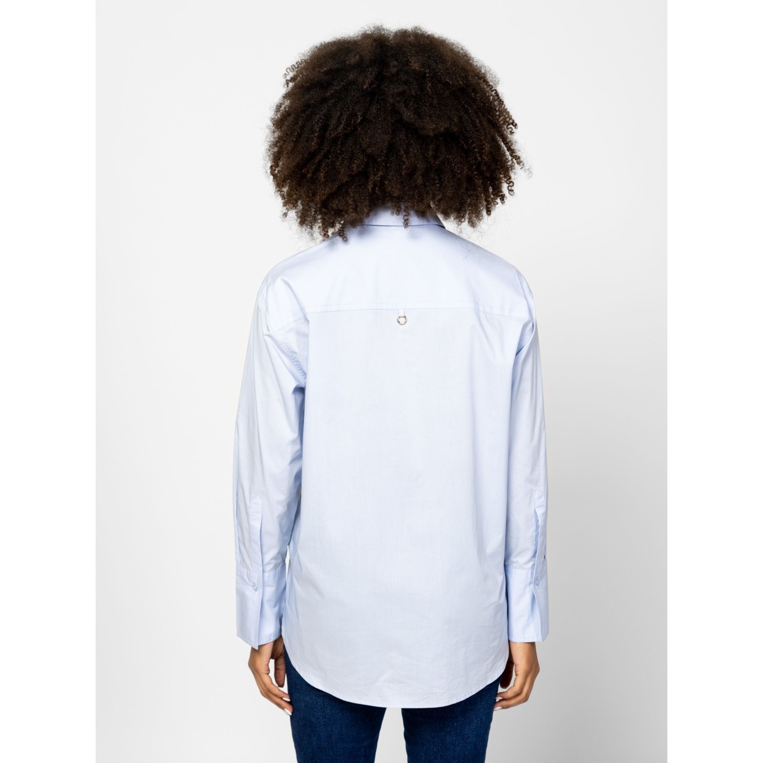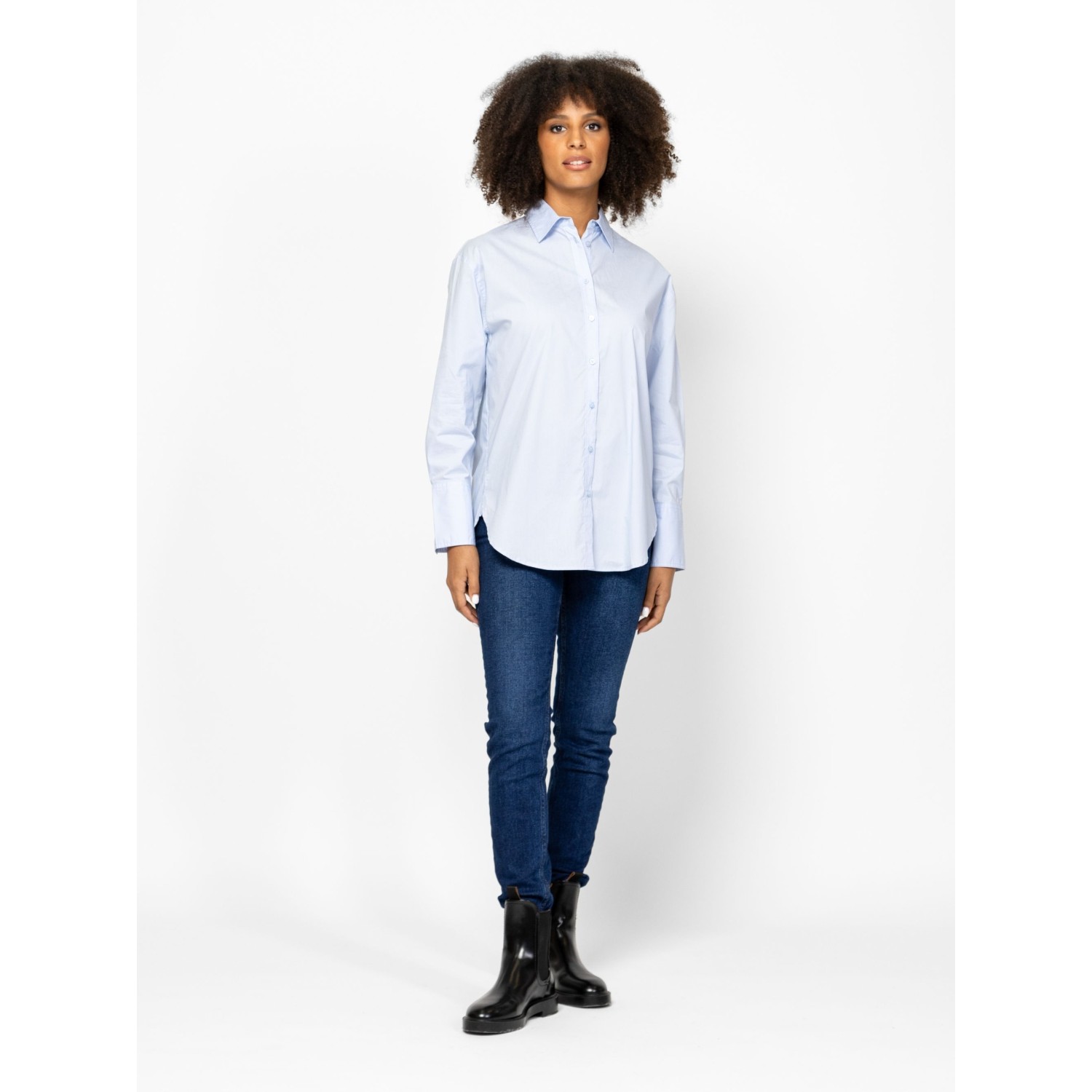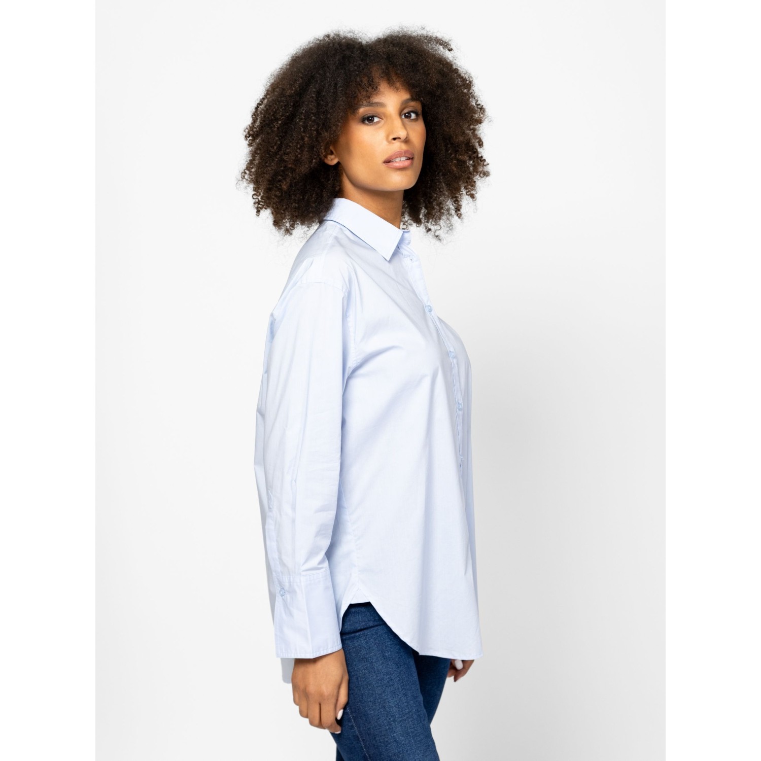 Női ing, egyenes, bővebb szabással, klasszikus színekben, lekerekített aljjal, kis fém márkajelzéssel a hátán, tiszta pamut anyagból. Anyaga: 100% pamut, puplin. A modell 175 cm magas és S-es méretet visel.