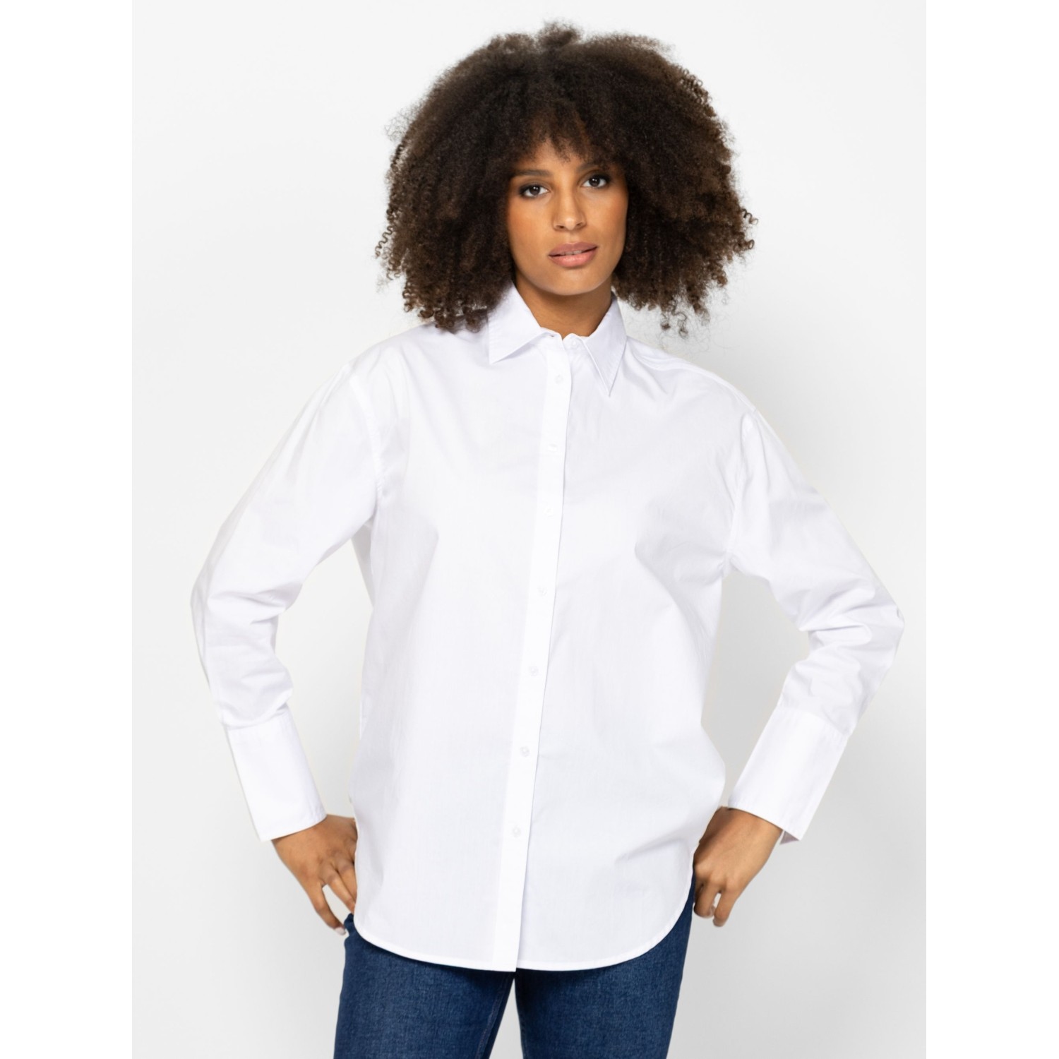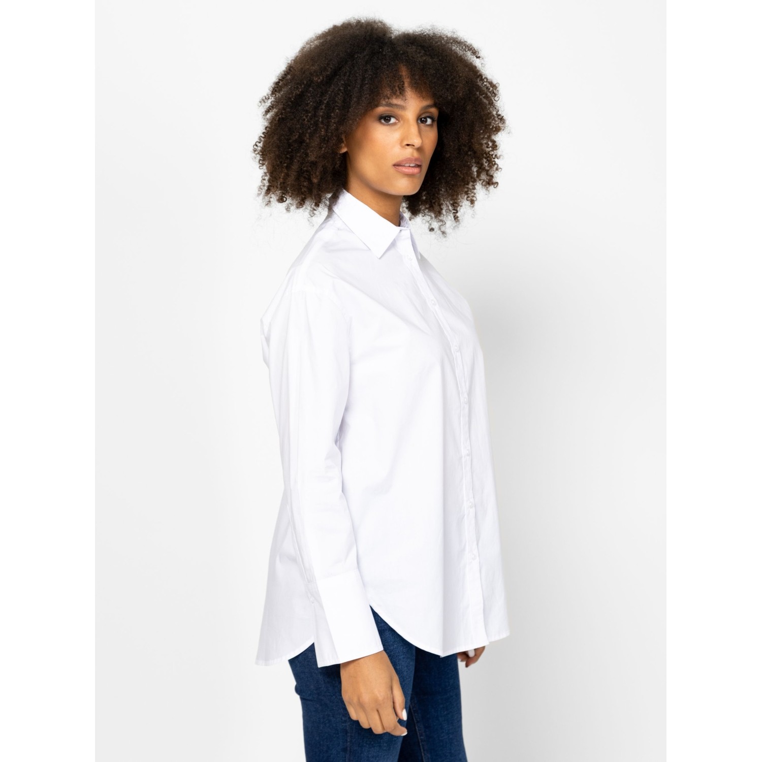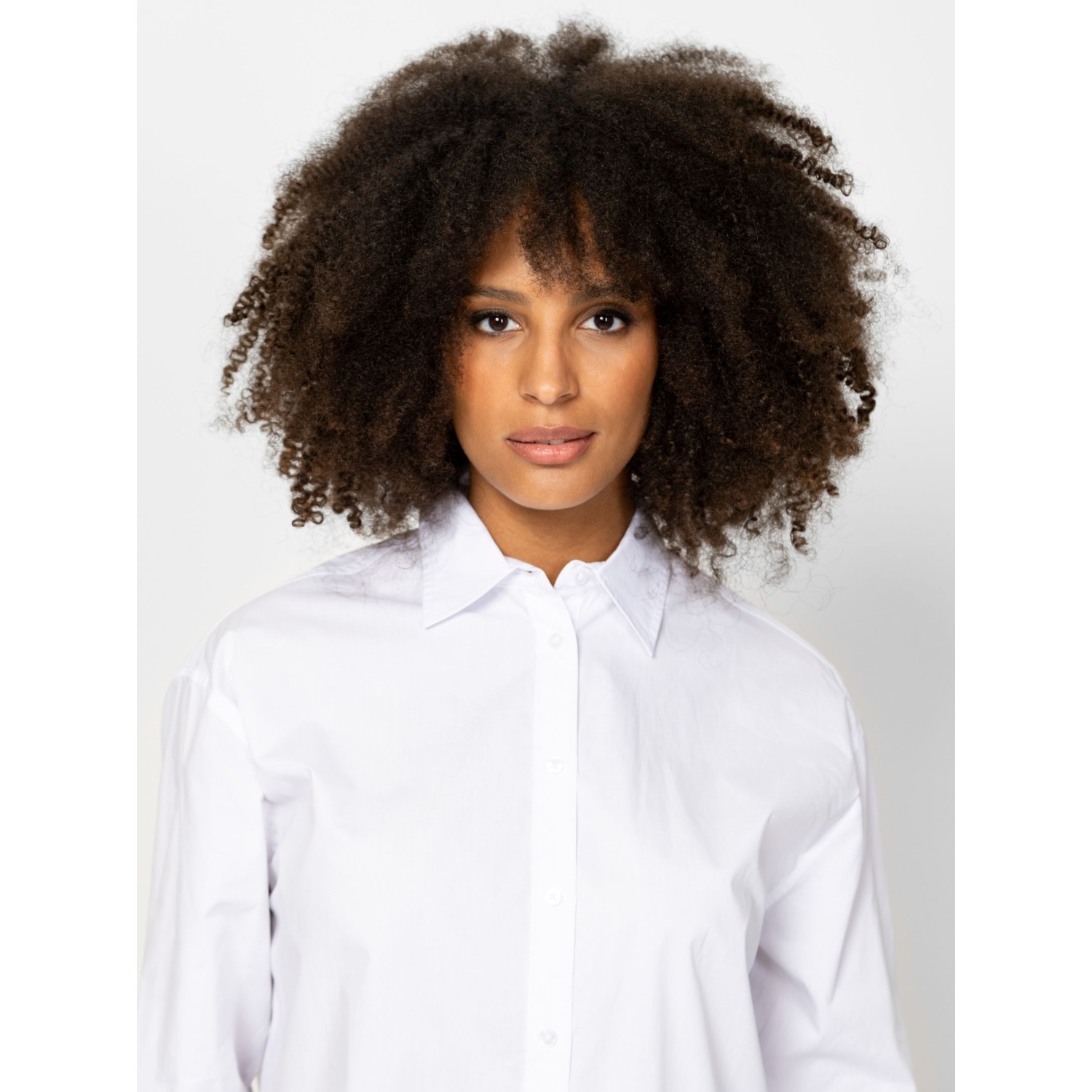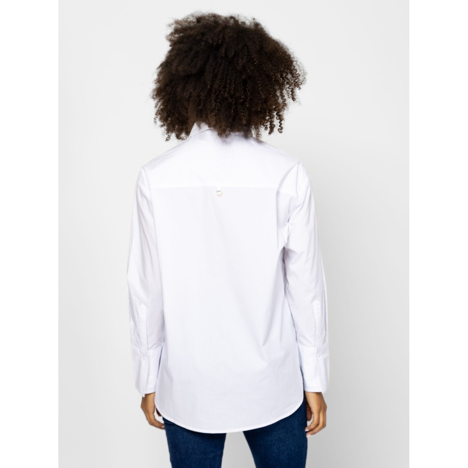 Női ing, egyenes, bővebb szabással, klasszikus színekben, lekerekített aljjal, kis fém márkajelzéssel a hátán, tiszta pamut anyagból. Anyaga: 100% pamut, puplin. A modell 175 cm magas és S-es méretet visel.