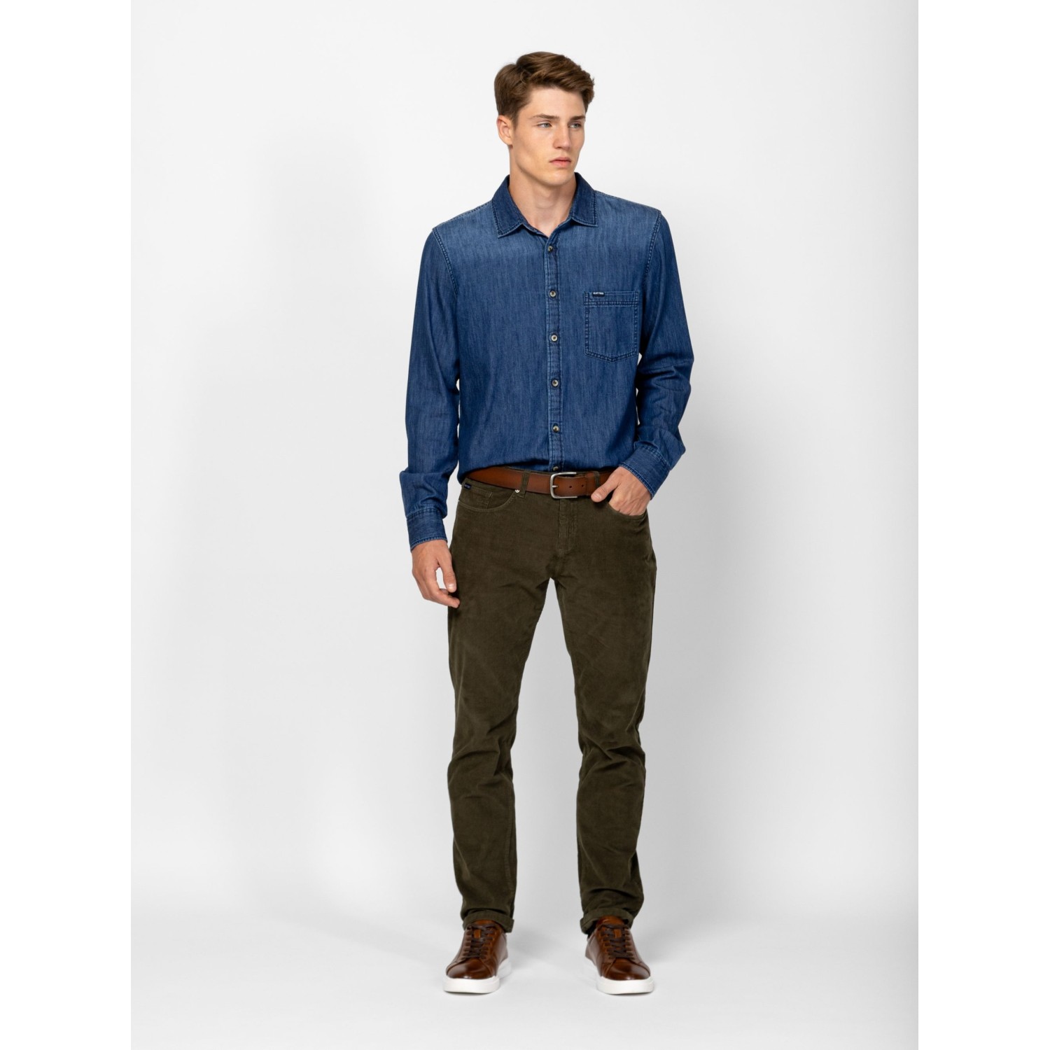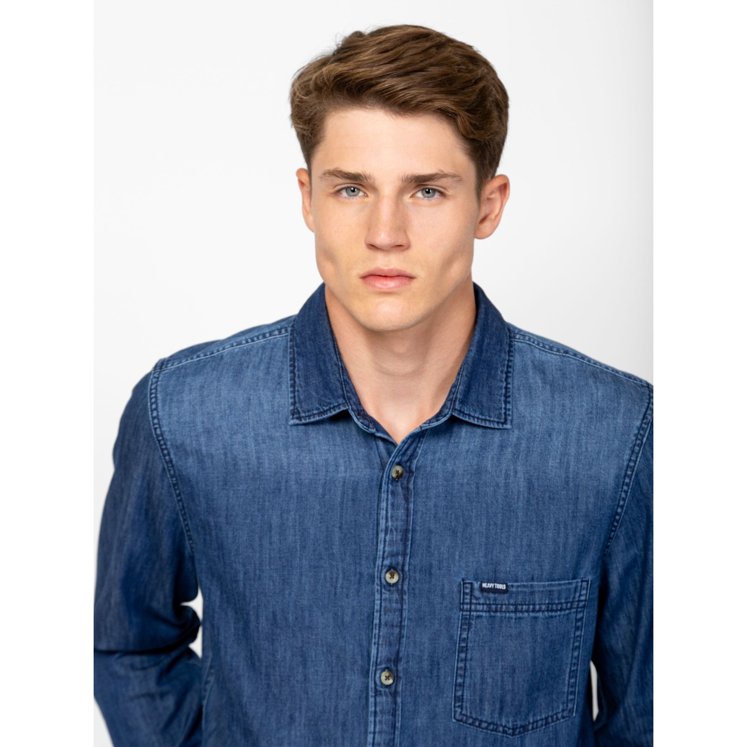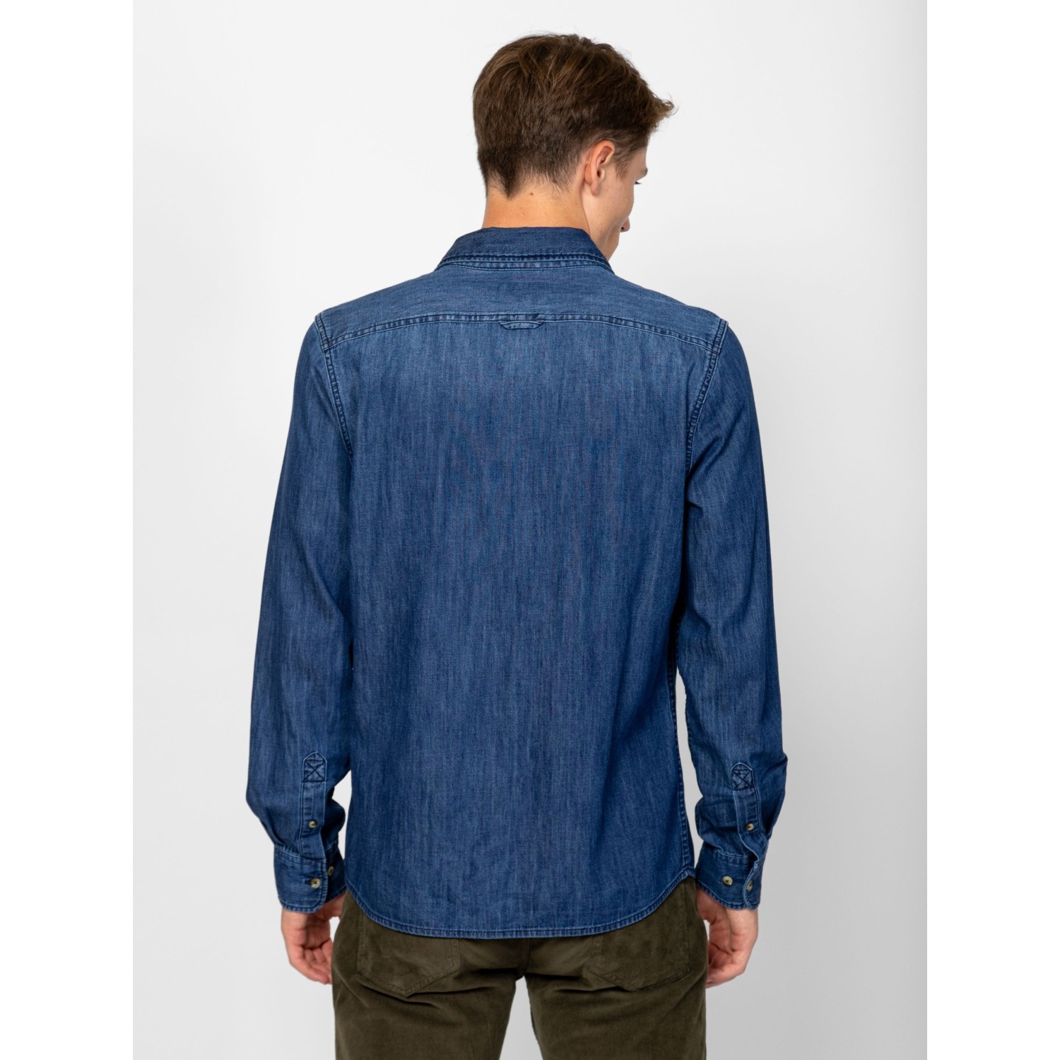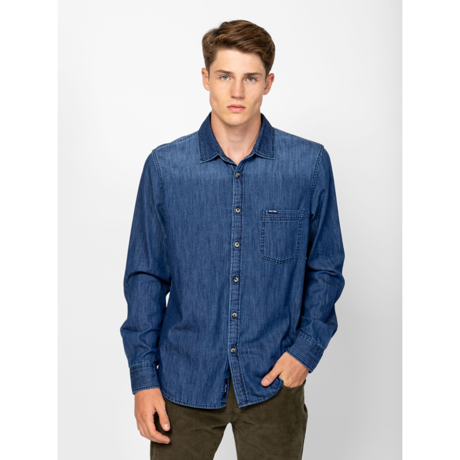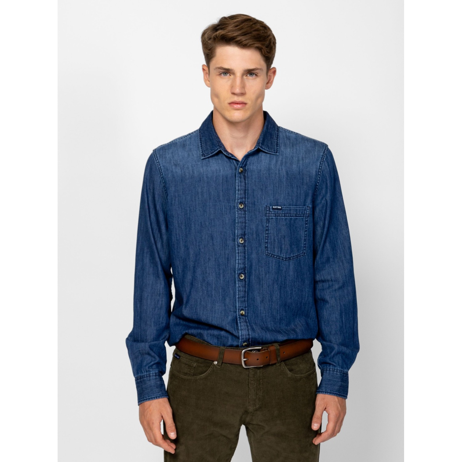 Férfi hosszú ujjú farmer ing, comfort fit fazonnal, gombos záródással, két színárnyalatban, tiszta pamut anyagból, szépen kidolgozott gallér és mandzsetta megoldással, bal elején zsebbel, kis szövött márkajelzéssel a zseben. Anyaga: 100% pamut, farmer. A modell 188 cm magas és L-es méretet visel.