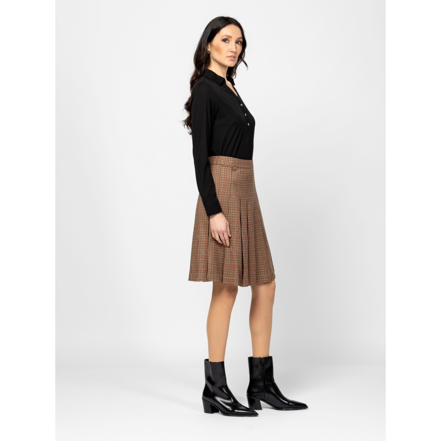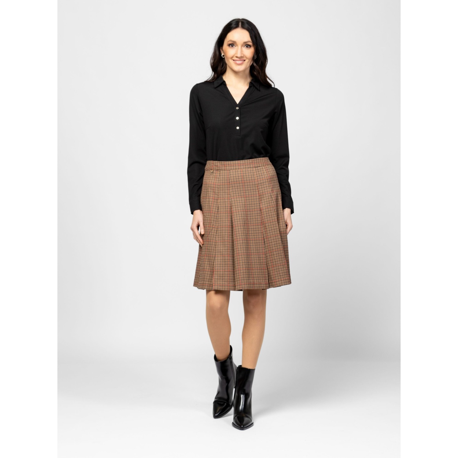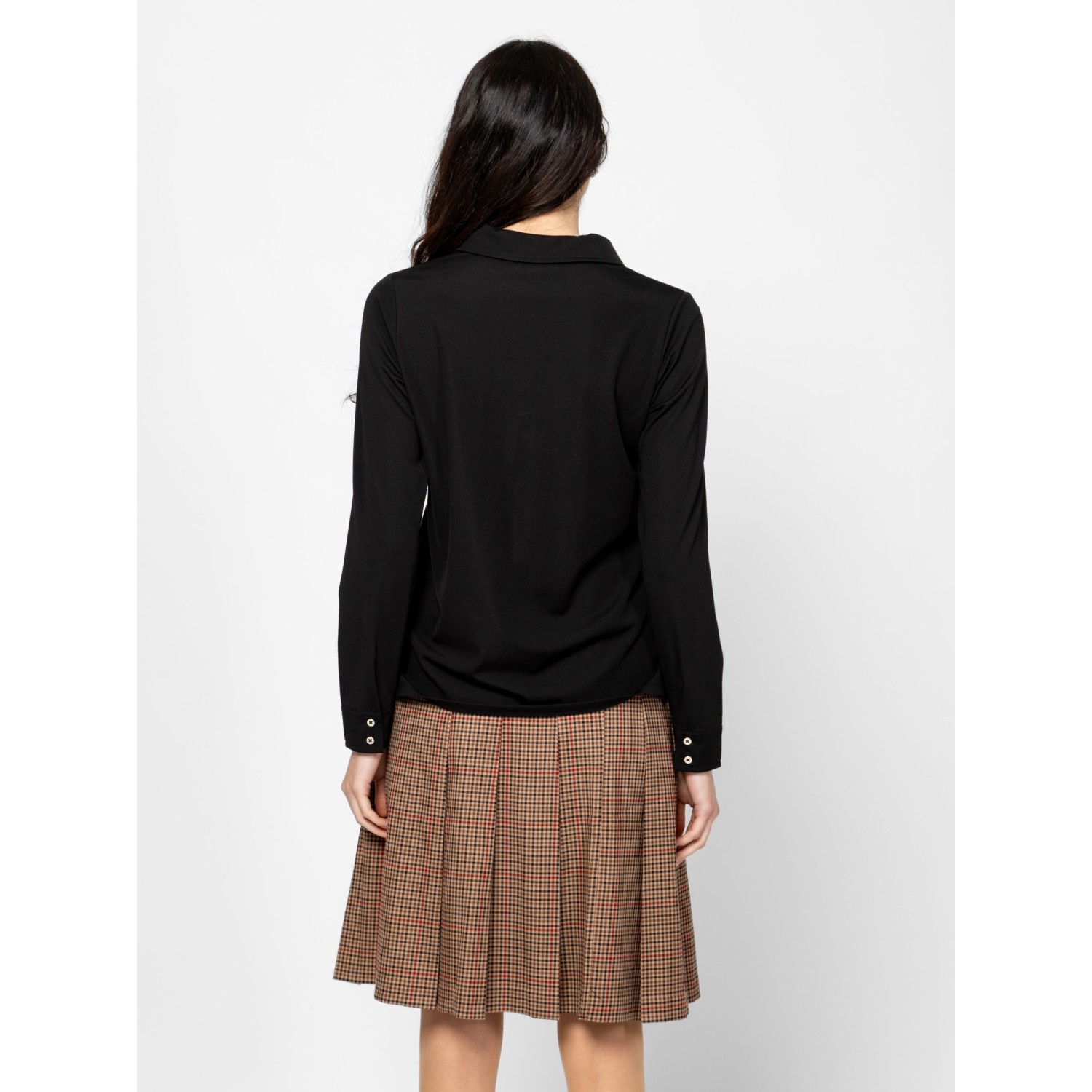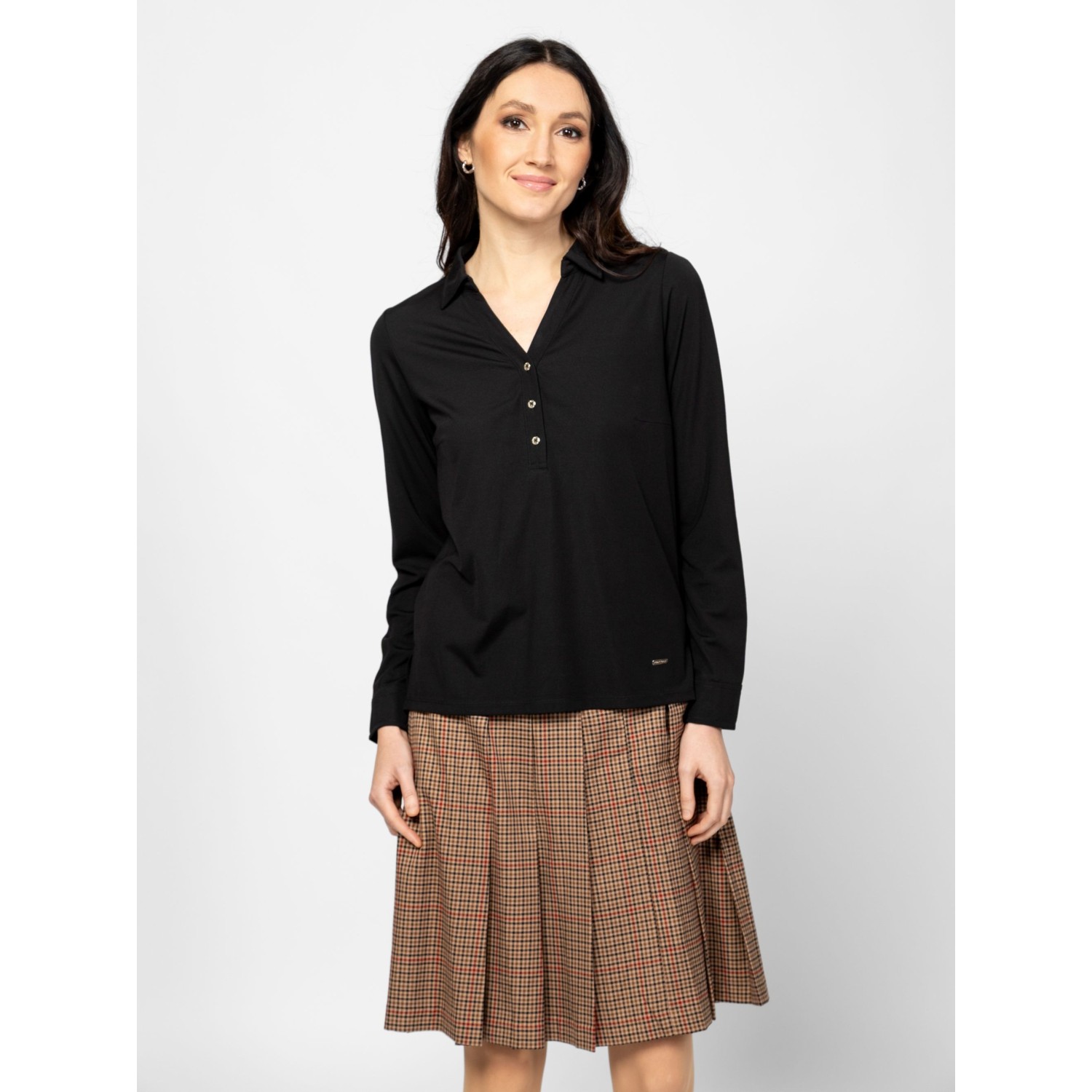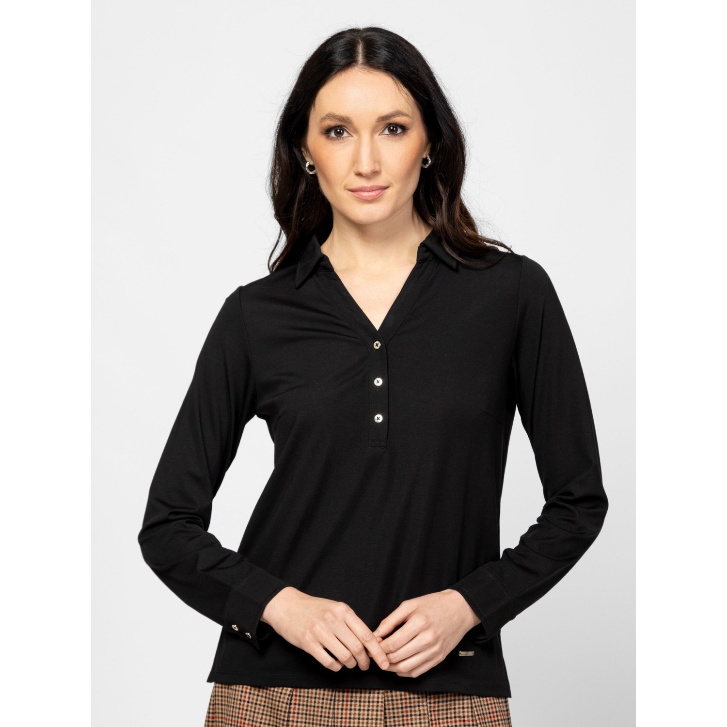 Női blúz, egyenes szabással, galléros-gombos v-nyakkal, gombos kézelővel, könnyen kezelhető elasztikus anyagból, alap színekben, kis fém márkajelzéssel az eleje alján. Anyaga: 60% viszkóz, 35% nylon, 5% elasztán. A modell 175 cm magas és S-es méretet visel.
