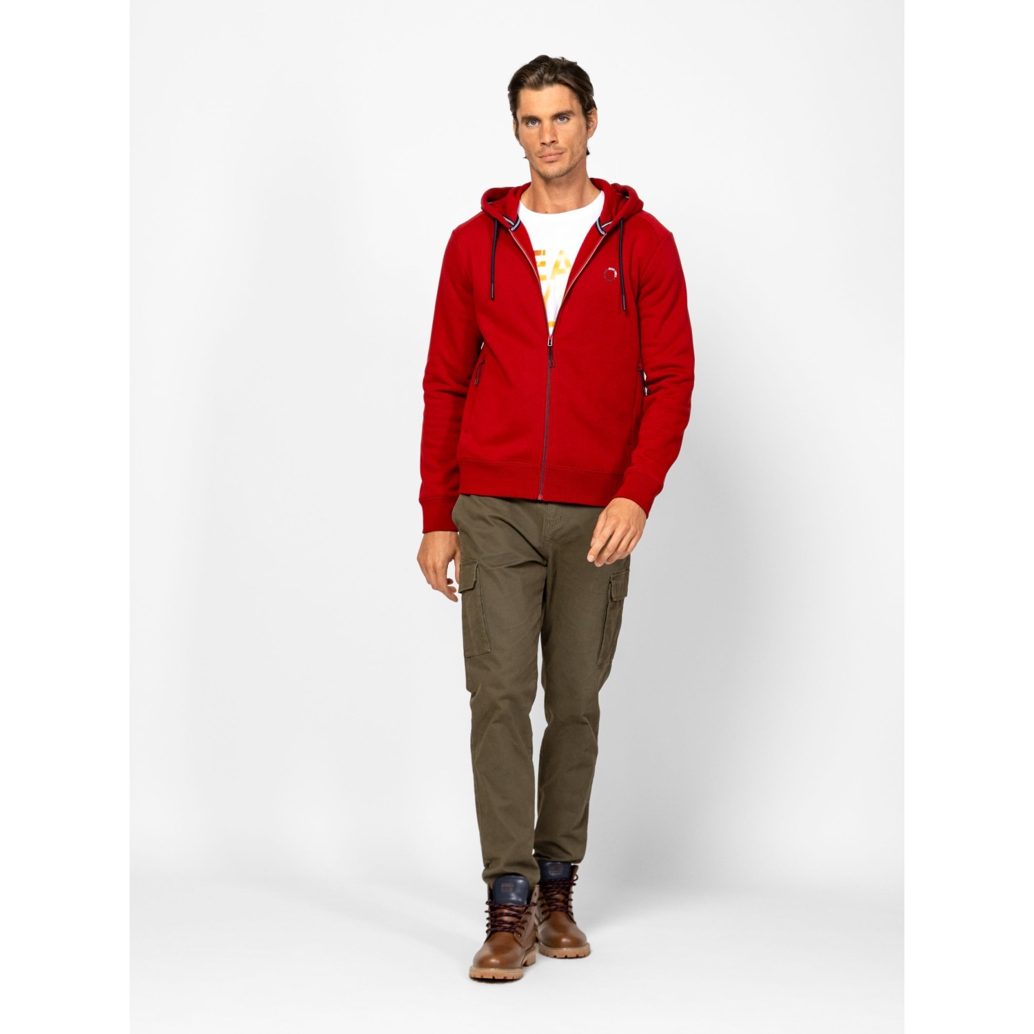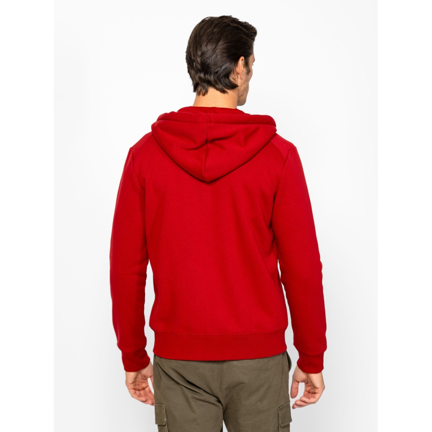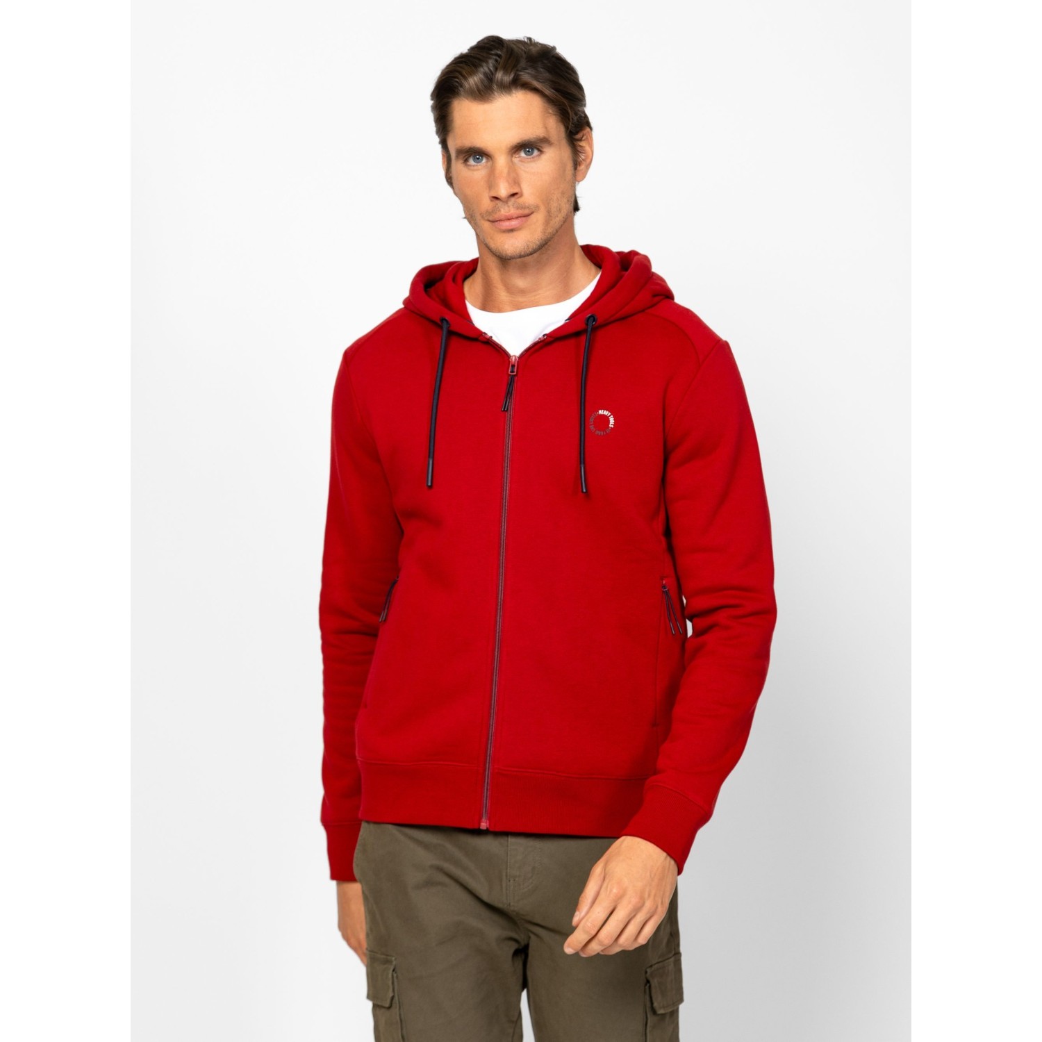 Férfi cipzáros, kapucnis pulóver, sportos szabással, bordás passzés kézelővel és aljjal, szabásvonalba helyezett cipzáros zsebbel, kis nyomott márkajelzéssel az elején. Viseld hozzá ZANON melegítőnadrágunkat az új kollekcióból. Anyaga: 80% pamut, 20% poliészter, belül bolyhozott fleece. A modell 188 cm magas és L-es méretet visel.