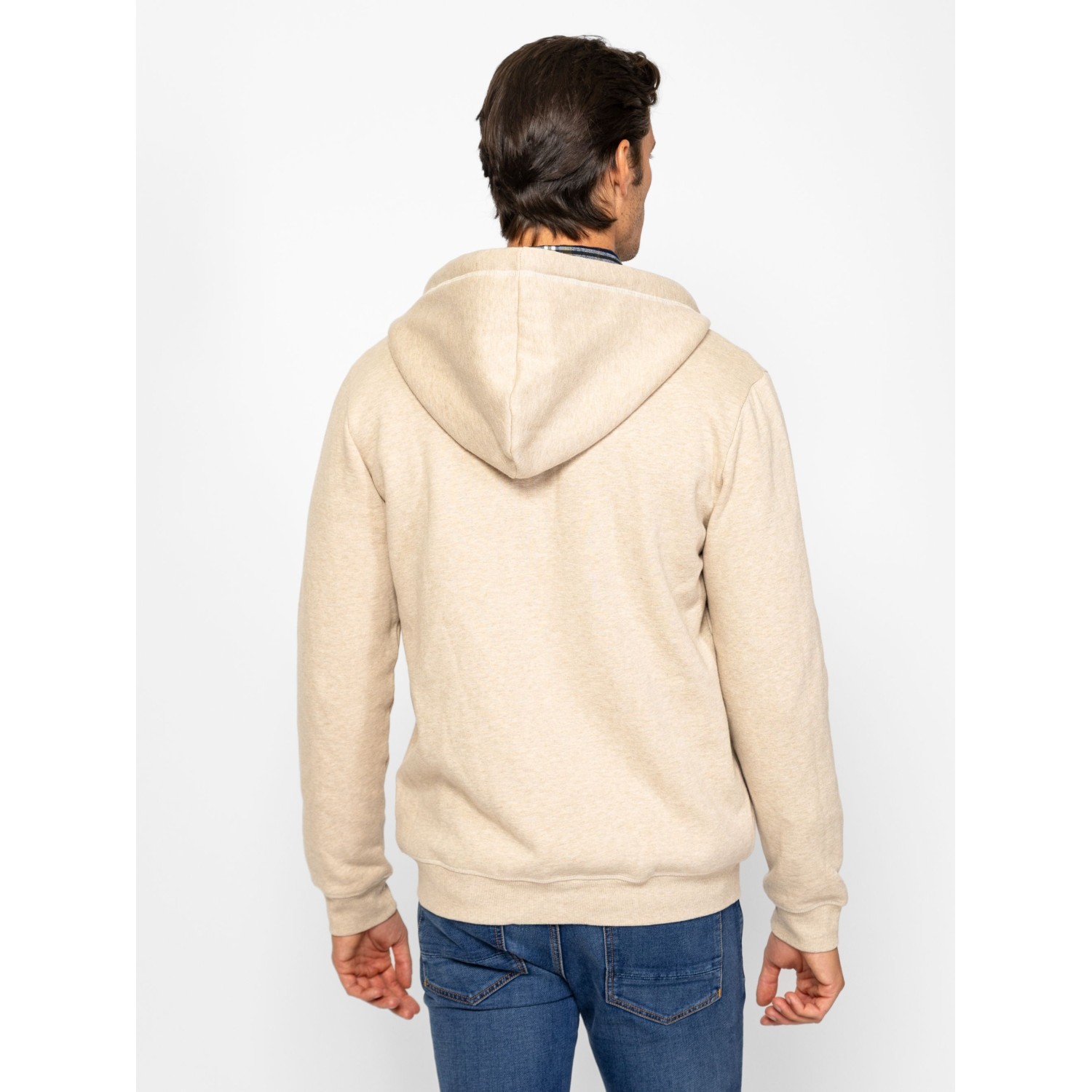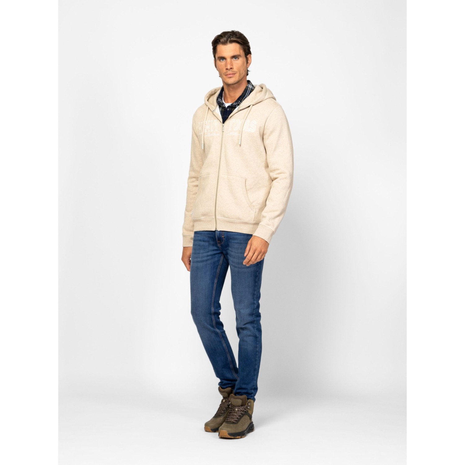 Férfi cipzáros, kapucnis pulóver, klasszikus szabással, kenguruzsebbel, bordás passzés kézelővel és aljjal, elején applikált, hímzett márkajelzéssel, zsebénél kis szövött márkajelzéssel. Anyaga: 57% pamut, 43% poliészter, belül bolyhozott fleece. A modell 188 cm magas és L-es méretet visel.