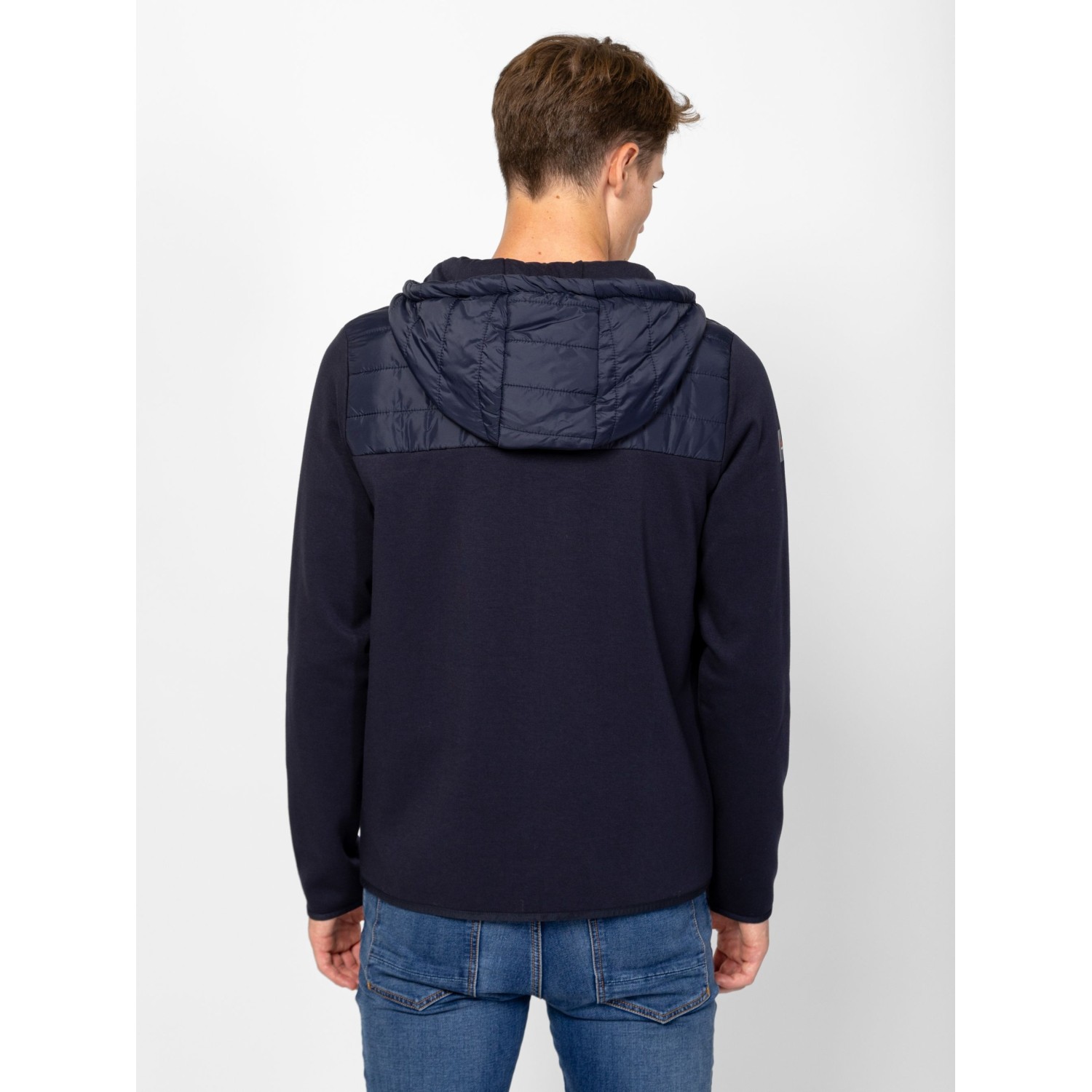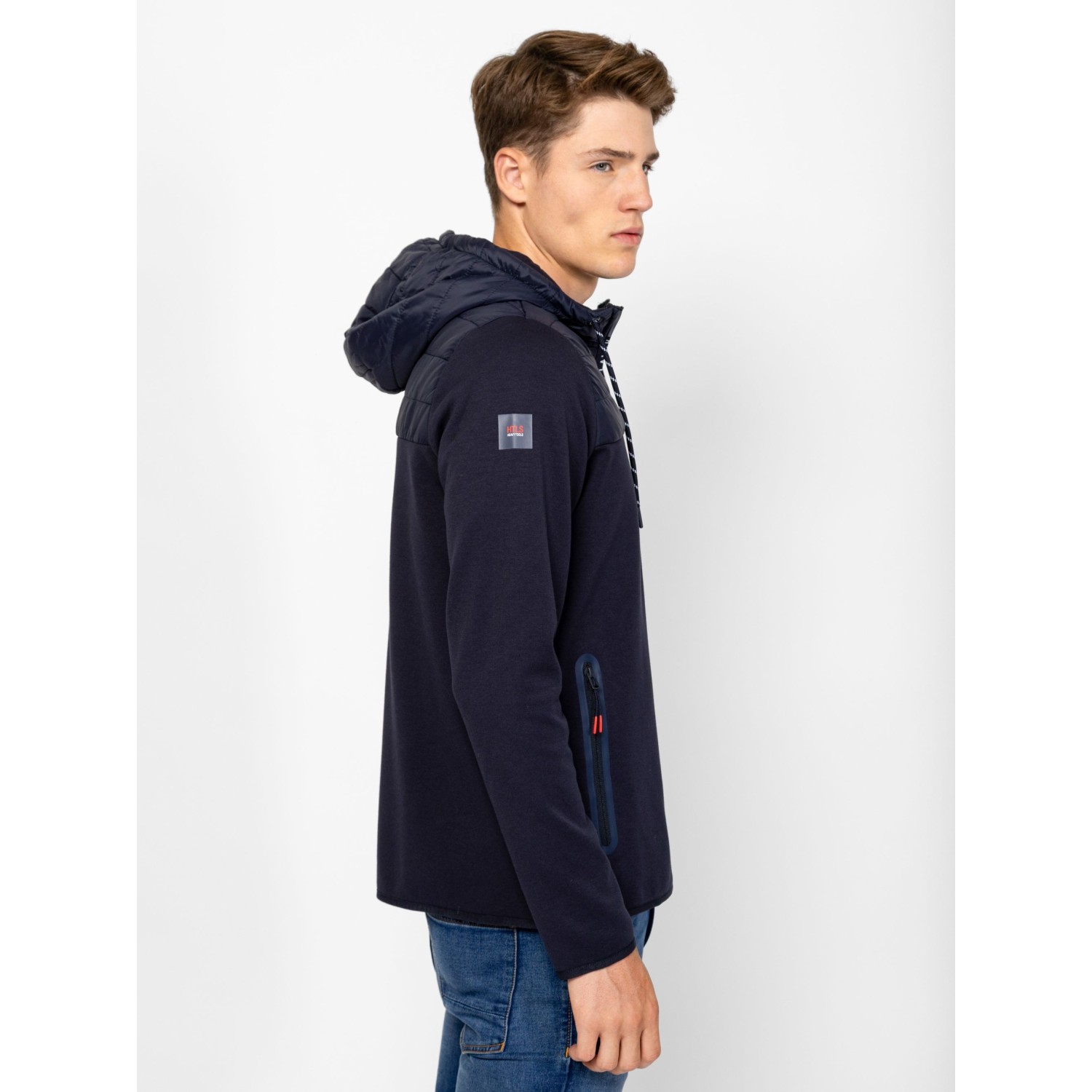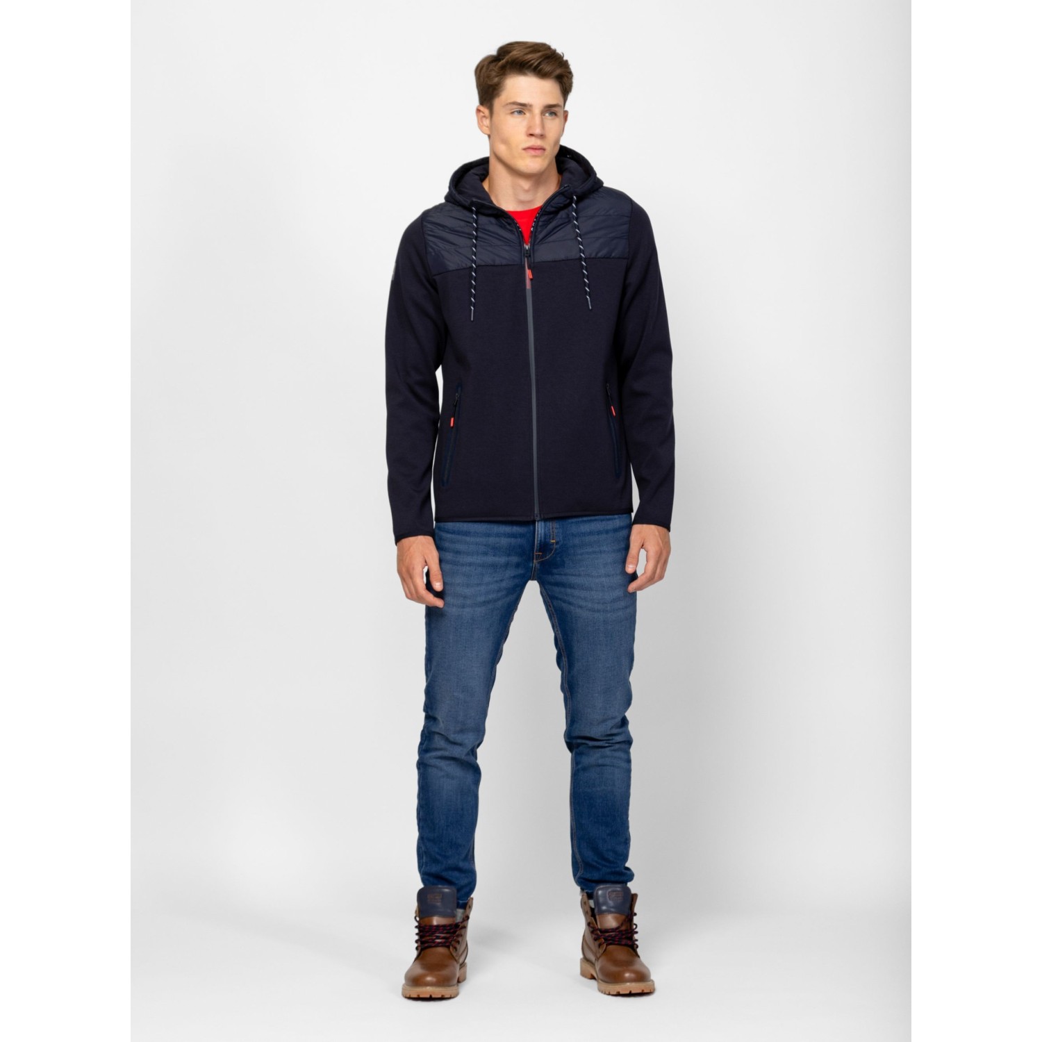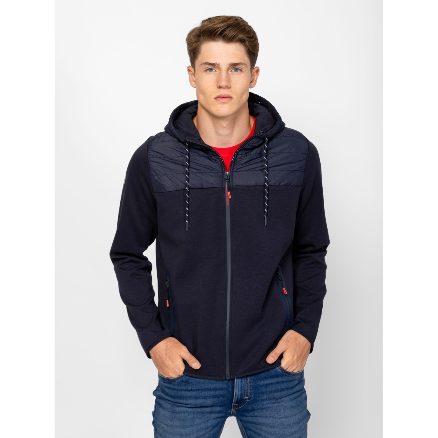 Férfi cipzáros, kapucnis pulóver fleece és steppelt részletekkel, egyenes, kényelmes szabással, cipzáros zsebekkel, ujján kis márkajelzéssel. Anyaga: eleje és háta: 76% pamut, 19% poliészter, 5% elasztán, kapucni, eleje és háta váll rész: 100% nylon lightweight. A modell 188 cm magas és L-es méretet visel.
