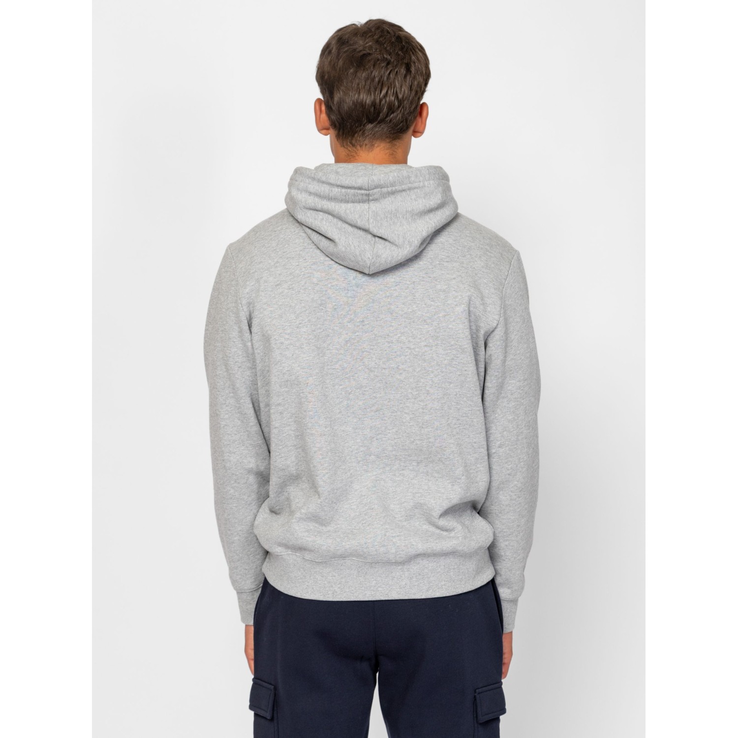 Férfi bebújós, kapucnis pulóver, sportos szabással, kenguruzsebbel, bordás passzés kézelővel és aljjal, nyomott márkajelzéssel az elején, zsebén szövött címkével. Anyaga: 80% pamut, 20% poliészter, belül bolyhozott fleece. A modell 188 cm magas és L-es méretet visel.
